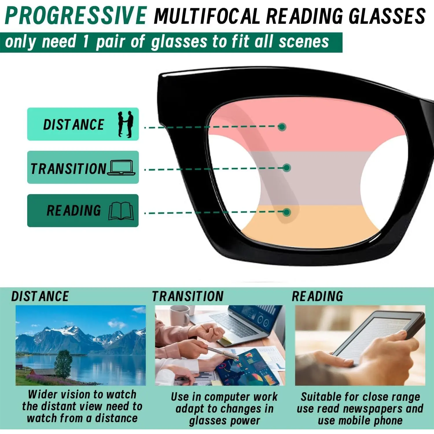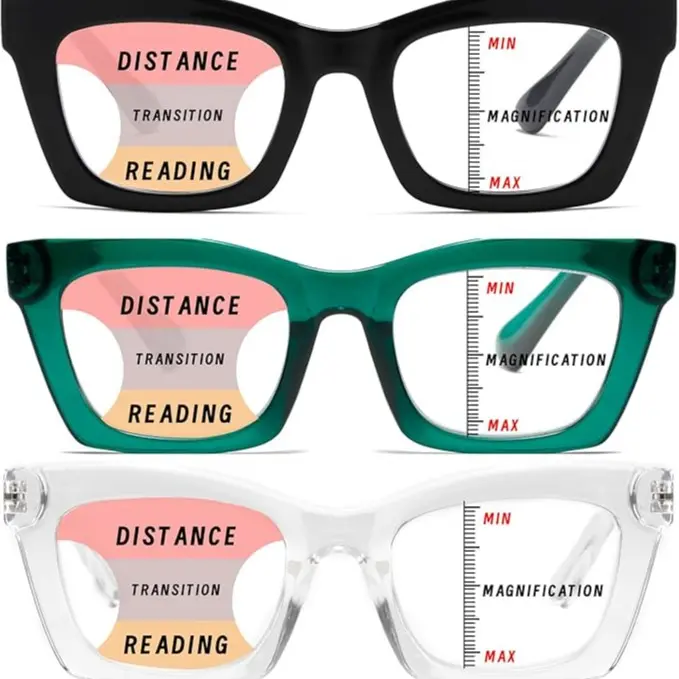 Progressive multifocus glasses for all your need.The bottom part of the lens is full-power magnification, then used for nearly distance reading.The middle part is slightly reduced power magnification for working on computer, watching TV, etc.Top part is half-power magnification for walking, shopping and so on.It means that you can wear the glasses anytime and anywhere.