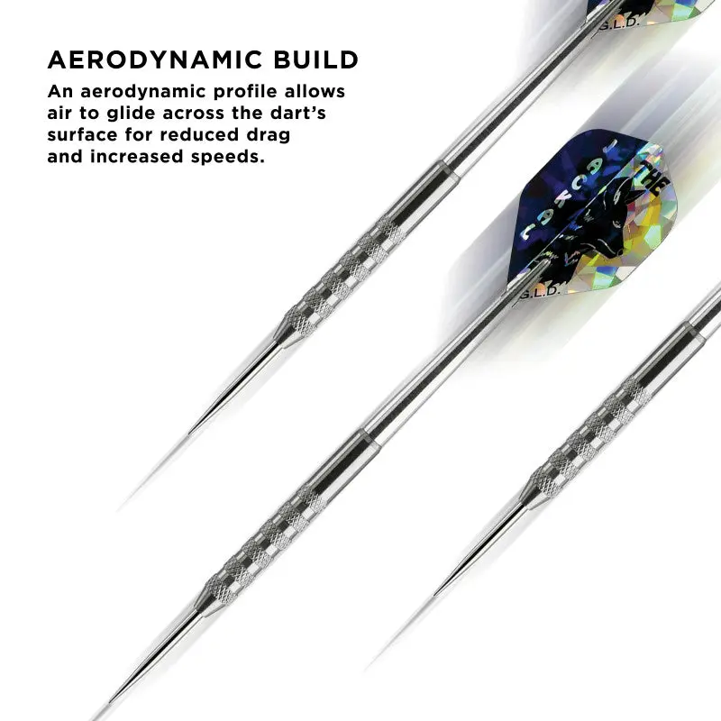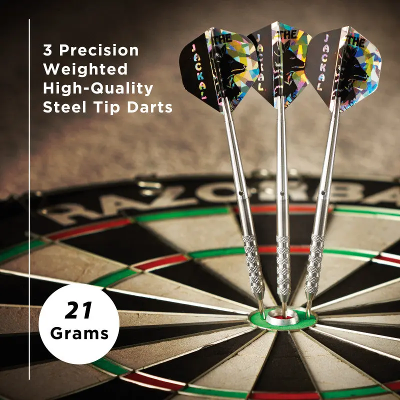 Track down your prey and secure the kill with the Viper Jackal Steel Tip Darts designed for use with sisal dart boards. These darts are packed with features starting with the barrel, fashioned from 80% Tungsten and 20% Nickel. Tungsten is a very dense metal, able to create slimmer darts with the same weight as lighter metals; this allows for tighter shot groupings without sacrificing control, increasing your scores. Tungsten is a sign of quality and durability as well because of its density. A higher tungsten content will produce a slimmer dart profile than one with less. More tungsten in the dart increases the price as tungsten is a rare metal and its density takes more effort to machine. The increased price gives a higher quality barrel and can improve performance, increasing scores. Each sleek, aerodynamic, barrel enjoys knurled bands, allowing your grip to remain consistent throw after throw. The Jackal Darts feature tough, lightweight Silver Aluminum Shafts, unique to the Jackal Darts. These shafts feature locking holes that allow a more secure fit to your barrel; you won’t find yourself retightening these shafts after a shot or two. These sleek darts are finished off with savage Jackal graphics on each wide glide flight. Each set includes six wide glide flights, three Silver Aluminum shafts, and a flexible holster dart case. The holster case is the perfect solution to transporting your darts without flattening your flights, giving them a much longer lifespan, and ensuring that your darts are ready to throw when you need them.