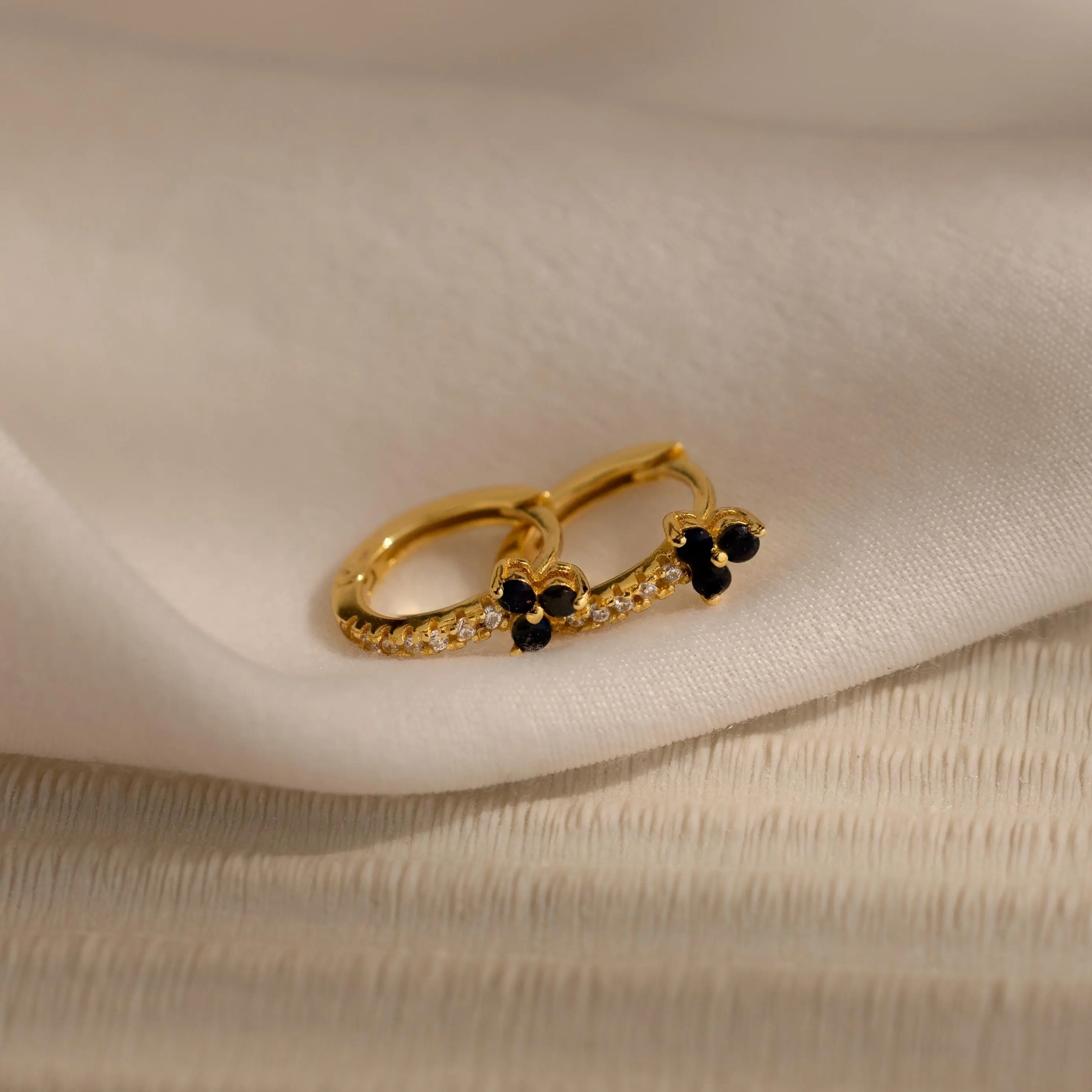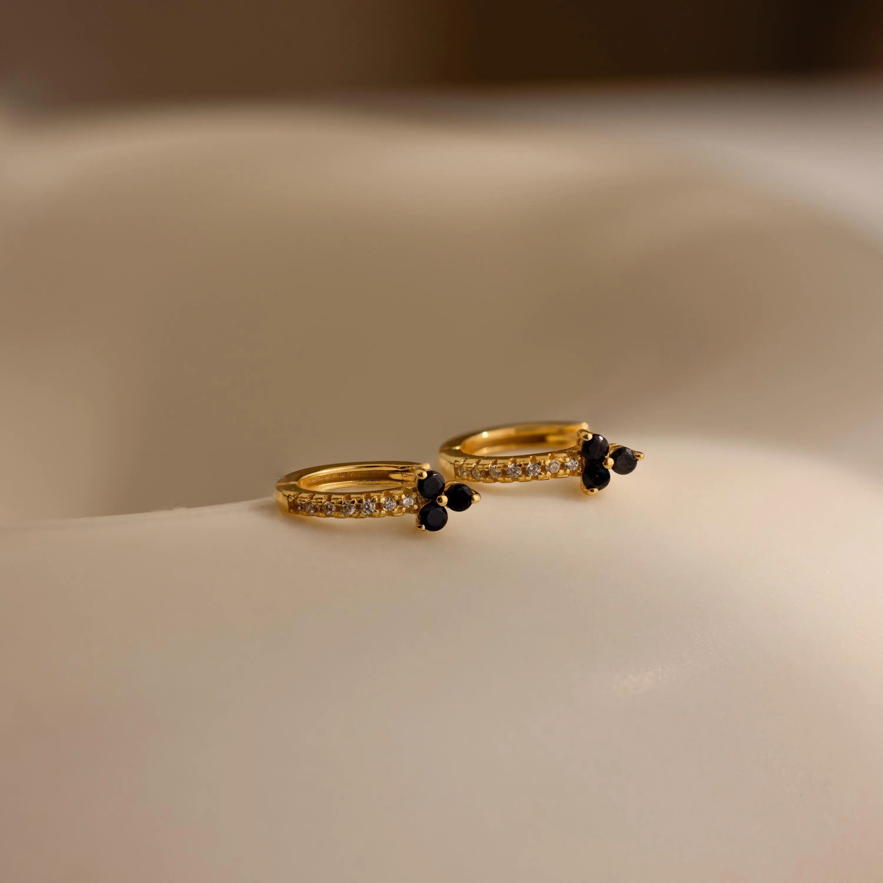 Elevate your style with our Onyx Lily Huggies, featuring sleek black onyx gemstones set in a delicate clover shape. Perfect for those looking to bring a little fortune and sophistication to their everyday look, these dainty hoops are a stylish addition to any jewelry collection ♡