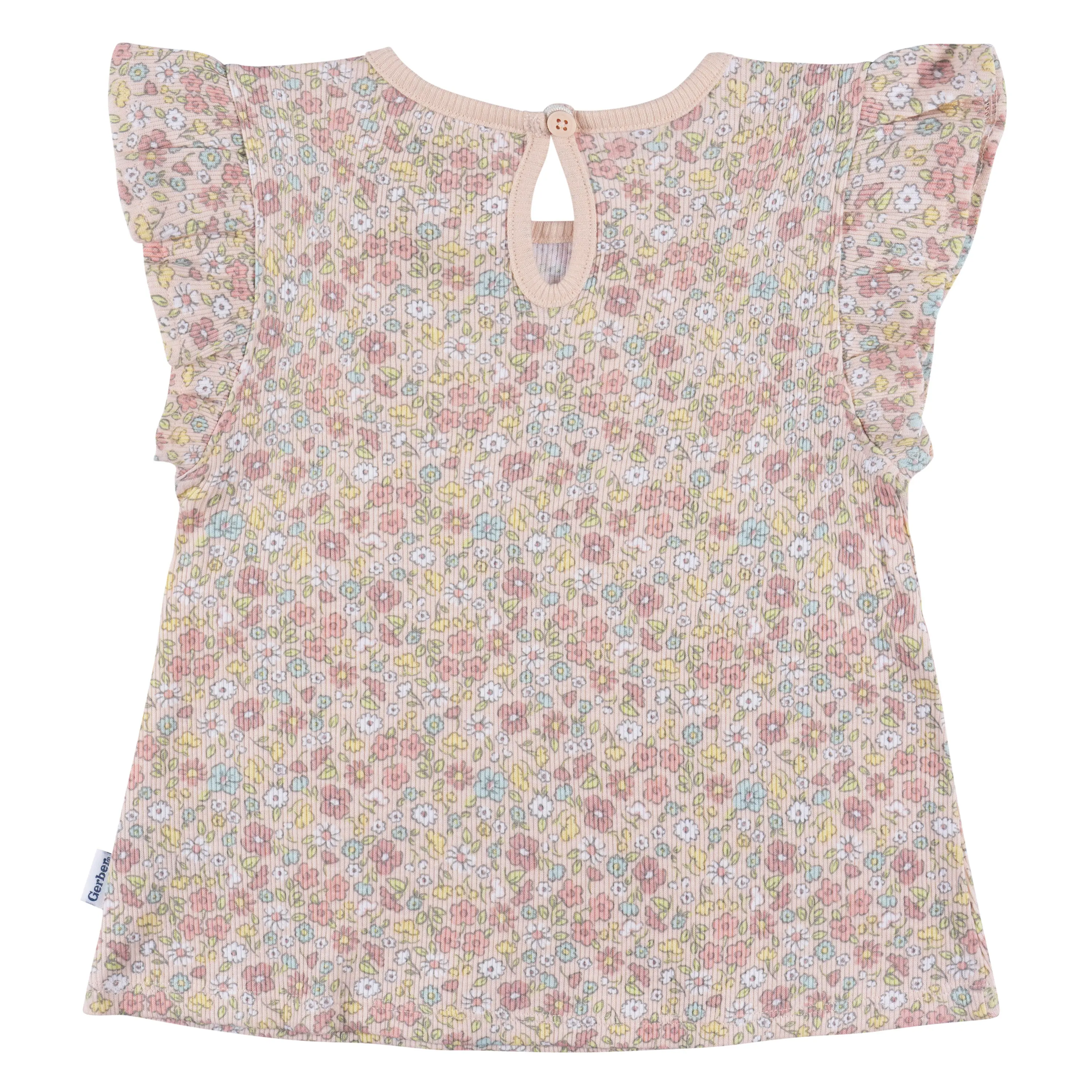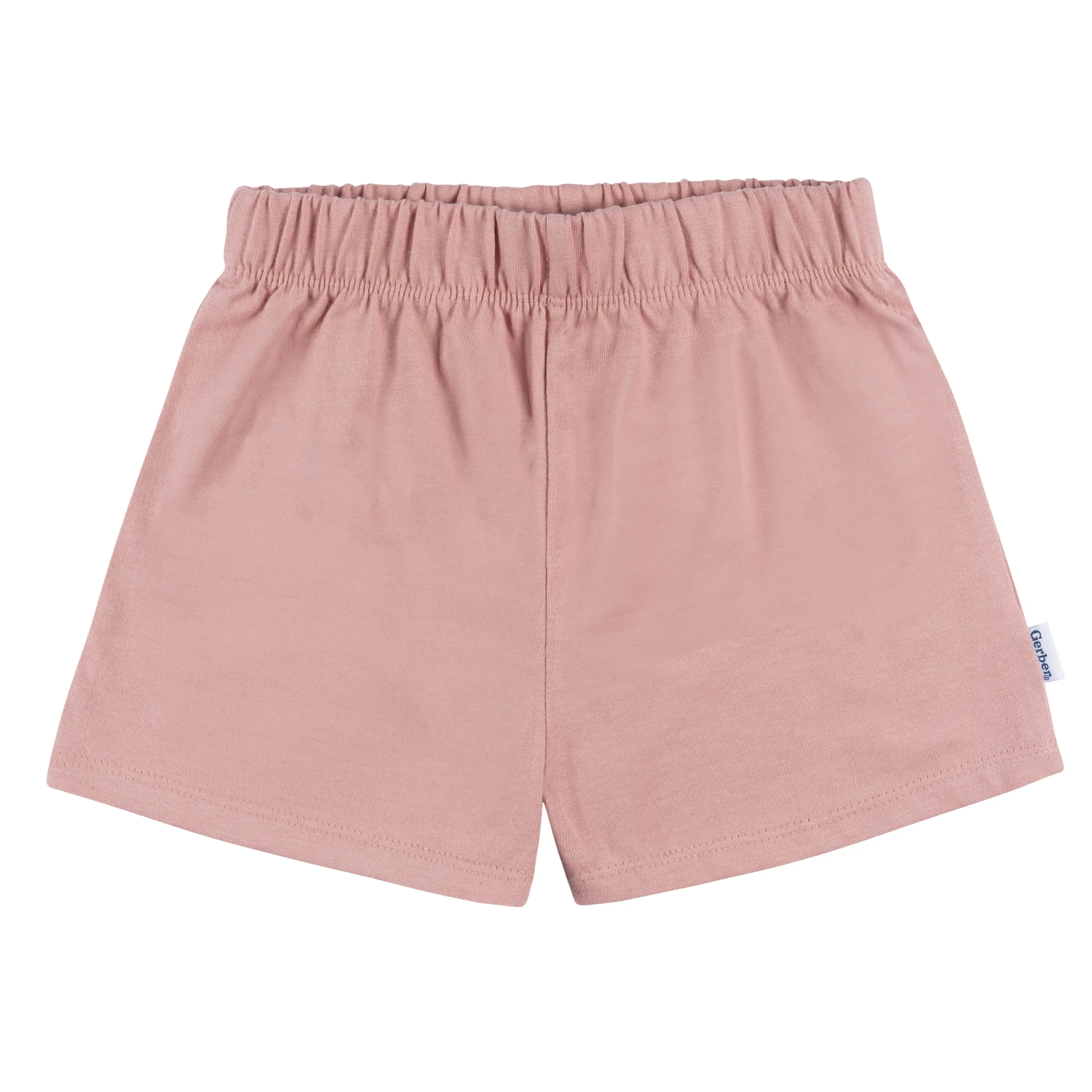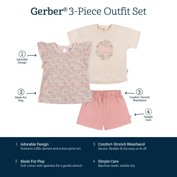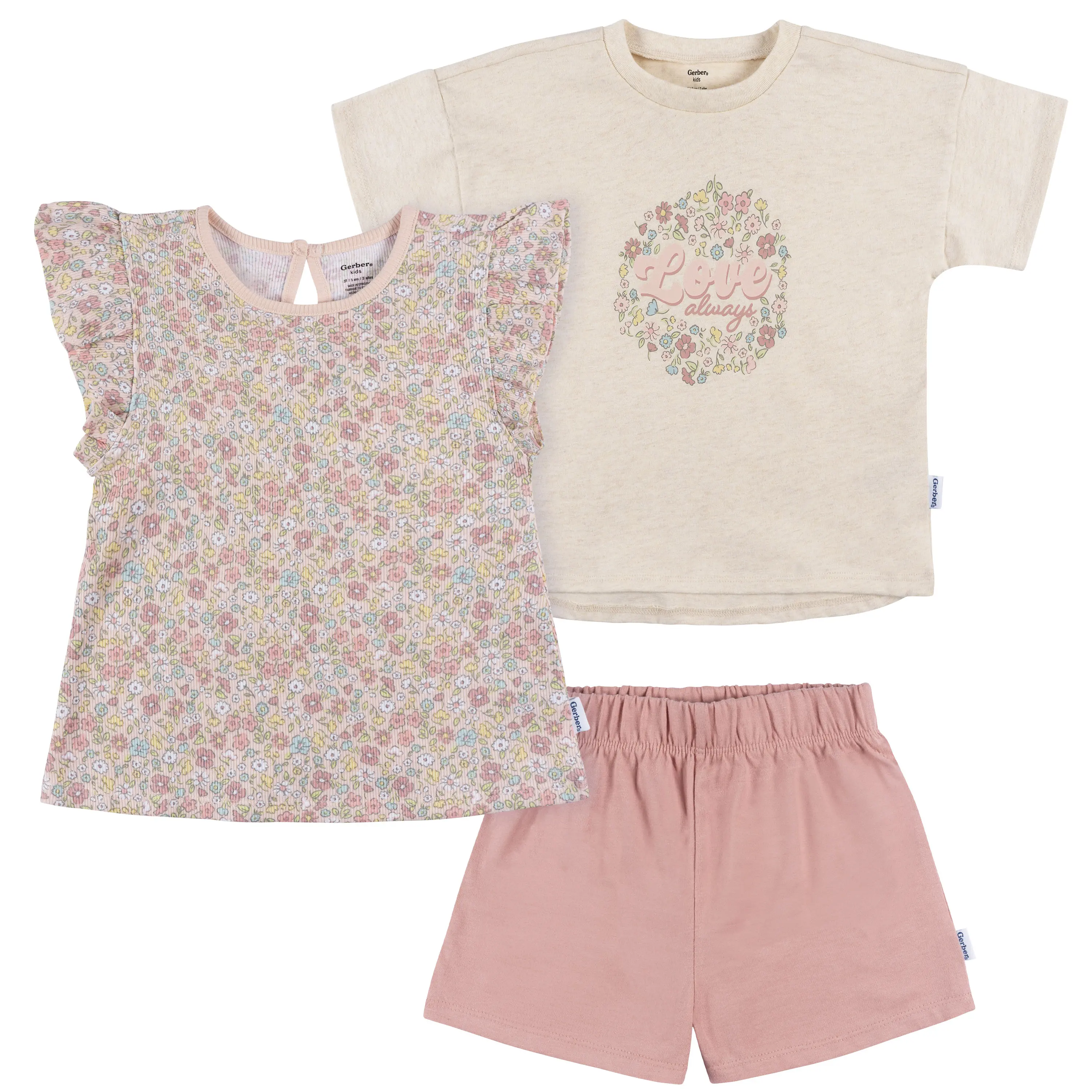 Gerber Toddler Girls' 3-Piece Shirt and Shorts Set, 1 Flutter Sleeve Shirt, 1 Short Sleeve Shirt and 1 Coordinating Short, 100% Comfortable Cotton