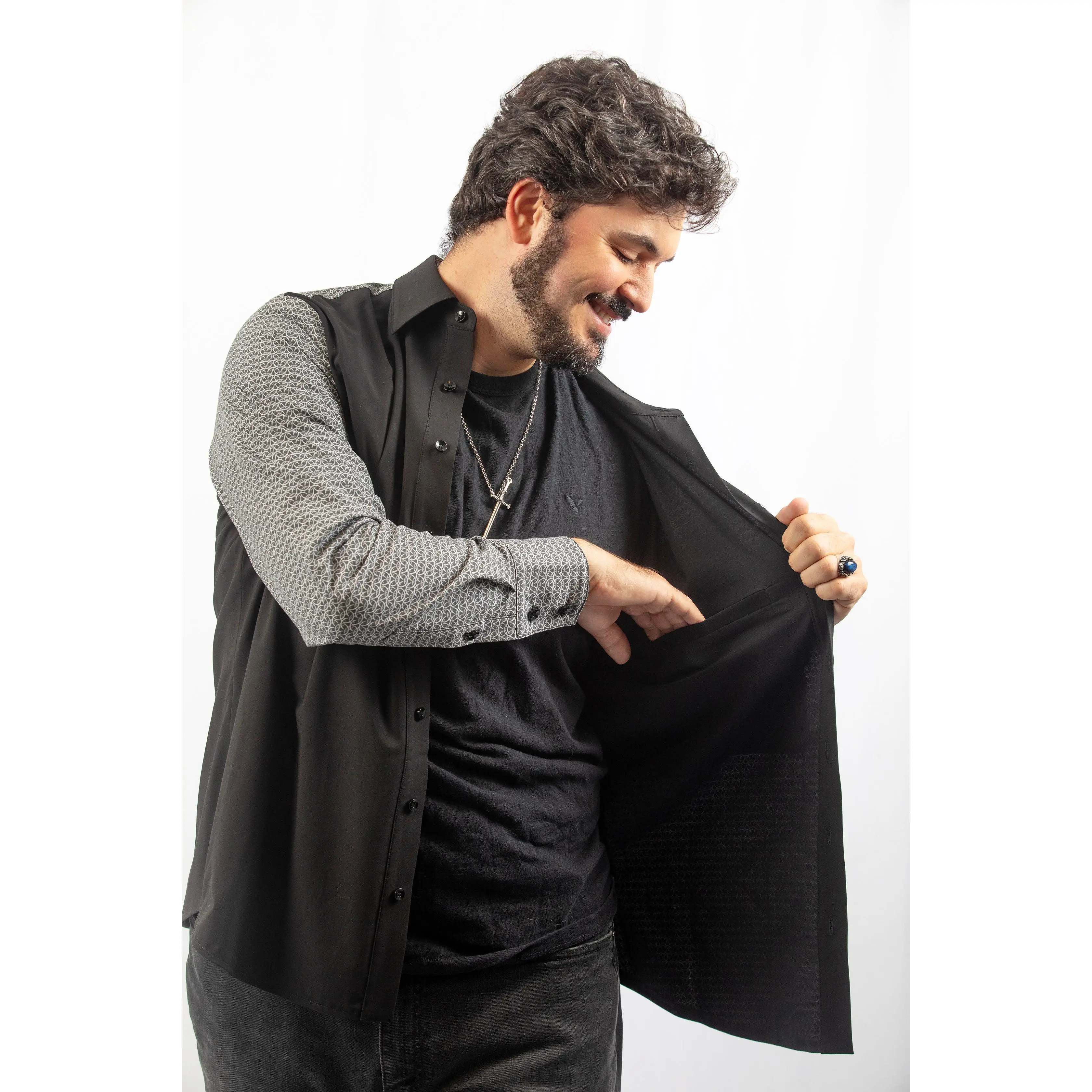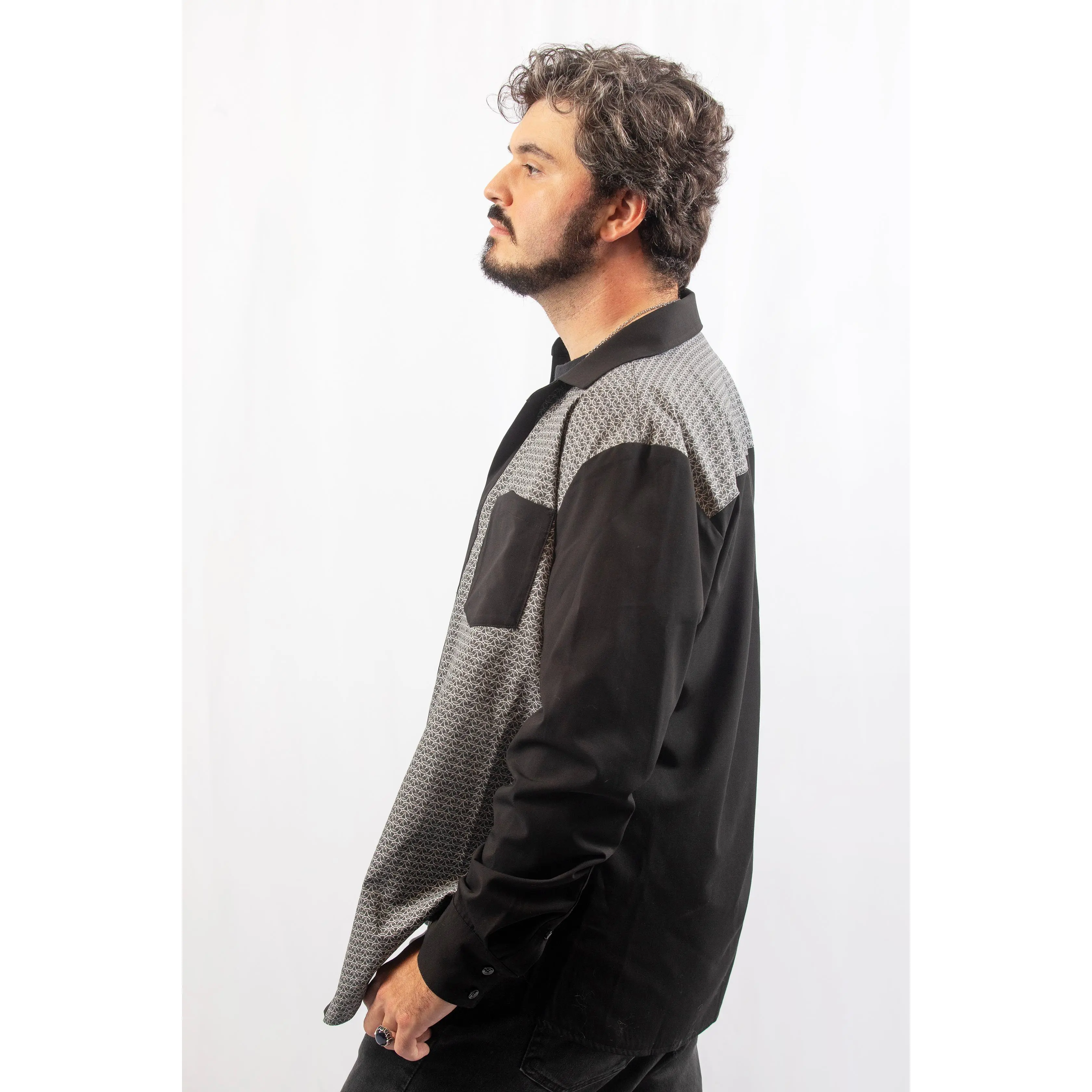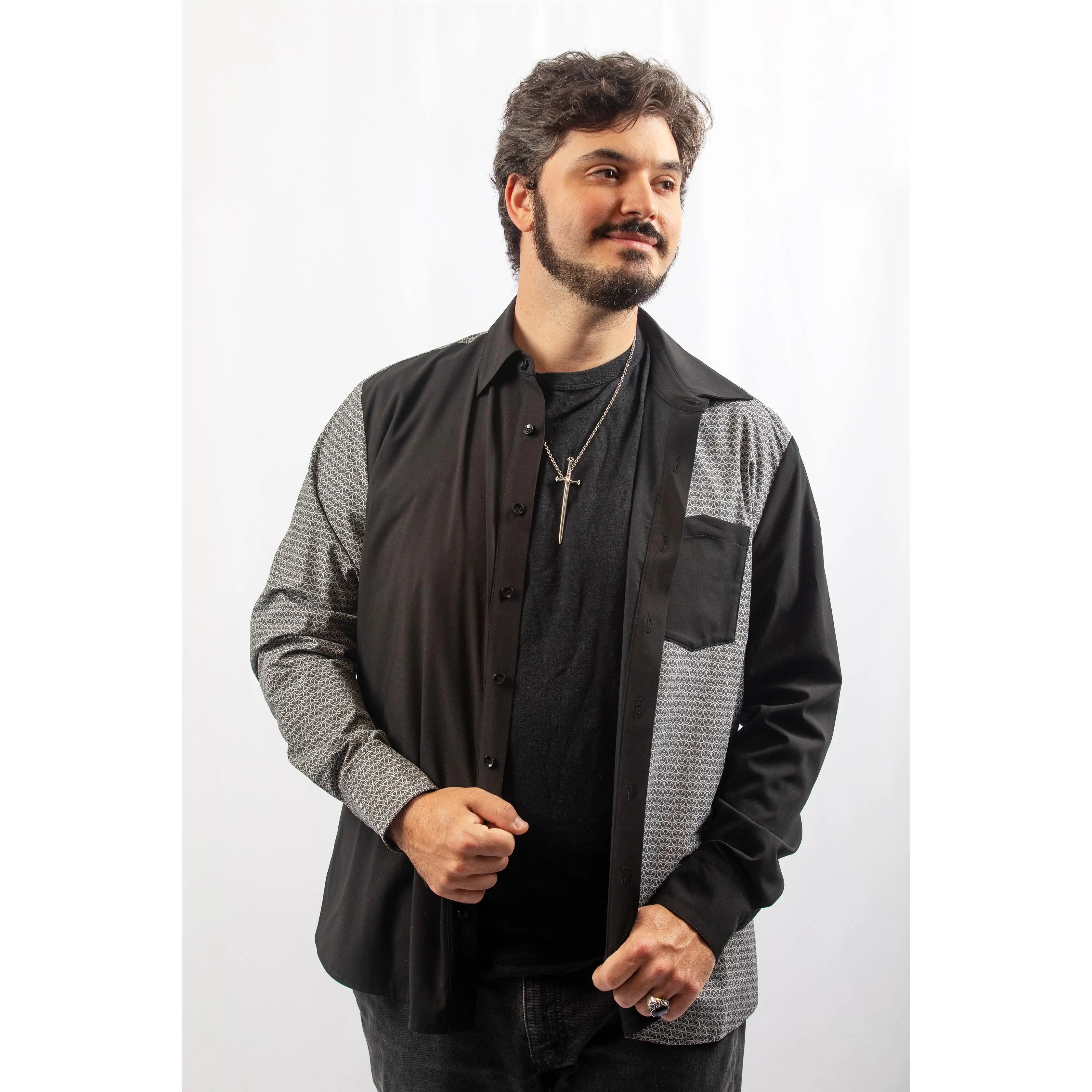 Be bold and daring with our Chainmail Classic Button-Up! Made with a bamboo, polyester, and spandex blend, this shirt features a striking chainmail print and color blocked design. Keep your personal items safe and secure with the shield-shaped chest pocket and side pockets on both sides. Take on any adventure in style!