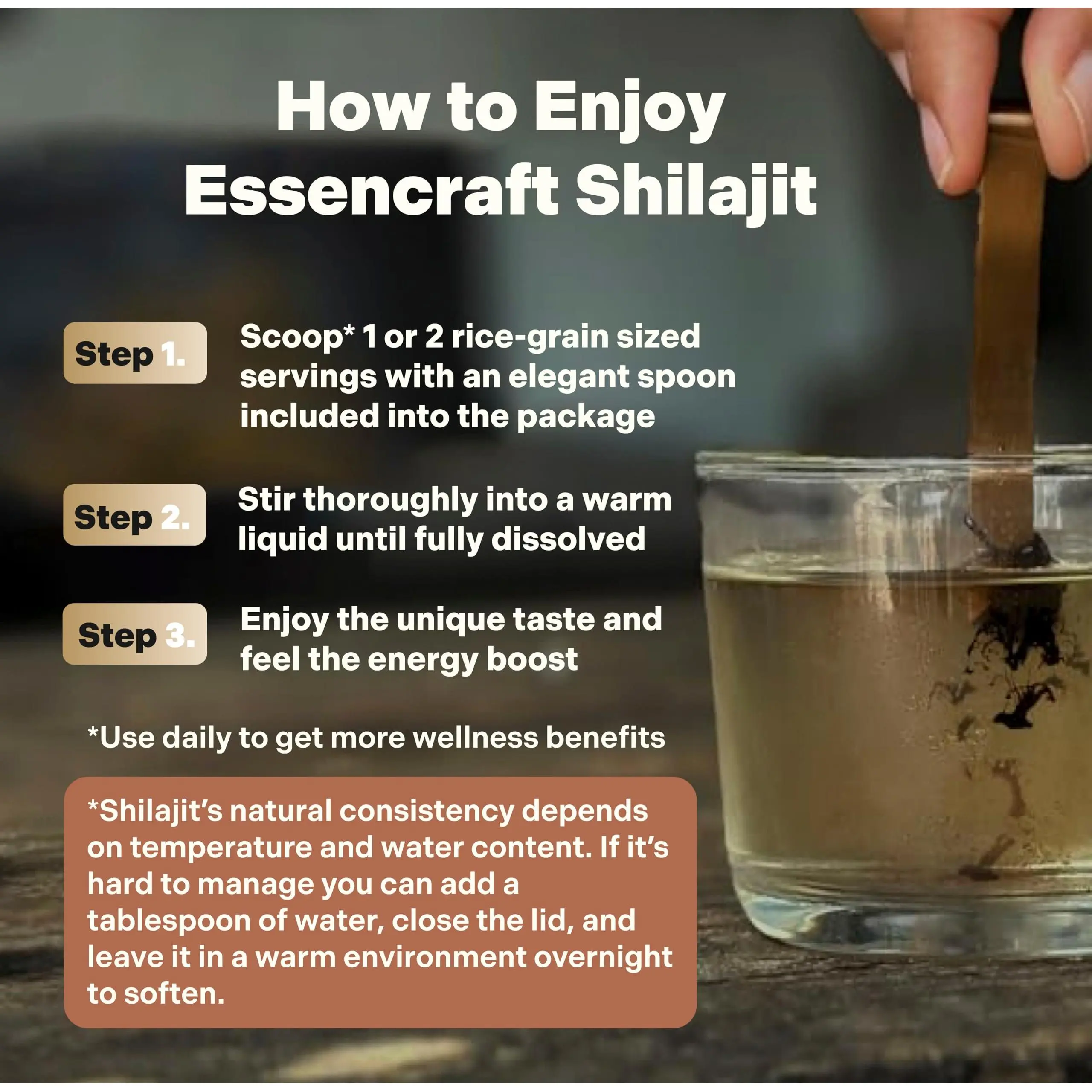 Essencraft Pure Himalayan Shilajit Resin is harvested at over 18,000 feet in the Ladakh region of the Indian Himalayas, ensuring unmatched purity and potency. This organic shilajit resin is rich in 85+ trace minerals, fulvic acid, and humic acid, which are known for promoting mental clarity, memory, and cognitive function. Renowned for its adaptogenic properties, this natural shilajit helps build stress resistance, supports longevity, and fights free radicals. It enhances mineral absorption, boosts the immune system, and supports energy levels and digestion. Ideal for men and women, our shilajit can be a part of your daily health routine. With 500mg of premium shilajit per serving, Essencraft offers a high potency supplement. Our non-chemical extraction process ensures the shilajit is free from fillers, additives, and heavy metals, preserving all the beneficial properties of raw shilajit. This pure Himalayan shilajit resin is the gold standard for natural supplements, providing immune support, energy, and cognitive performance.