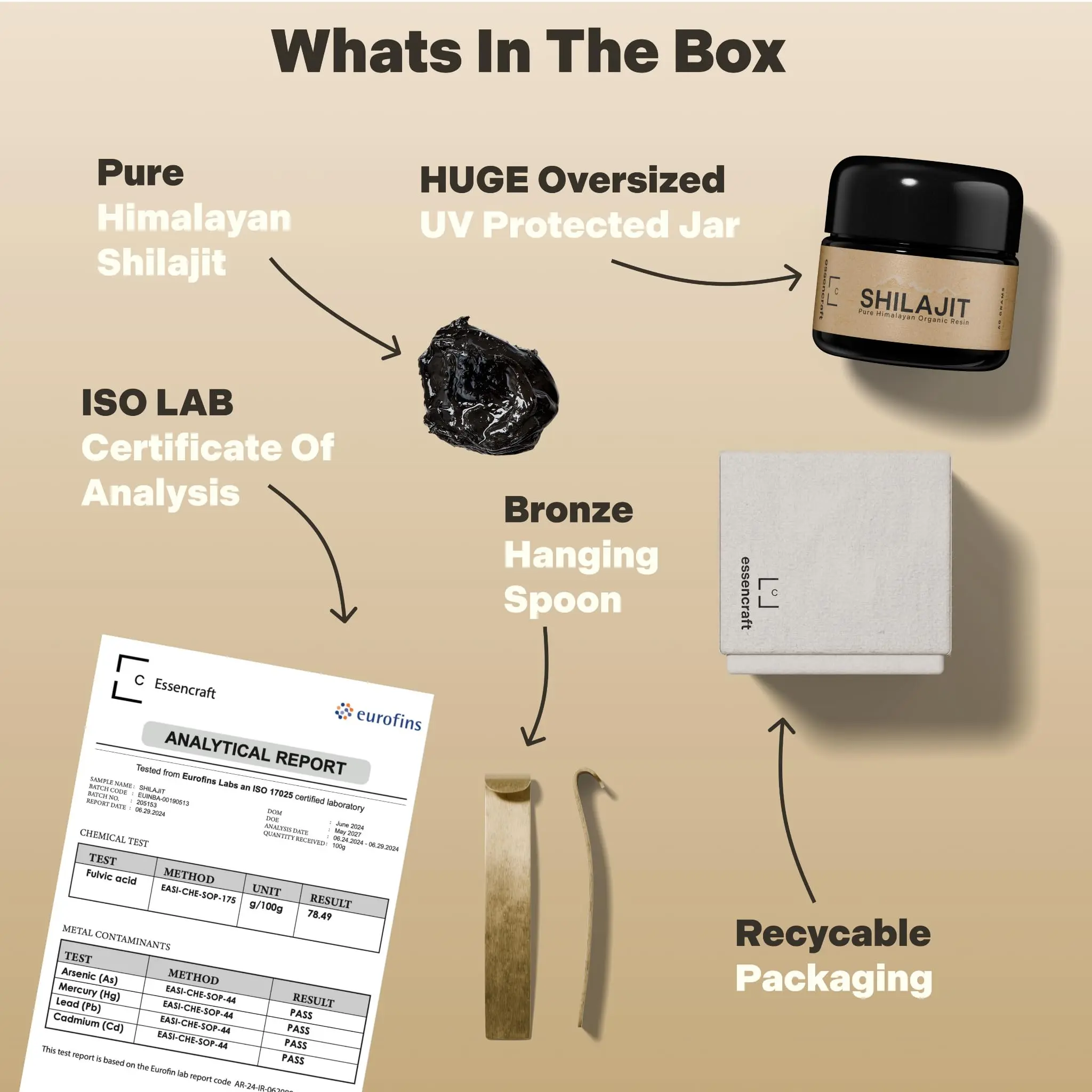 Gold Standard Purity: Each serving delivers 500mg of premium shilajit. Essencraft’s non-chemical extraction process ensures a pure, potent supplement free from heavy metals, fillers, and additives, making it safe and effective for daily use.