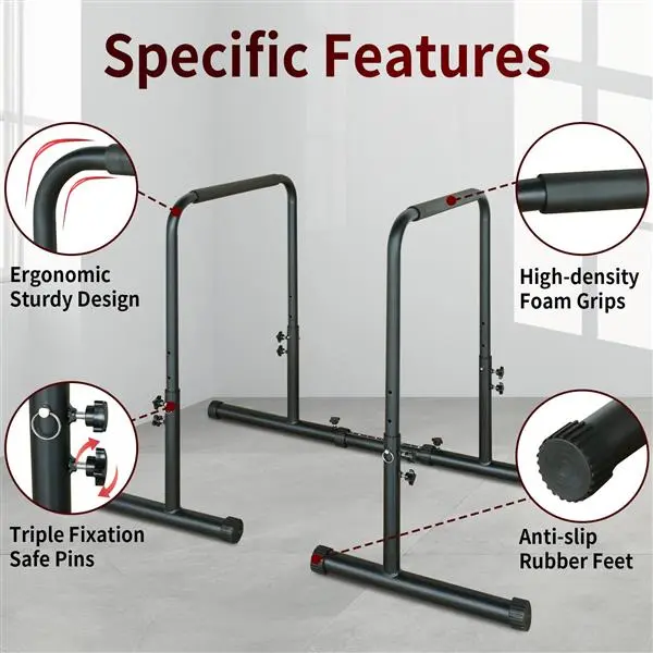 550 LBS Loading Capacity:The dip bars are constructed from high-density steel to provide long-term stability and easily support users up to 550 lbs, keeping you in better shape for longer workouts.