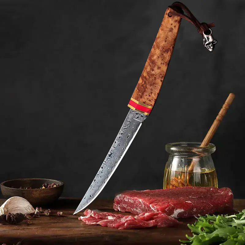 High quality Damascus steel kitchen steak knife with wooden sheath suitable for home kitchen camping barbecue, creative gift for men