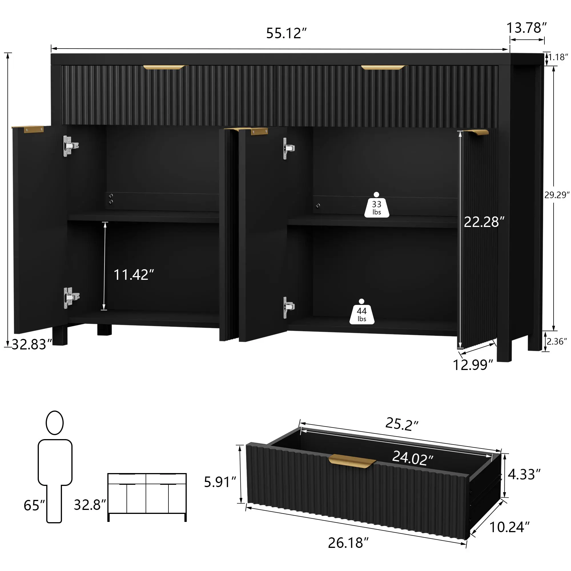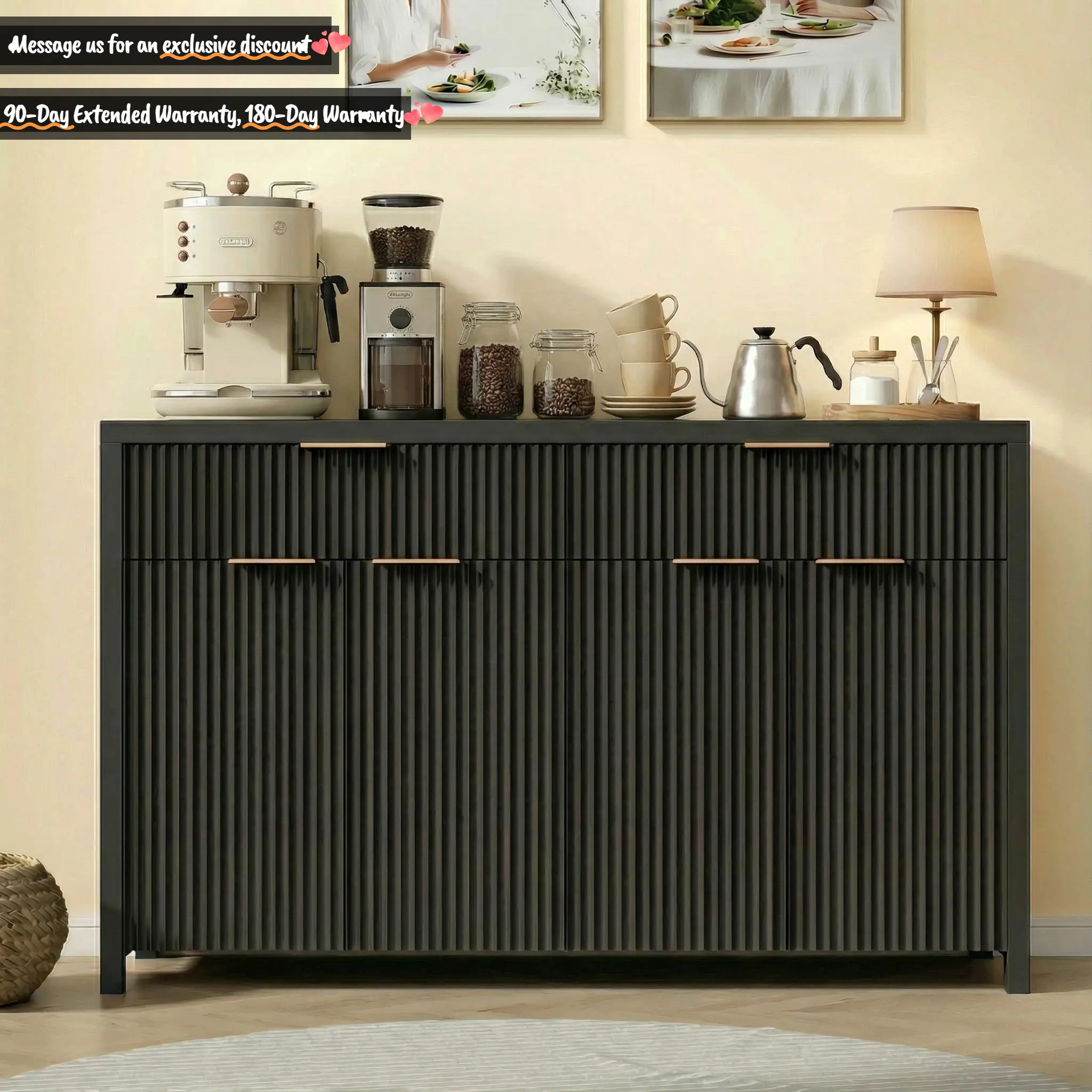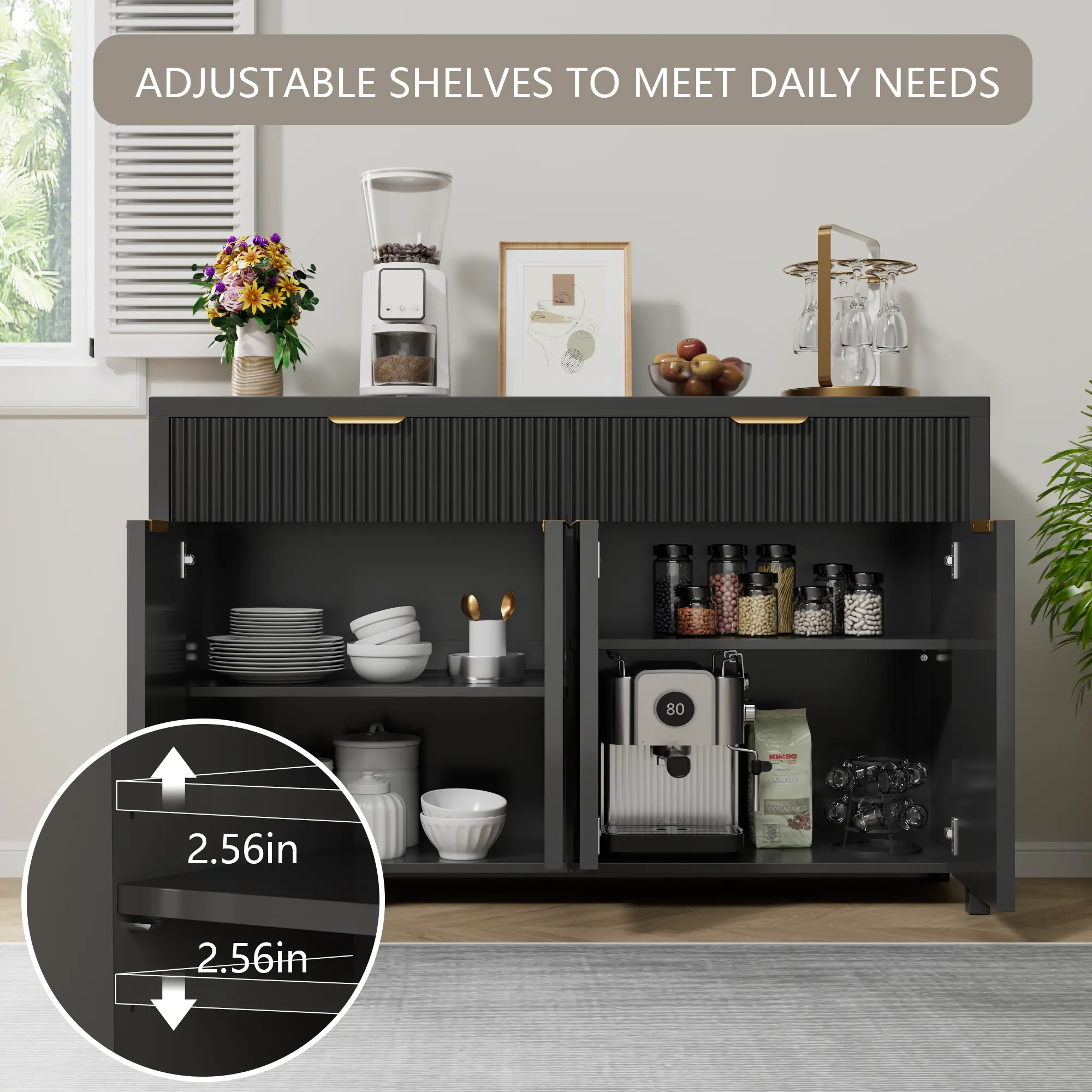 55.12" wide with 2 smooth-glide drawers and 4-door storage, easily organizing dishes, bottles, small appliances, and daily essentials.