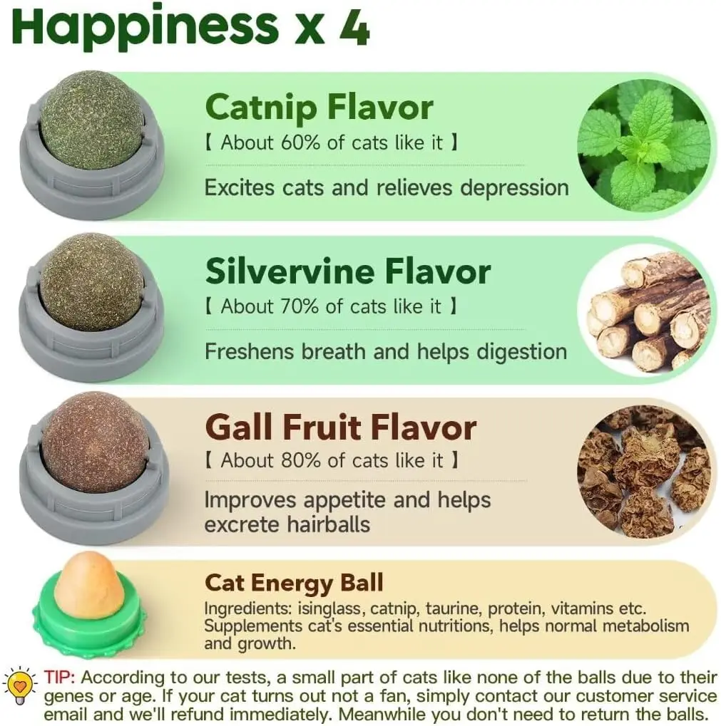 ·100% Natural and Non-toxic: the catnip balls are made of pure natural plant extracts, no chemical additives contained. Rest assured this toy is no harm to your favorite kitty. Includes 4 different flavors: “catnip”, “silvervine”, “the fruit of silvervine” and "cat energy ball" that conspire to arouse your cat’s interest to lick and play