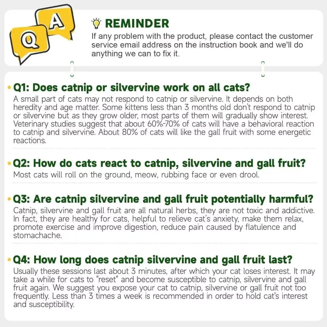 ·Keep Cats Entertained: Catmint and silvervine are effective attractants to get lounging cats up and moving. The cat energy ball promotes cat's metabolism and stimulates growth