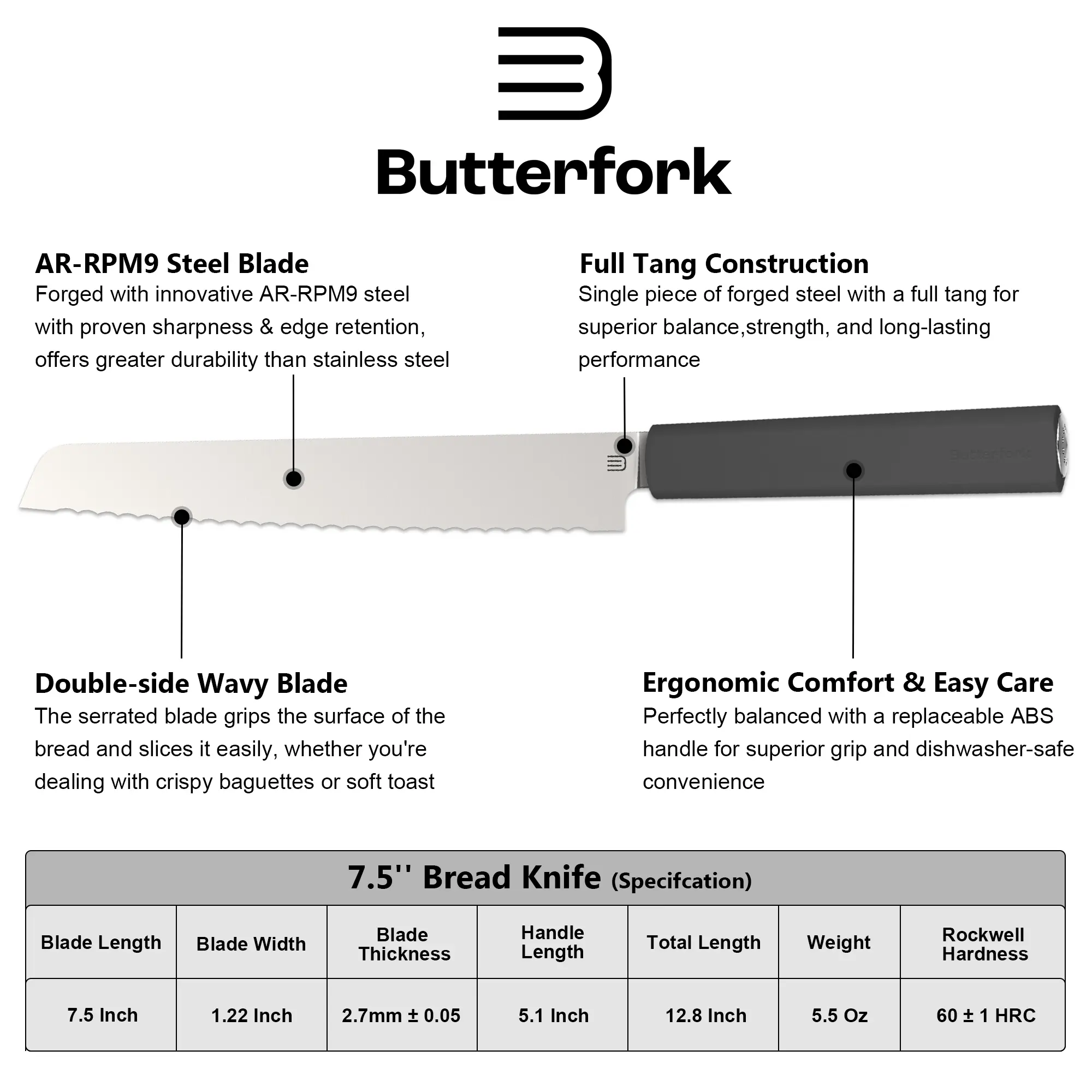 Butterfork Purest 8” Bread Knife, AR-RPM9 Stainless Steel, Replaceable ABS Handle, Dark Grey