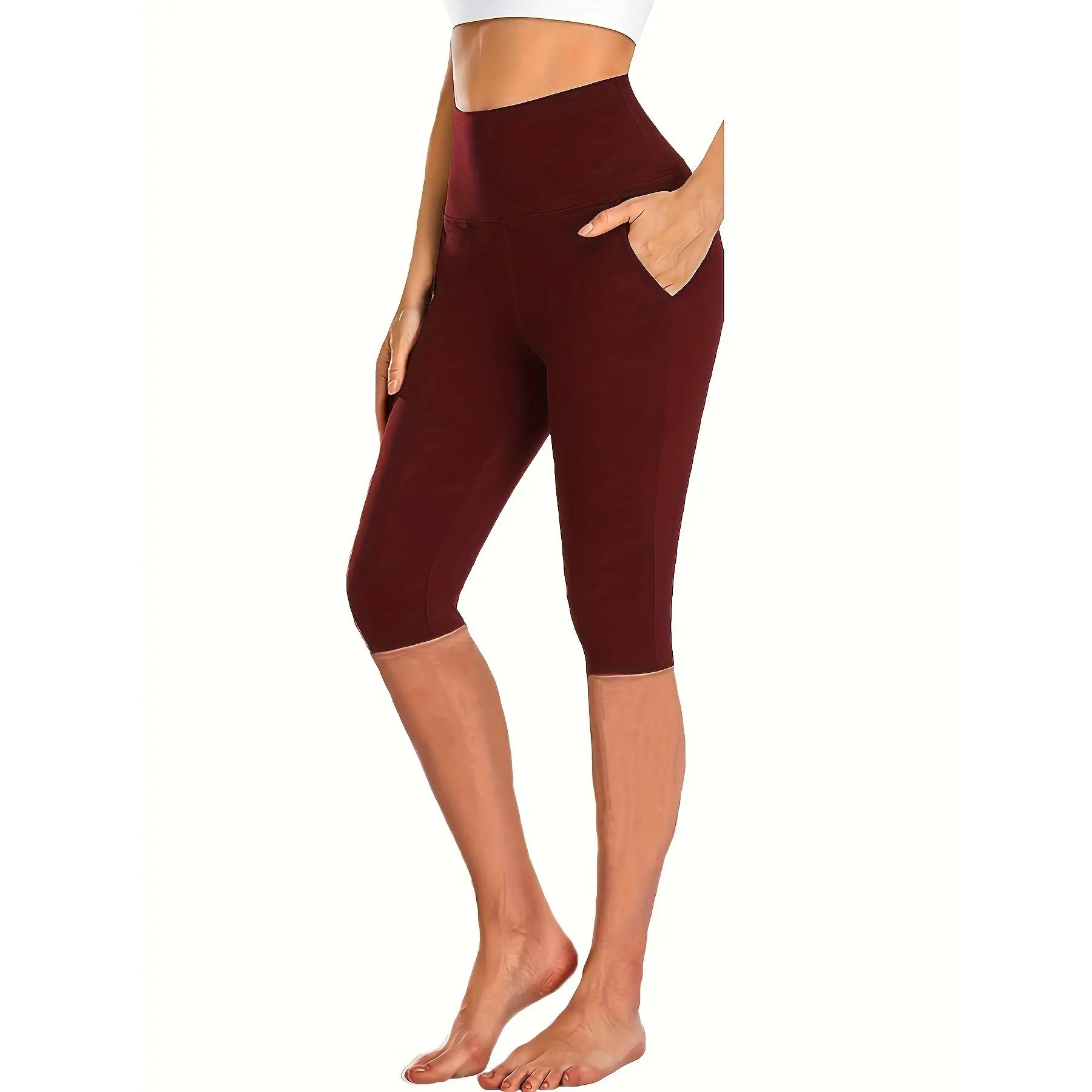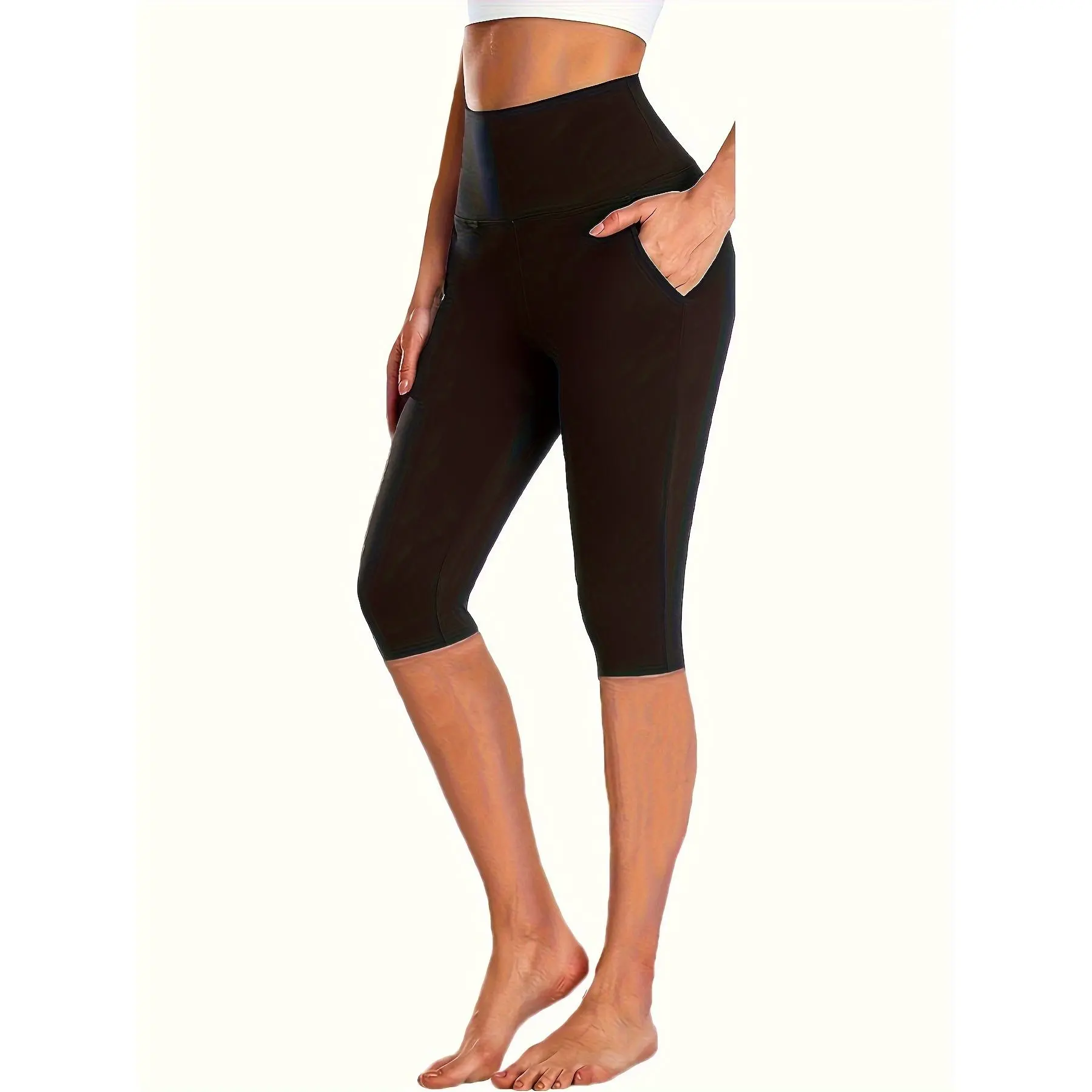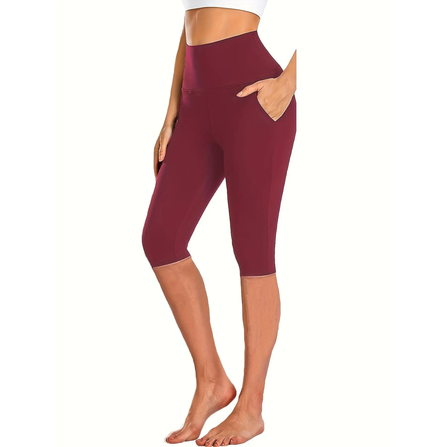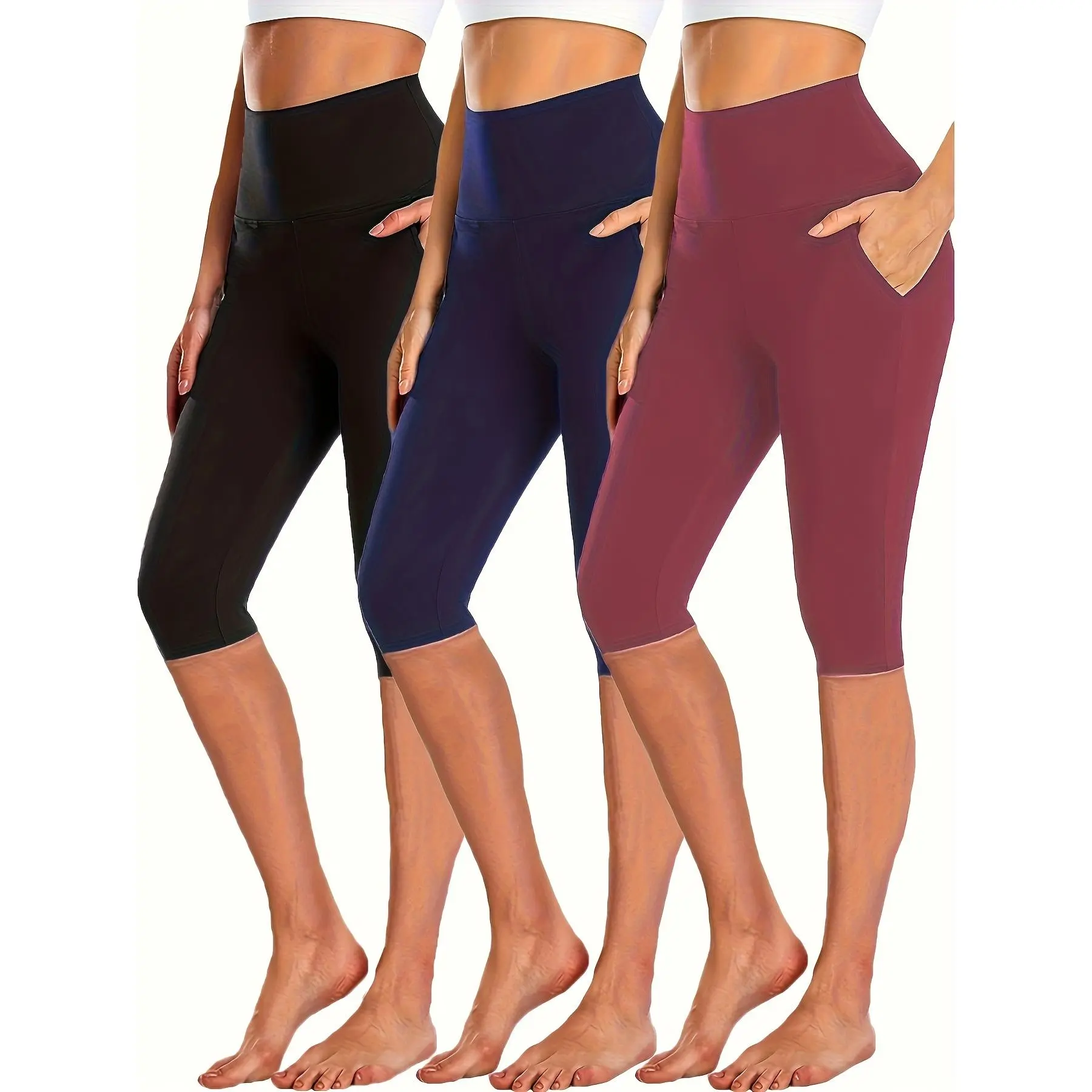 3-Piece Knee-Length Leggings with Pockets Summer High Waist Khaki Pants Riding Shorts for Women Yoga Exercise