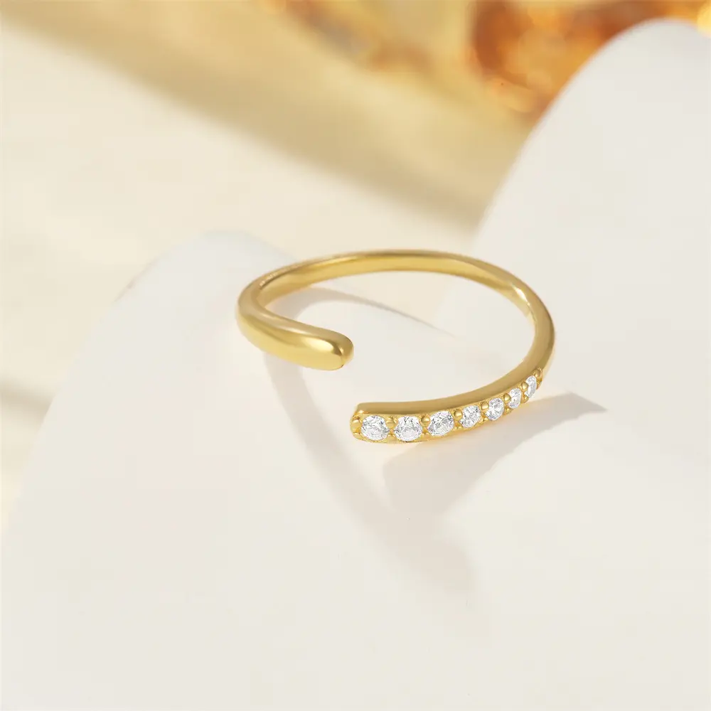 925 Sterling Silver Open Twist Ring with an adjustable band. The ring is set with a row of sparkling cubic zirconia stones, the delicate zircons sparkle from any angle. 18K gold plating looks unmatched. This ring exudes elegance and sophistication. Whether you're dressing up for a special occasion or adding a touch of glam to your everyday look, this versatile piece is sure to turn heads.