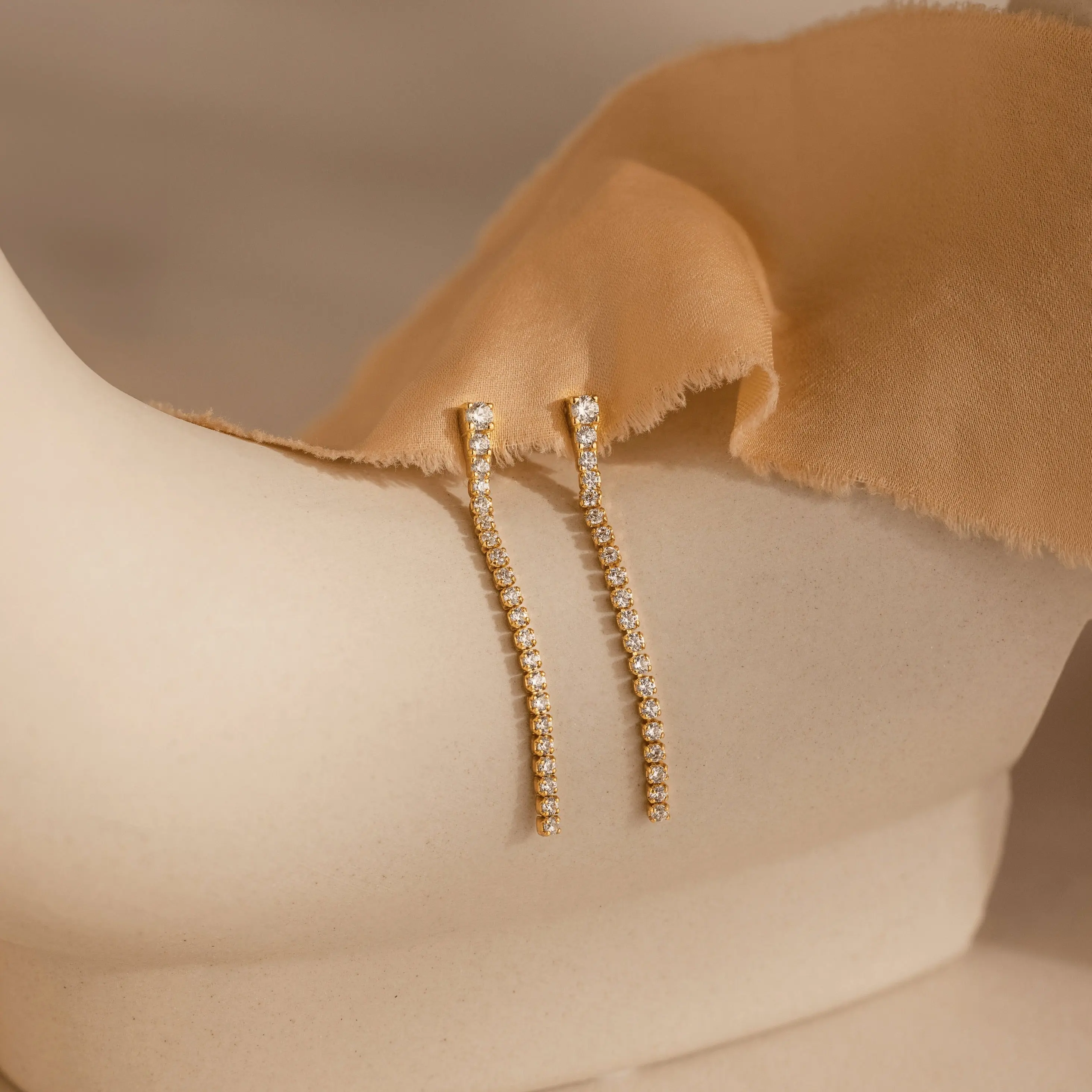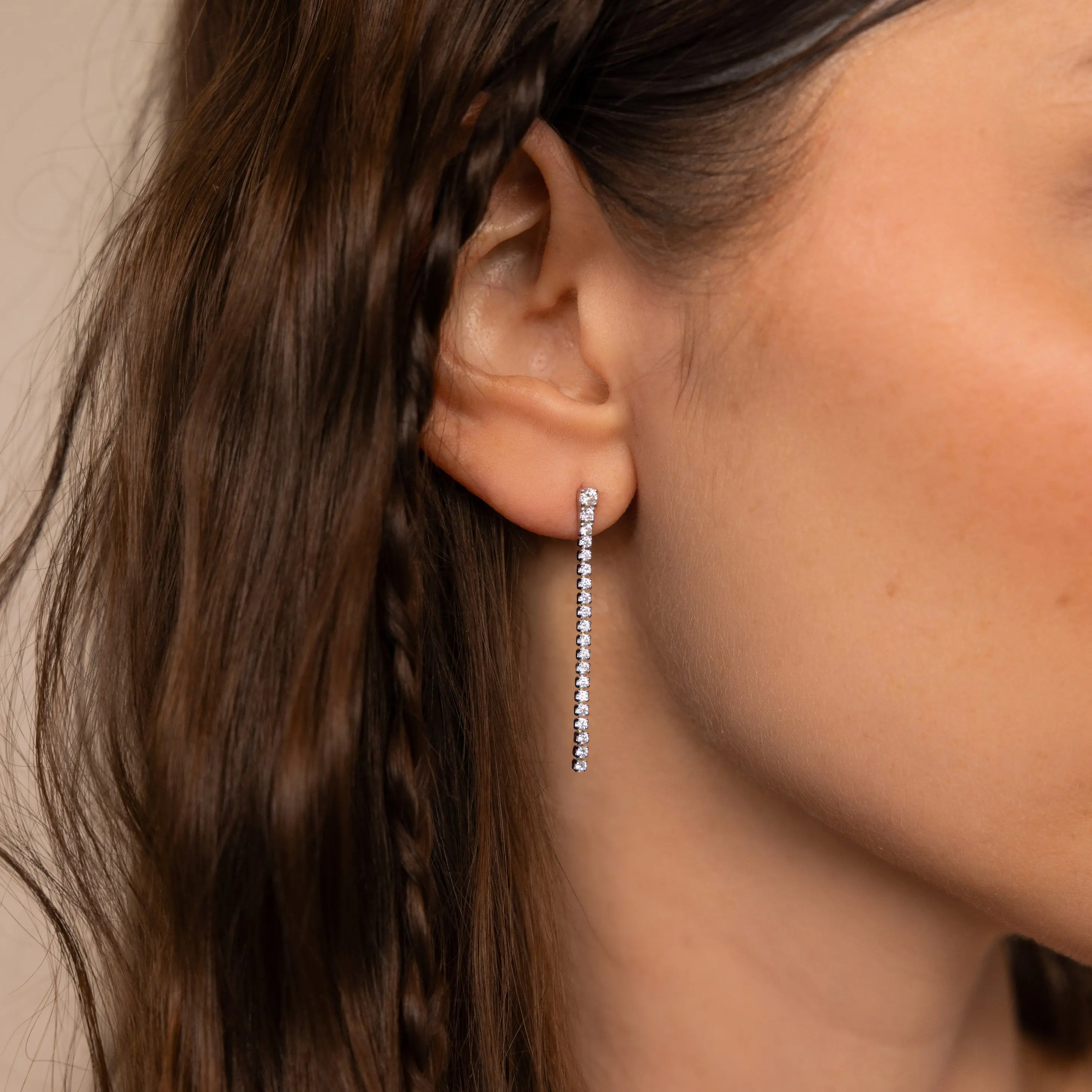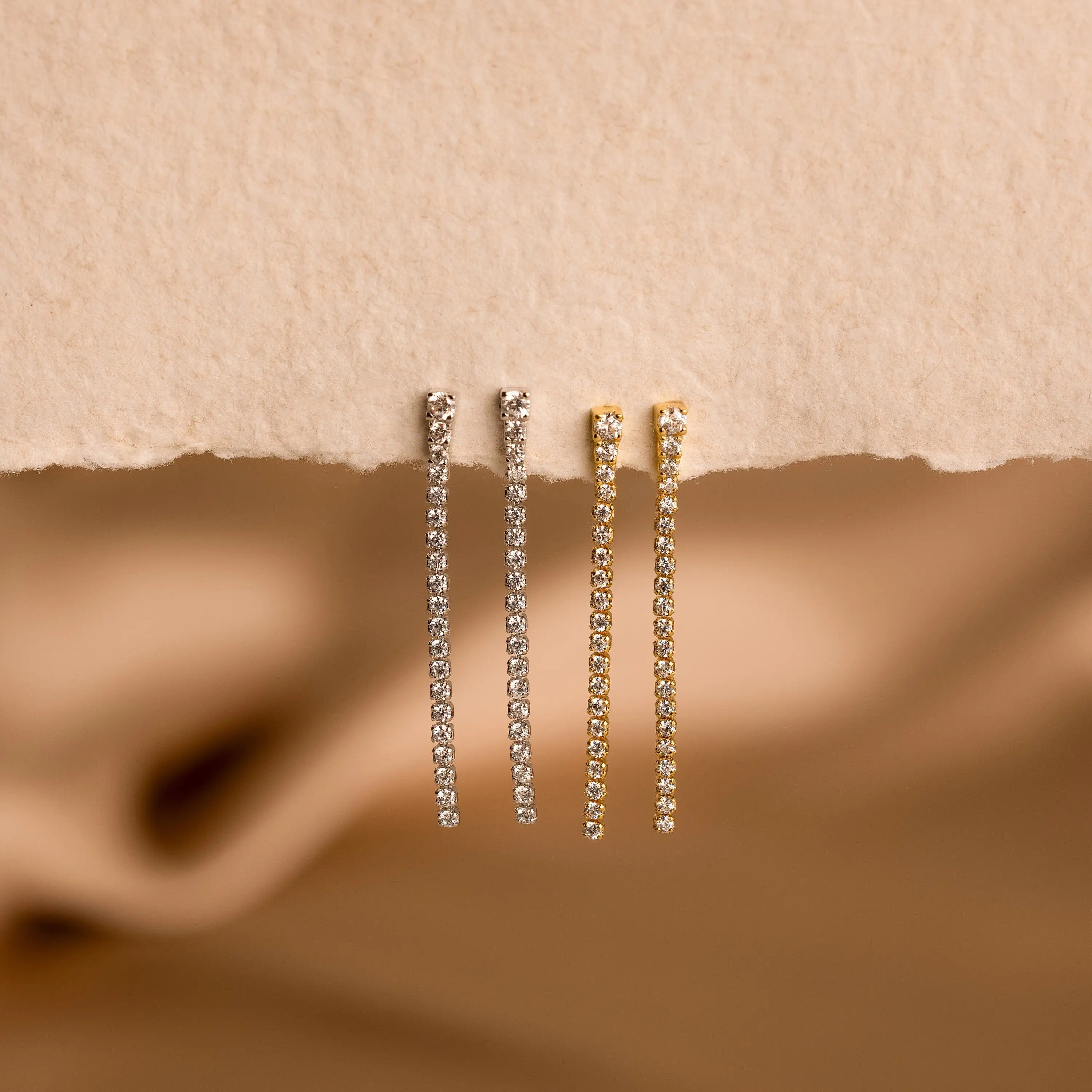 Jewelry fit for a queen, you say? We have you covered with our Diamond Tennis Chain Dangle Earrings. The long, elegant dangling Diamond earrings keep in mind class and elegance while simultaneously making a statement to anyone who sees. Your ballgown and carriage await, all you need are the perfect earrings to match!