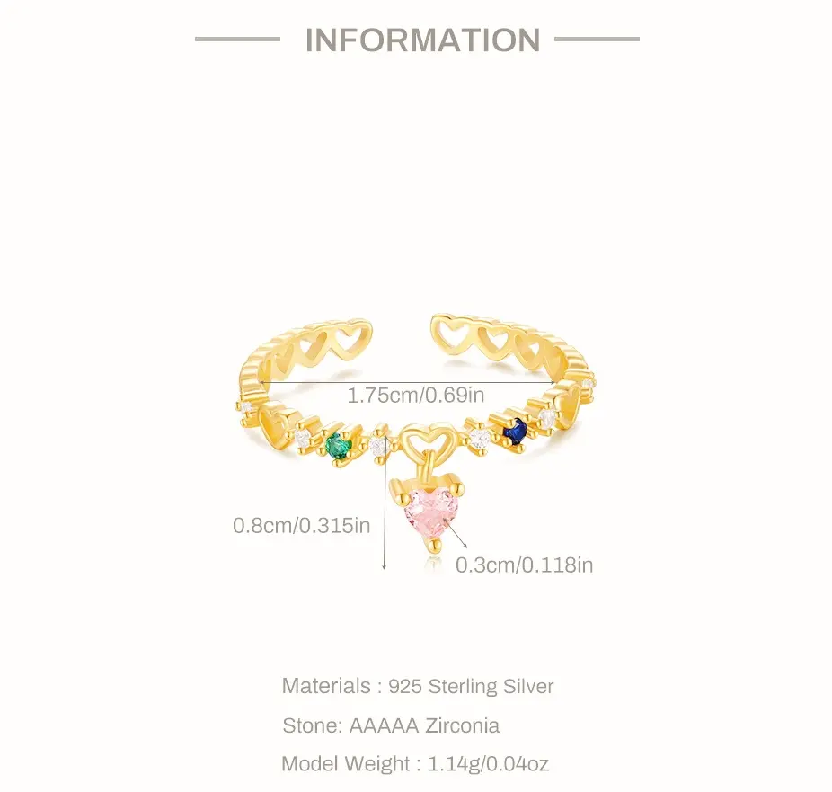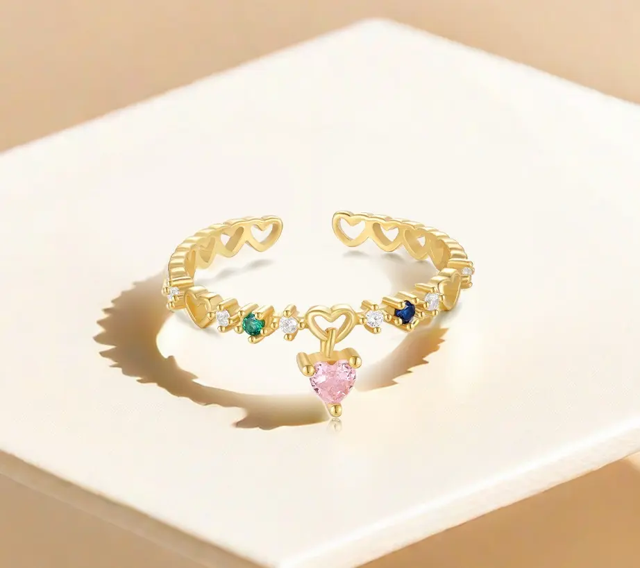 This delicate hollow adjustable heart-shaped pendant ring is crafted from 925 sterling silver with an 18K gold-plated finish. The dangling pink heart-shaped zircon pendant adds a charming and romantic touch.