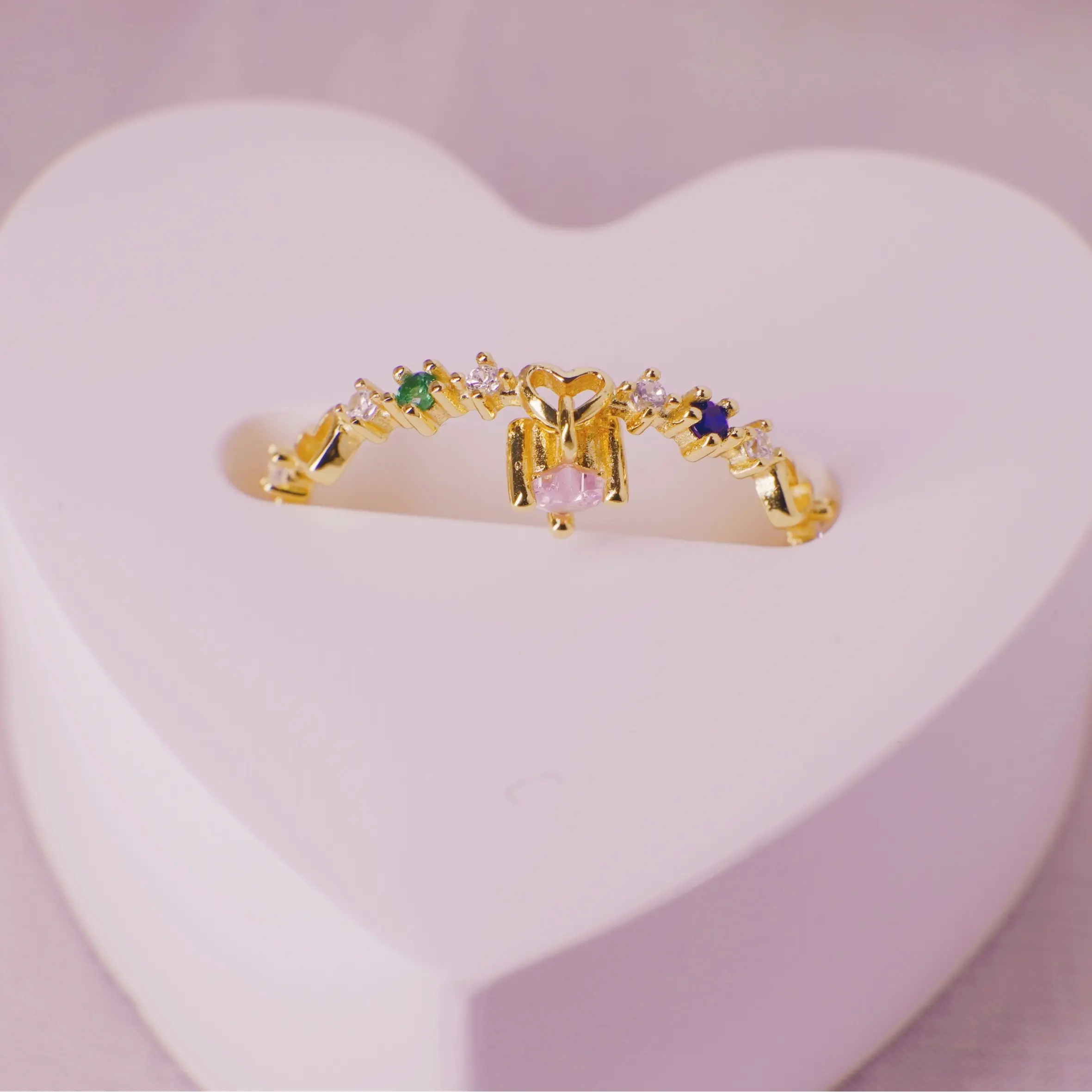 18K Gold Plated 925 Silver Adjustable Barbie Pink Heart-Shaped Pendant With Multi-Color Zirconia Ring