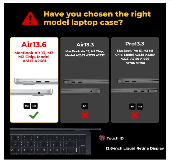 ·Perfect Fit and Slim Profile: Only compatible with MacBook Air 13 inch case M3 M2 2025 2024 2023 2022 Release with 13.6-inch (diagonal) Liquid Retina Display & Touch ID notch compatible, laptop computer (model number: A3113 & A2681-MRXV3LL/A, MRXQ3LL/A, MRXN3LL/A, MRXT3LL/A, MXCV3LL/A, MXCT3LL/A, MXCR3LL/A, MXCU3LL/A, MLXW3LL/A, MLXX3LL/A, MLXY3LL/A, MLY03LL/A, MLY13LL/A, MLY23LL/A, MLY33LL/A, MLY43LL/A). Note: This case is not compatible with other model laptops