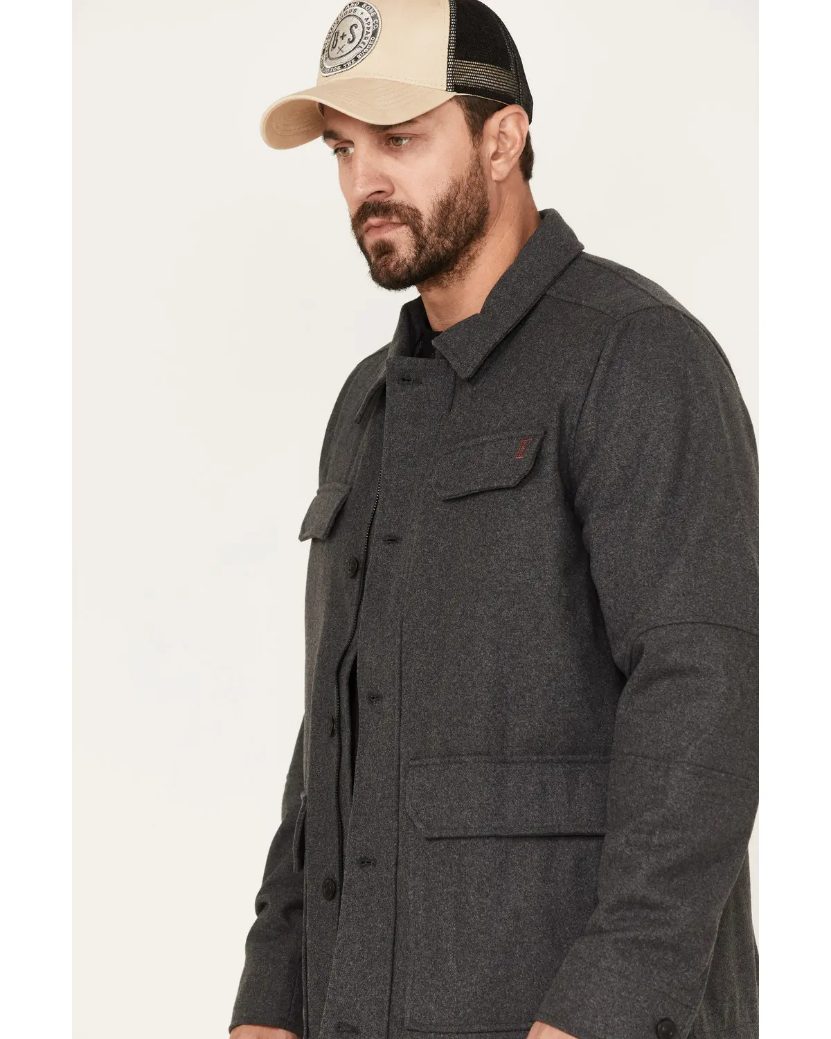 Long sleeves. Dual button and zipper front closure. Four front flap pockets. Solid gray design.