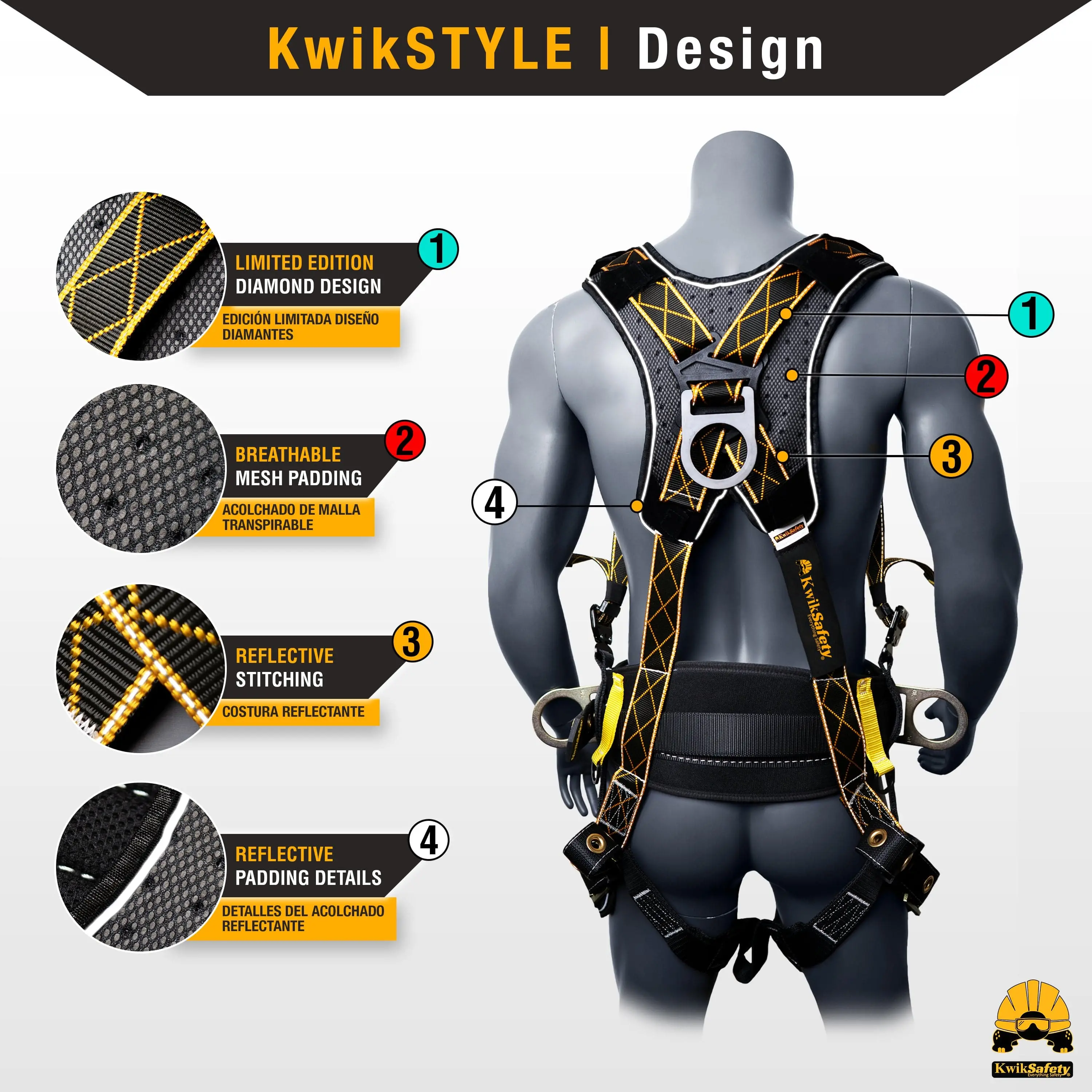 ·Protection: Safety harness fall protection impact indicator tags on the back of the harness.