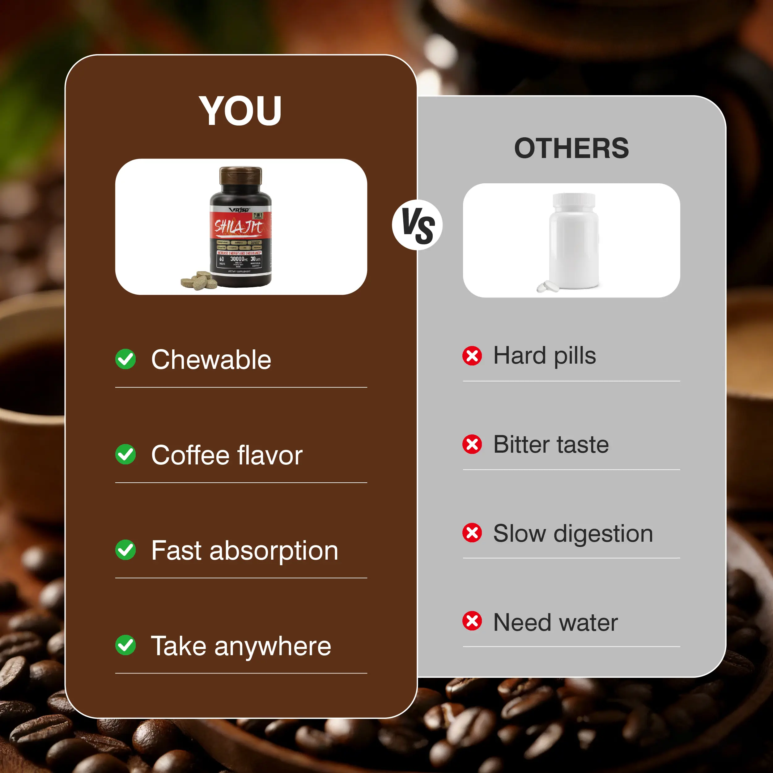 Upgrade your daily routine with our coffee-flavored chewable tablets — a modern alternative to traditional capsules. Just chew, enjoy the taste, and feel supported throughout your day.