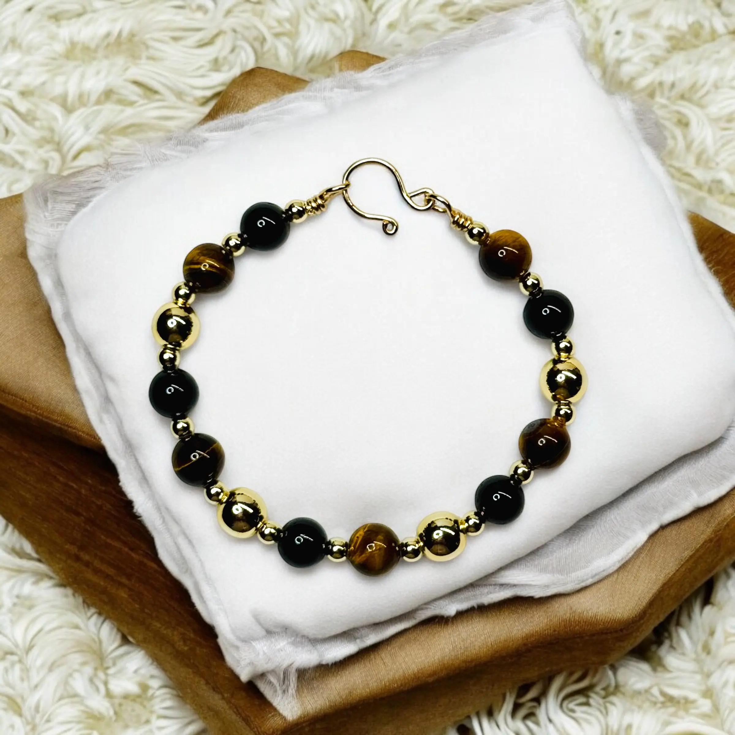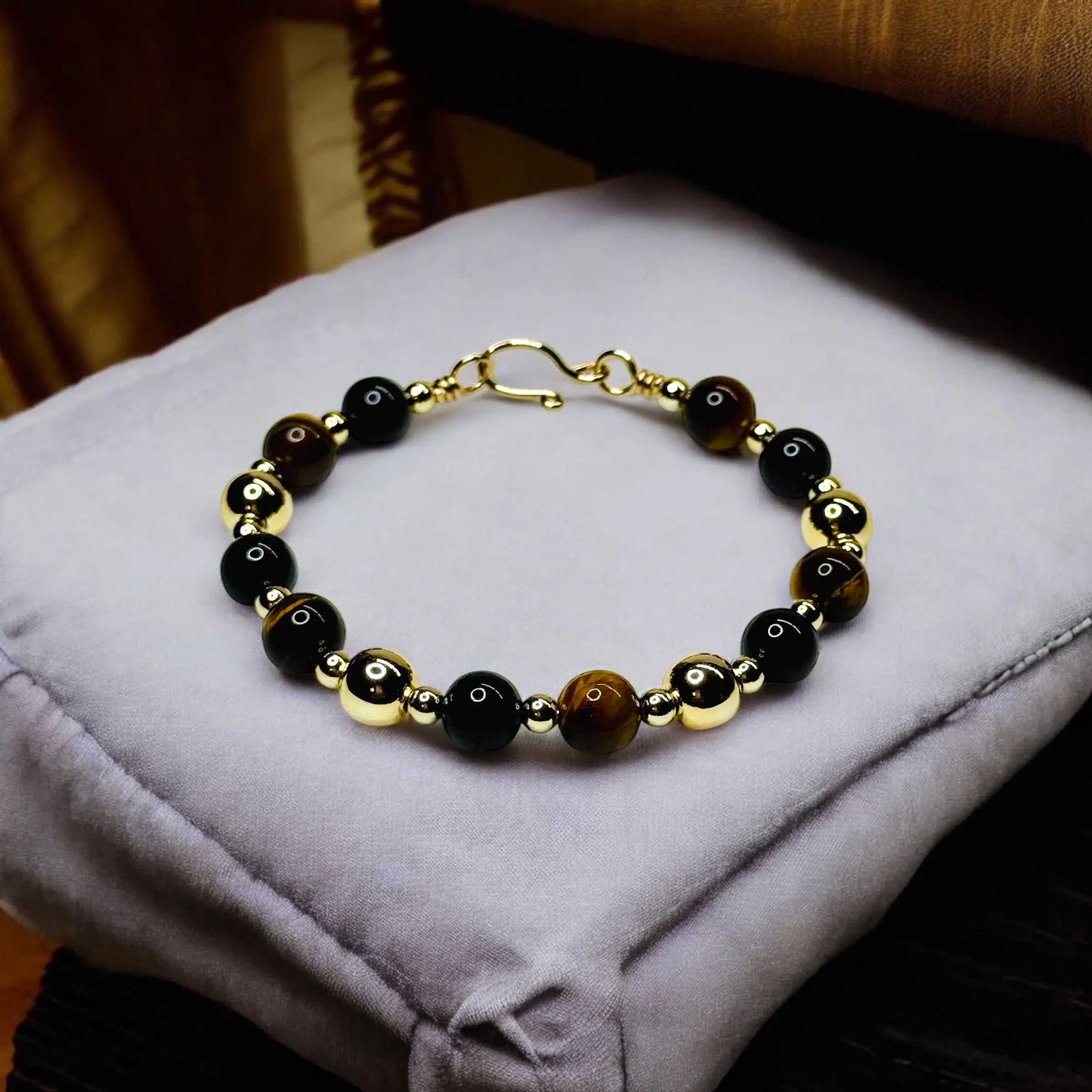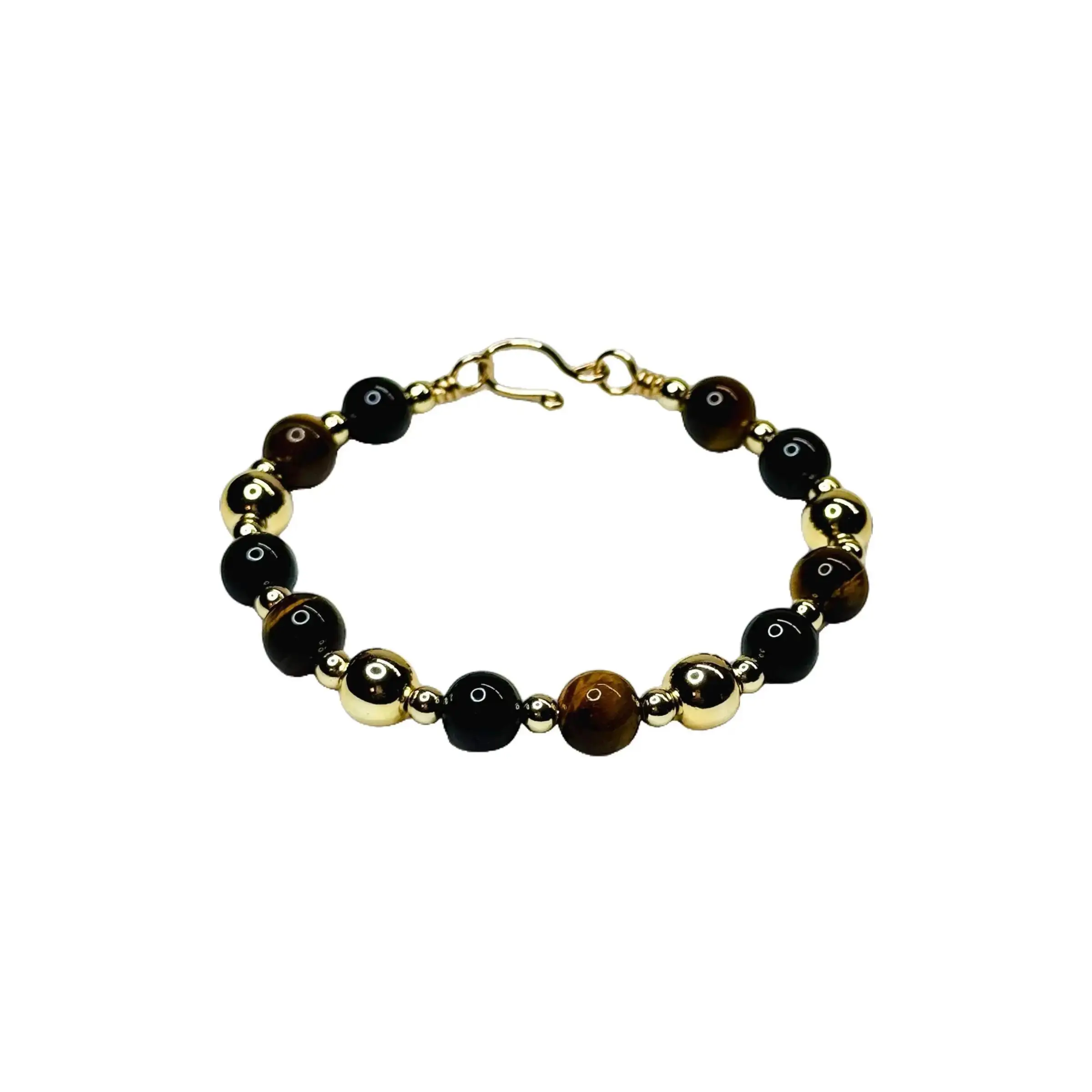 Tawny Tigers Eye 14K Gold Bracelet with Black Tourmaline, Size 6.5"