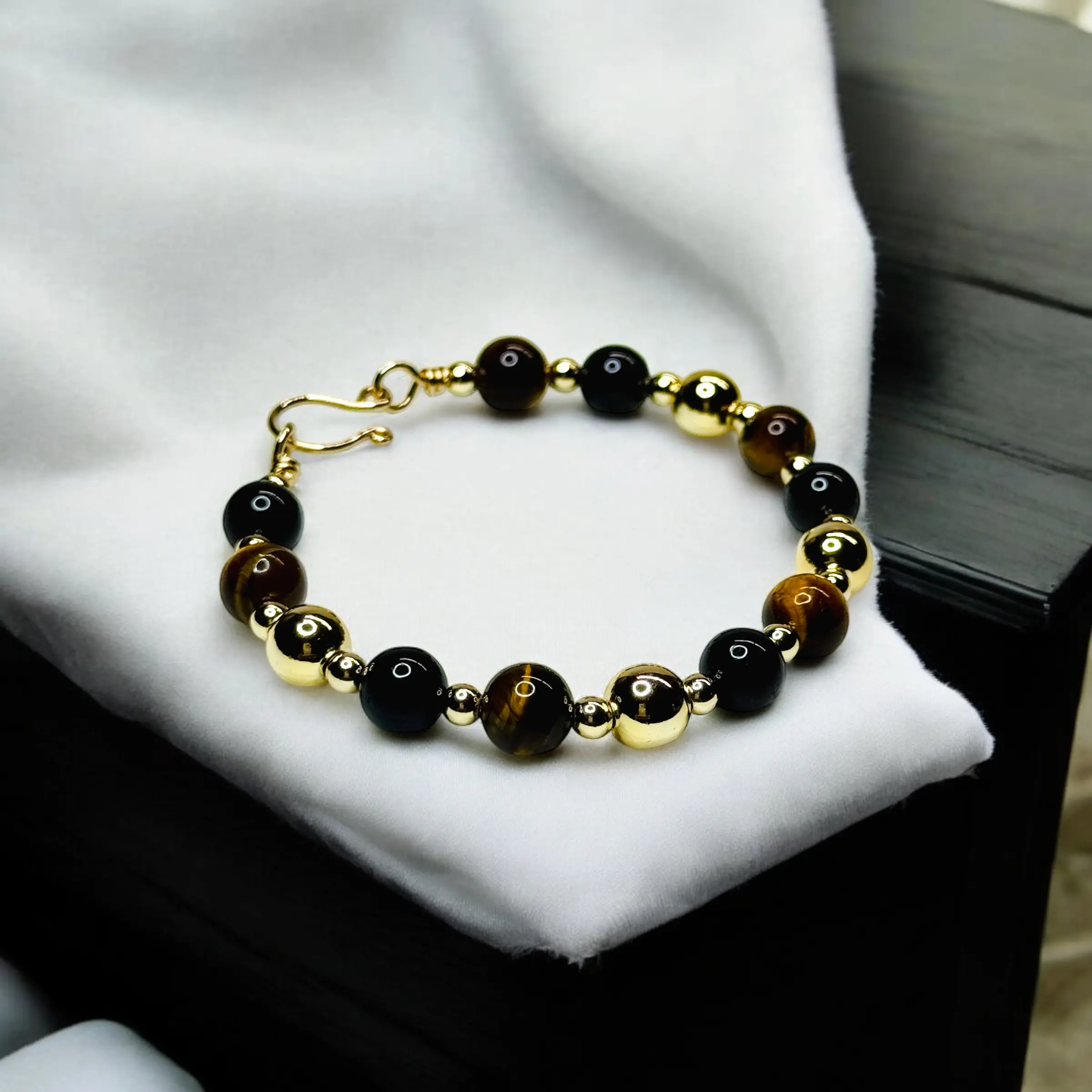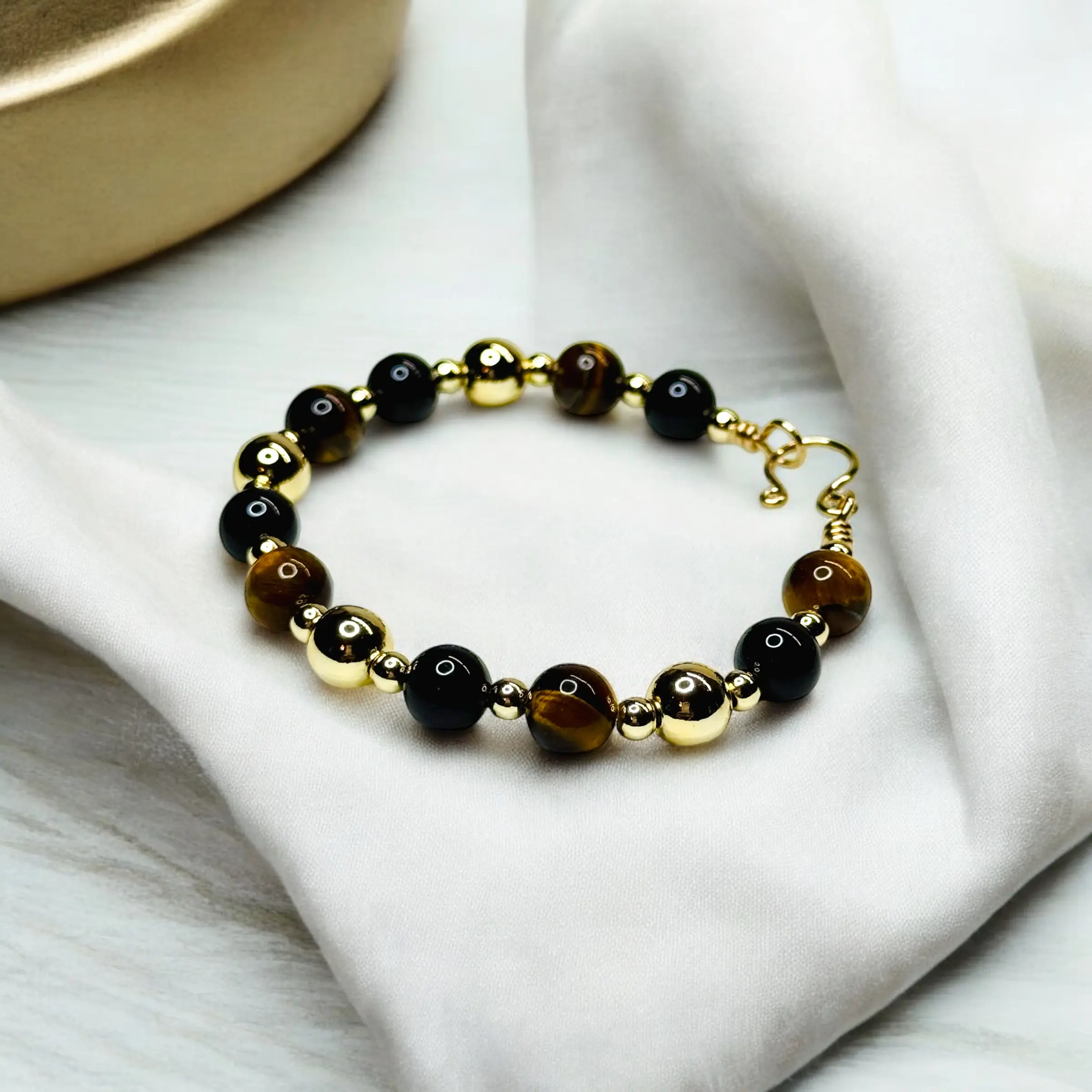 Tawny Tigers Eye 14K Gold Bracelet with Black Tourmaline