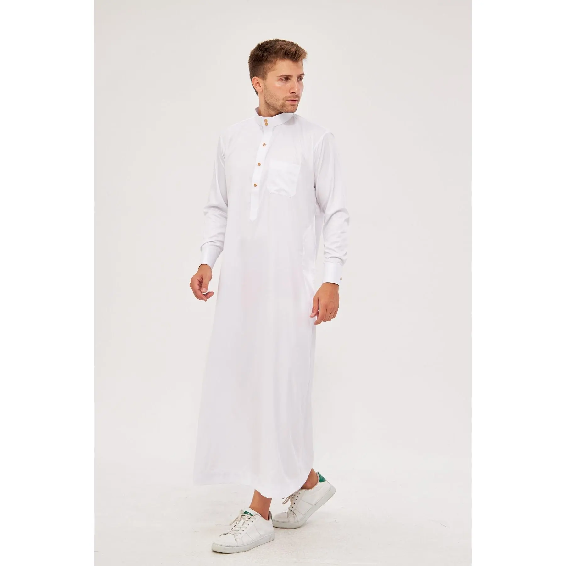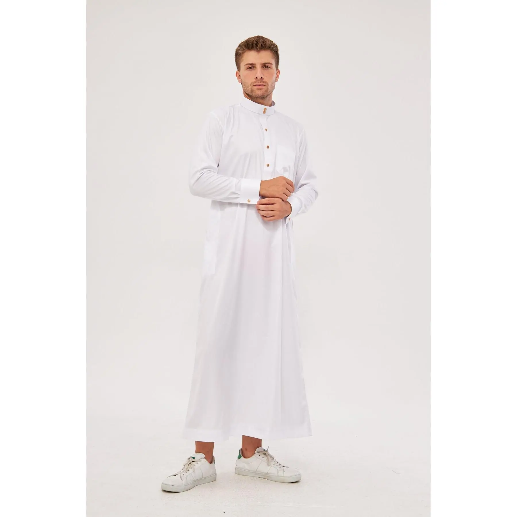 Design: White thobe with a classic buttoned neckline, accented with gold buttons for a touch of luxury