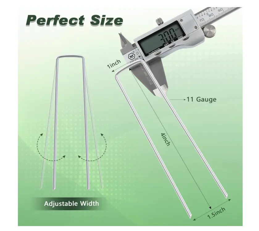 ·【MATERIAL】Our landscape pins are made of heavy duty hot-dip galvanized steel. Premium quality makes them durable and can be reused many times. Our landscape fabric stakes are made of anti-rust durable galvanized steel. It is so strong to insert into the ground with adjustable width.