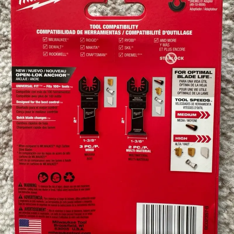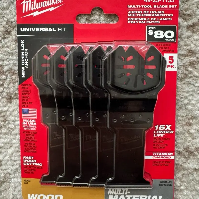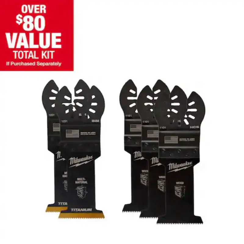 The MILWAUKEE Universal Fit OPEN-LOK 5-Piece Oscillating Multi-Tool Set provides users with an assortment of blades for use in wood and nails, wood, drywall, and PVC. The Titanium Enhanced Bi-Metal blade uses premium high-speed steel and lasts up to 15X longer than standard high carbon steel (HCS) blades. The bi-metal multi-tool blade is ideal for smooth cuts in wood with nails, PVC, and drywall. The HCS Wood Blades are ideal for fast cuts in wood, PVC, drywall, and other soft materials. This oscillating tool blade variety pack is designed and made with global materials.