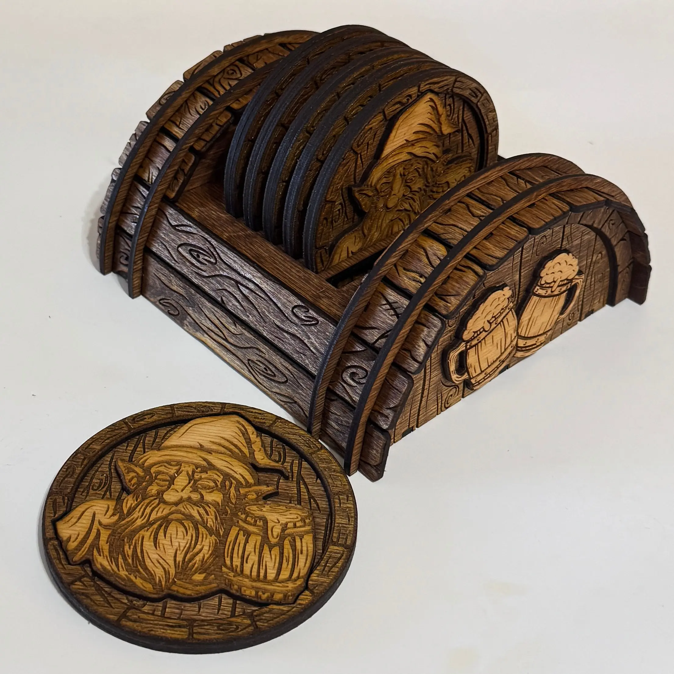These Rustic Dwarves Coasters with Barrel Coaster Stand bring a touch of enchanted forest to your home decor. The wooden coasters feature carefully crafted dwarves, adding both whimsy and functionality to your tabletop. The multi-layer design ensures durability, and the already assembled coaster stand saves you time and hassle. Measuring 7x7x5 inches, this set is the perfect addition to any home.