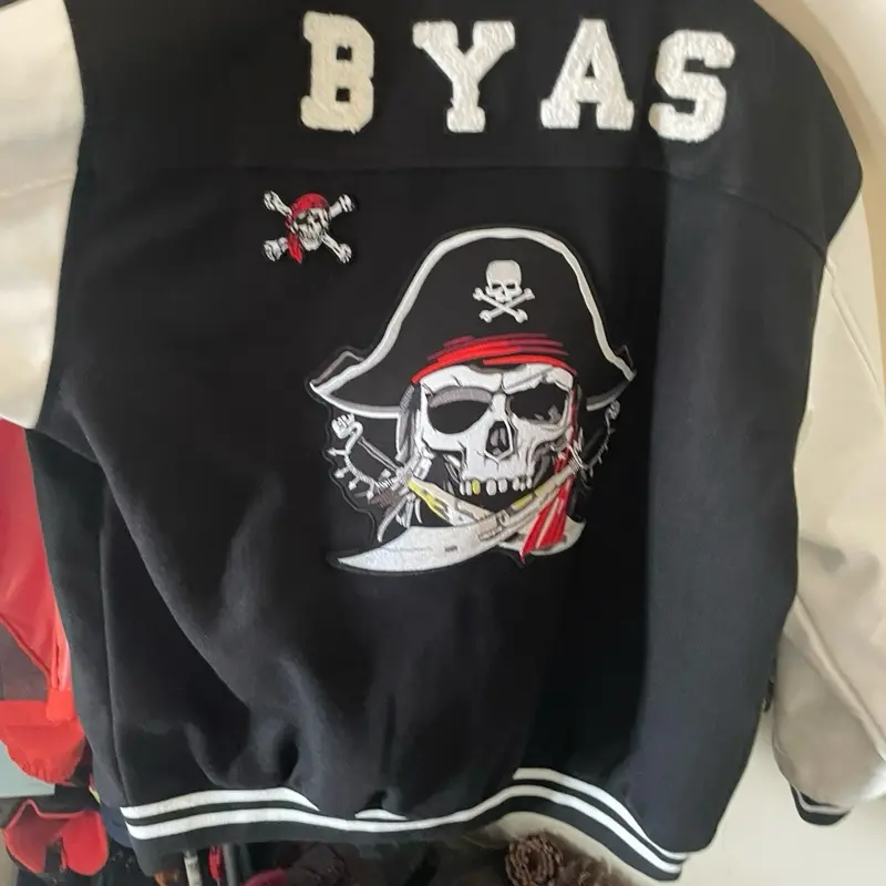 * Pirate Cap Graphic: The black jacket showcases a striking pirate cap graphic, making it a standout piece that can elevate any outfit.