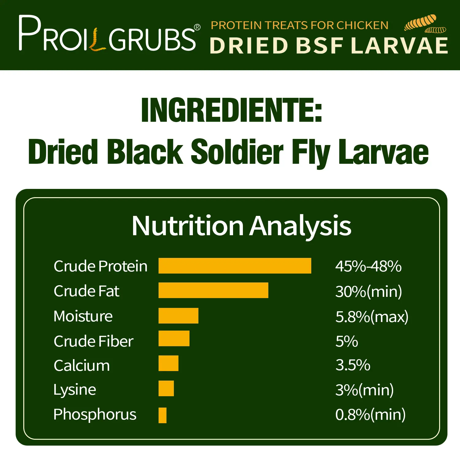 ·Rich Nutritional Profile: Proilgrubs made from Black Soldier Fly larvae, a beneficial insect known for its rich nutritional profile. These insects are high in protein, calcium, and uric acid.