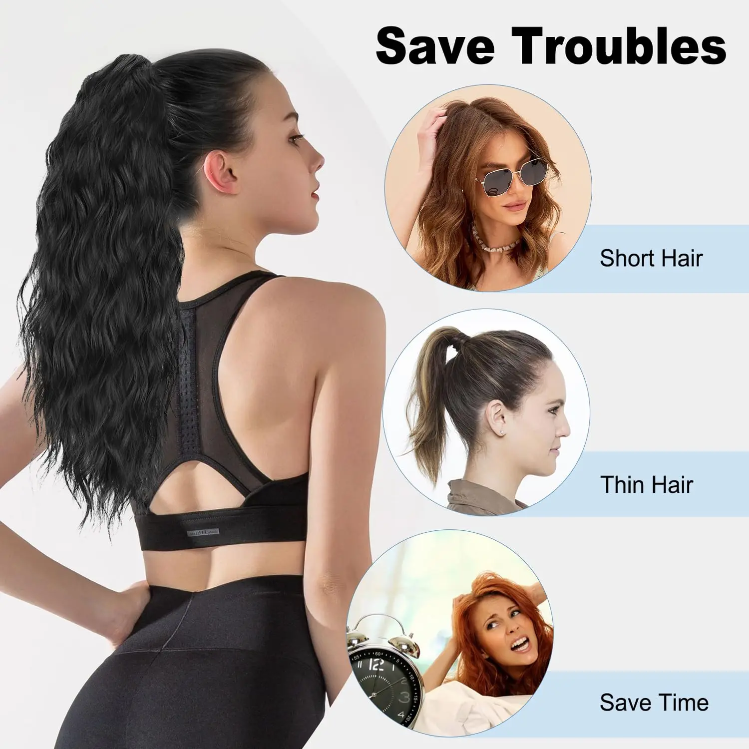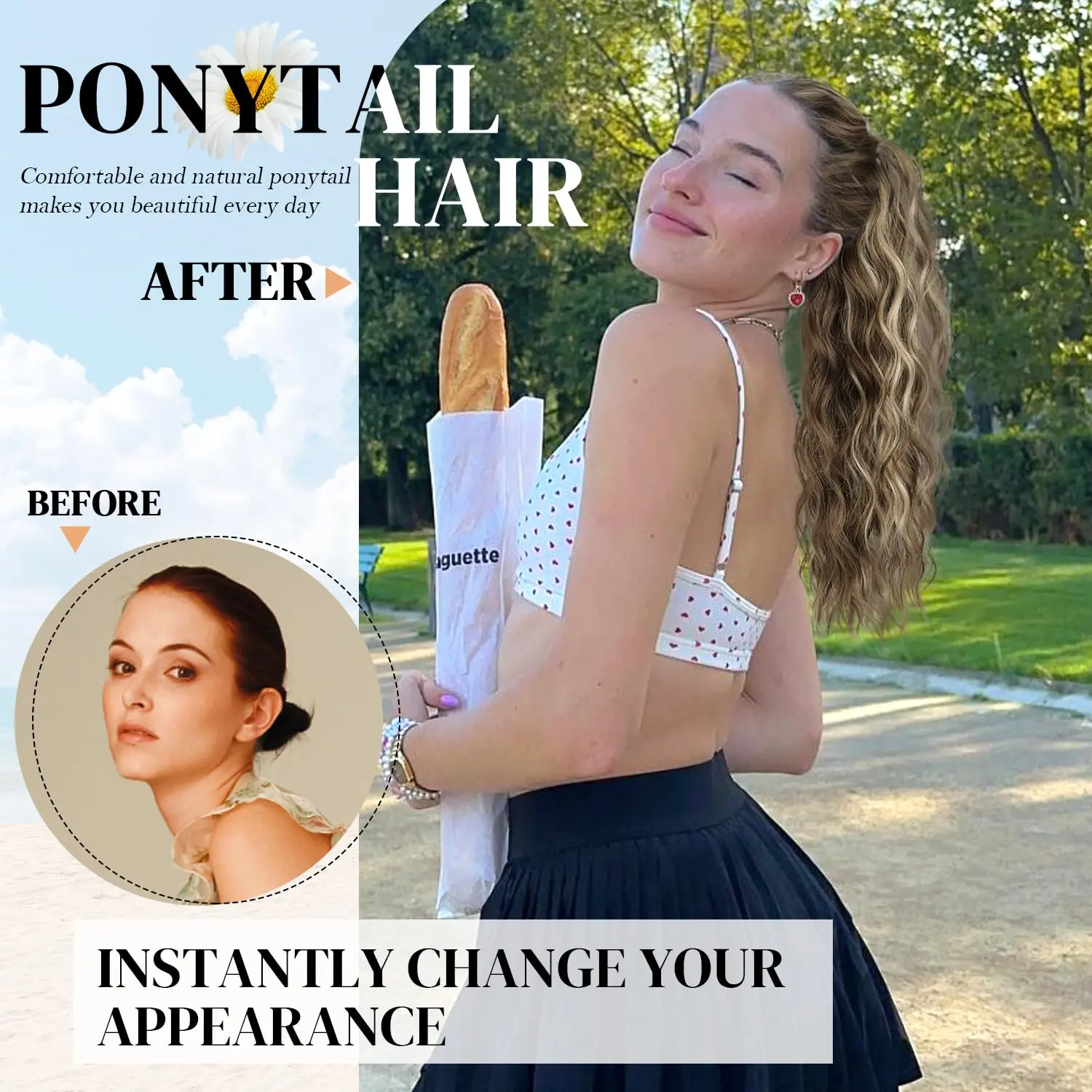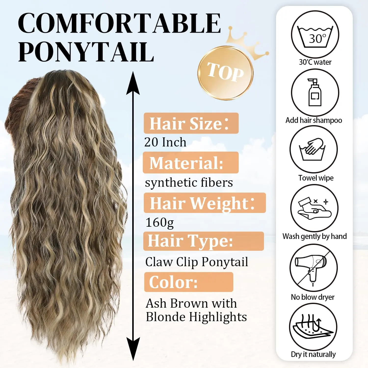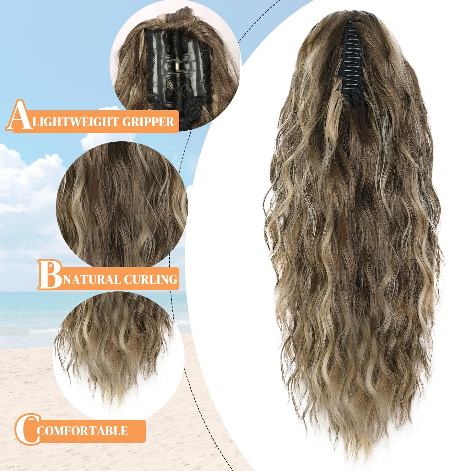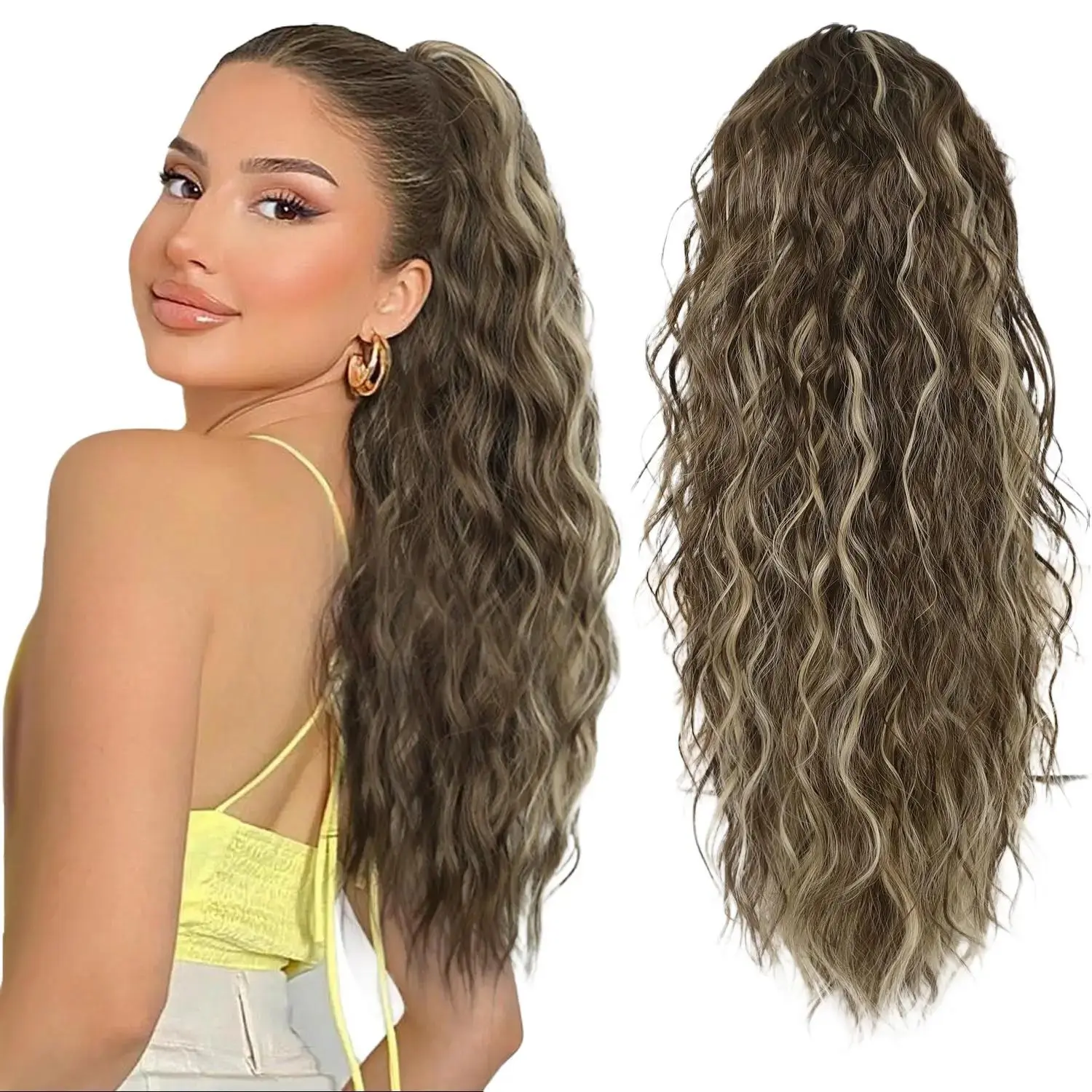 ·Material Introduction: Our ponytail extensions are crafted from high-quality synthetic fibers, ensuring a safe, comfortable, and beautiful touch. The material is soft to the hands and mimics the feel of natural hair, perfect for adding volume and length to your ponytail. Length: 20 inches with a wavy texture, Weight: 161g.