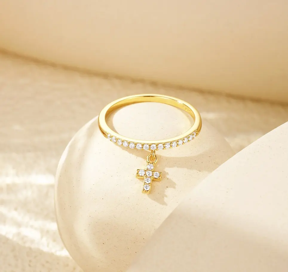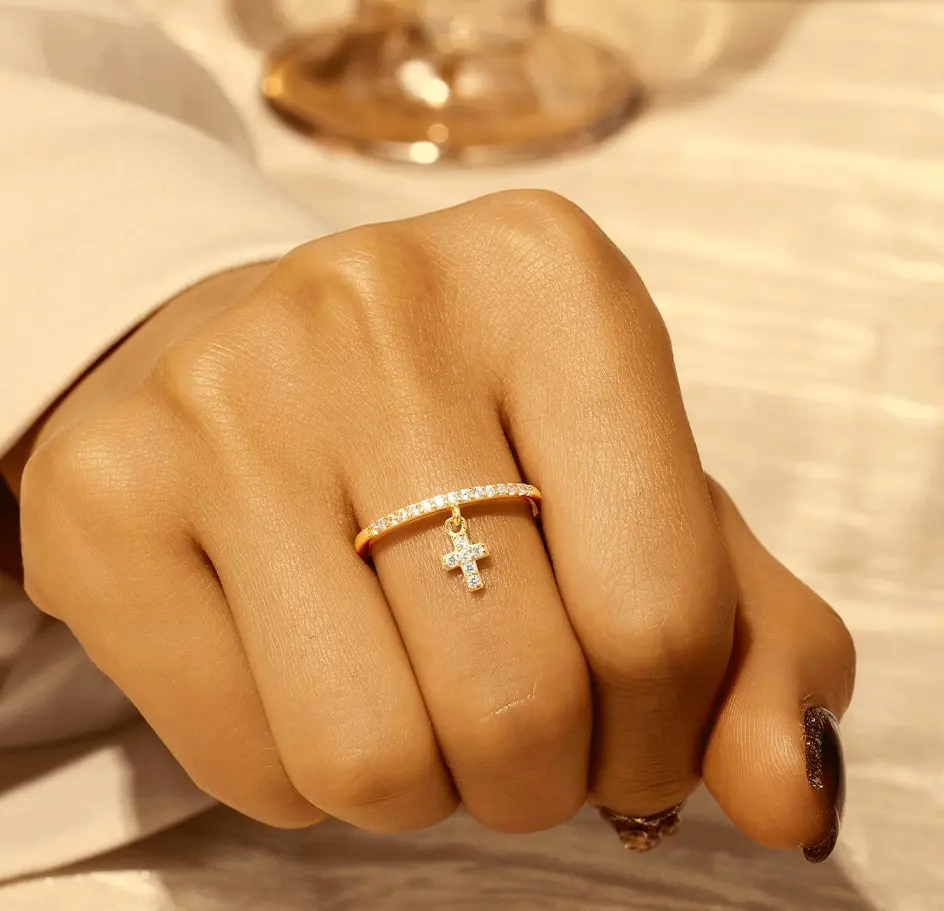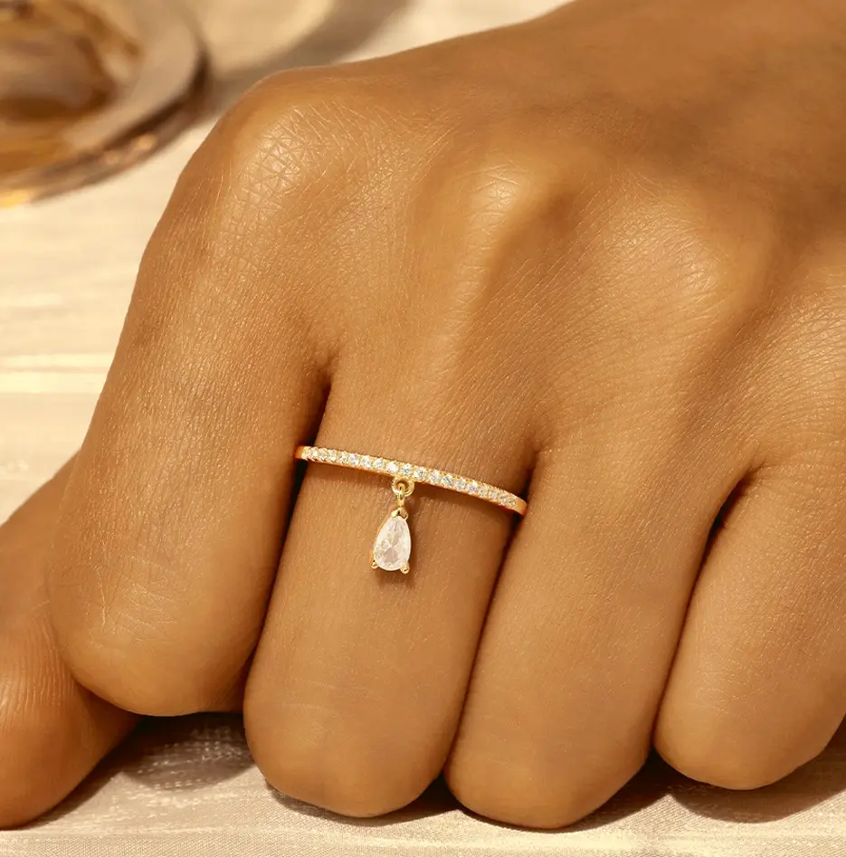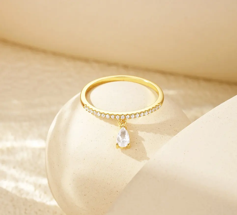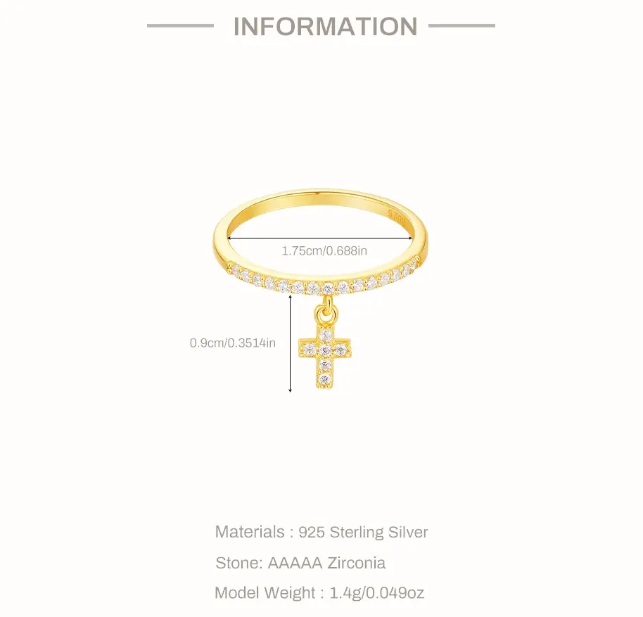 This exquisite ring is crafted from 925 sterling silver and plated with 18K gold. A delicate cross-shaped/teardrop-shaped pendant with zircon gold band which ideal for any occasions.