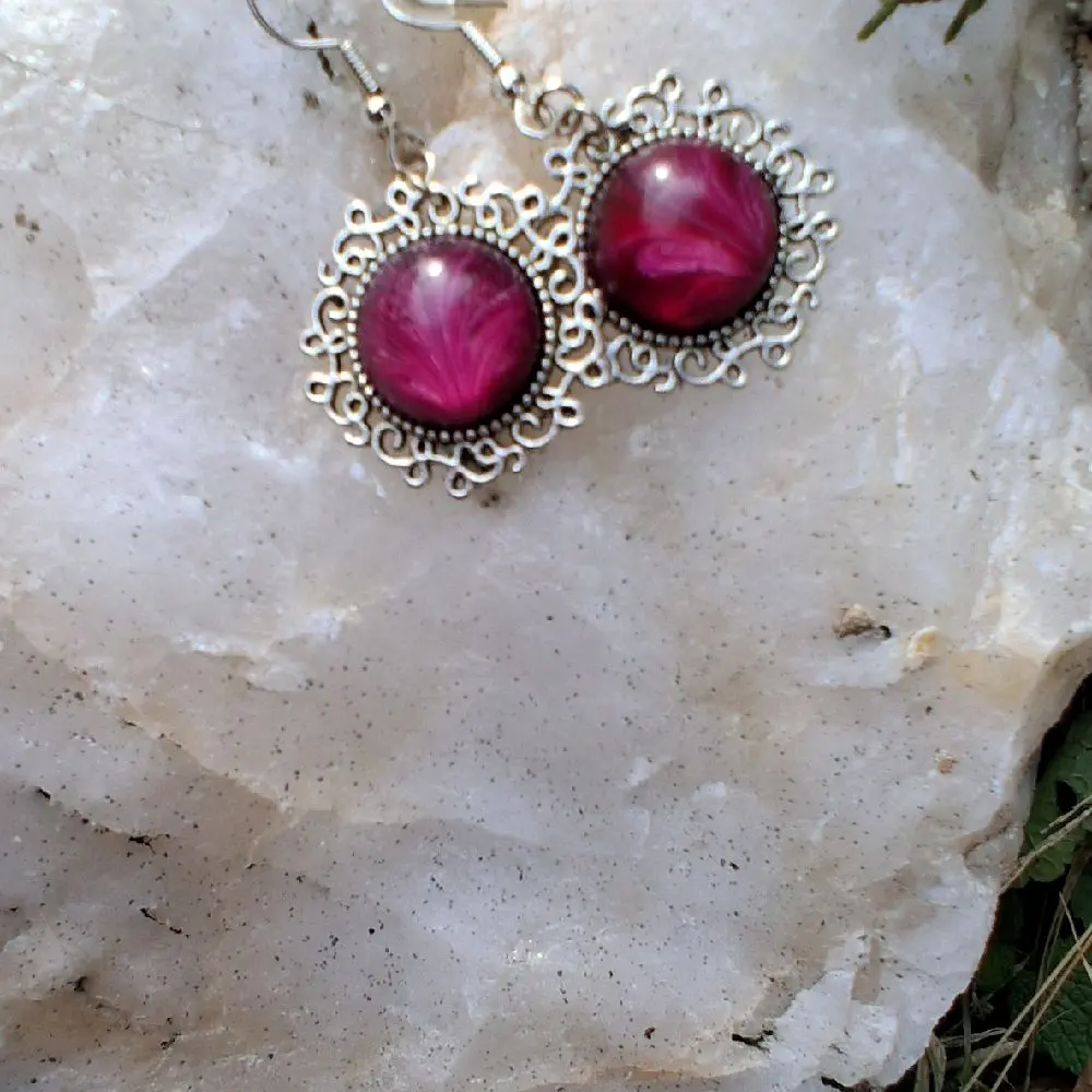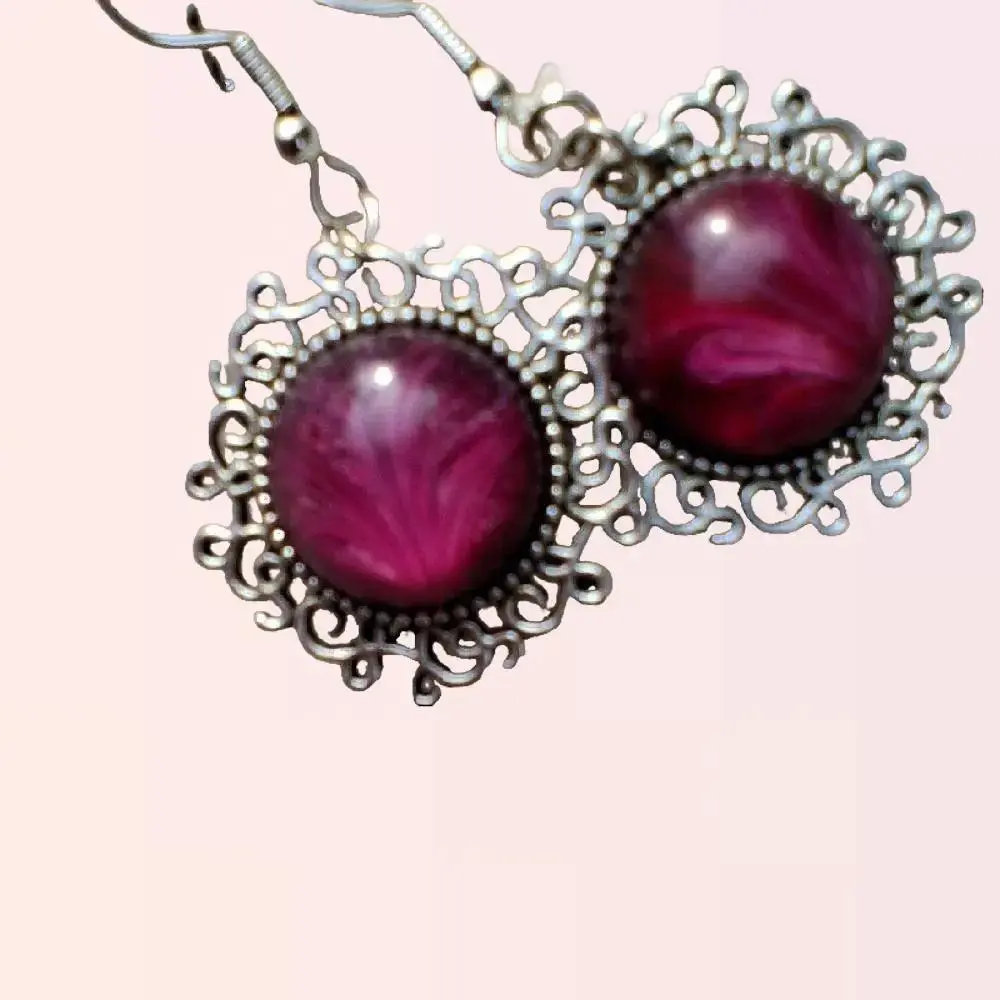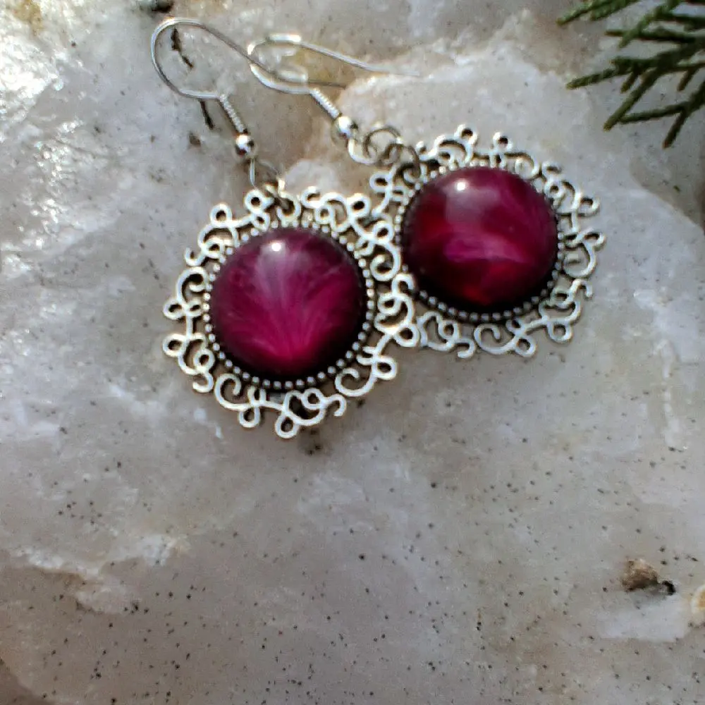 These earrings mimic the luxurious hues of burgundy wine. They feature lighter red and white swirls against a deep red background. Each earring is set in a Sterling Silver filigree bezel. Perfect for enhancing your jewelry collection, they add a unique touch to any outfit. "Everyone serves the good wine first, and when people have drunk freely, then the poor wine. But you have kept the good wine until now." John 2:10.