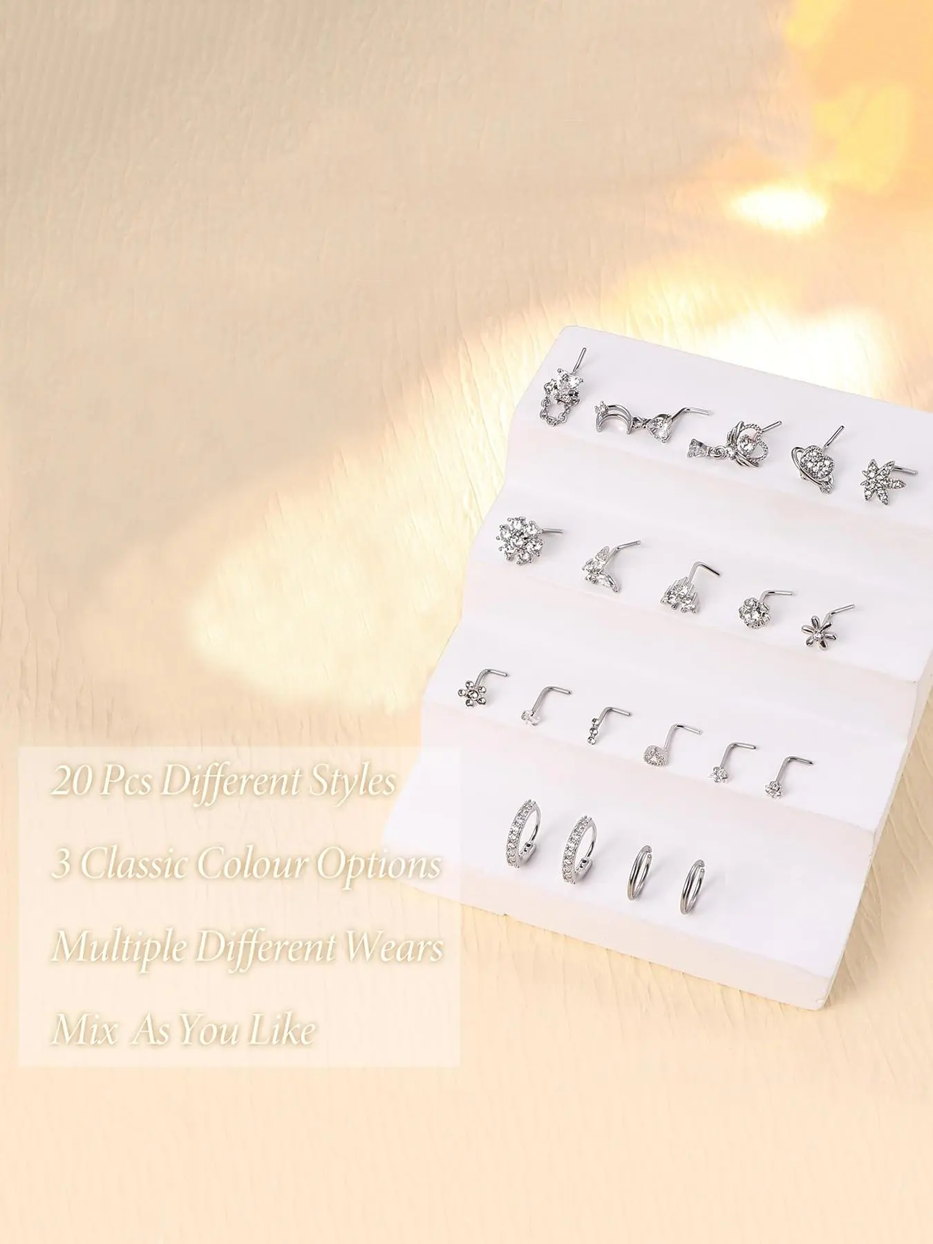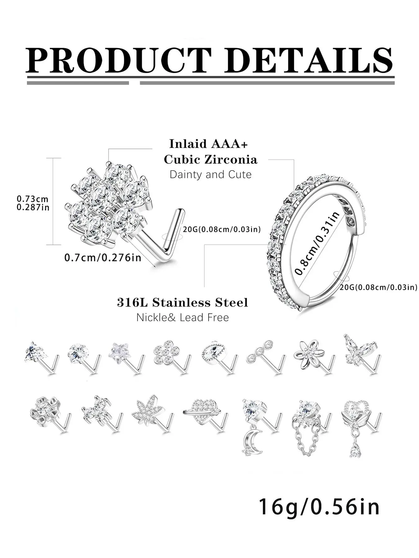 L Shaped Nose Ring, Stainless Steel Nose Studs Ring, Dangle CZ Butterfly Flower Nose Studs Hoops Piercings Jewelry Gift for Women Men, Nose Piercings Kit