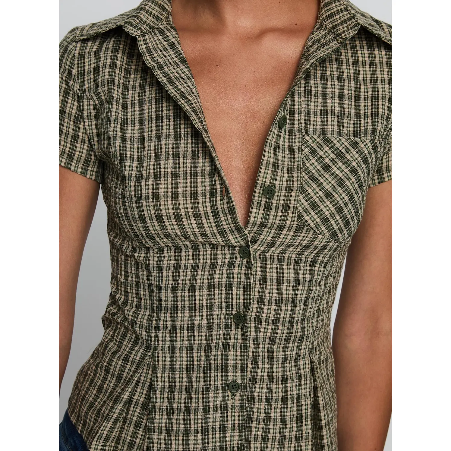 · Check print, classic collar, single breast pocket, pleats detail at hem, cap sleeves