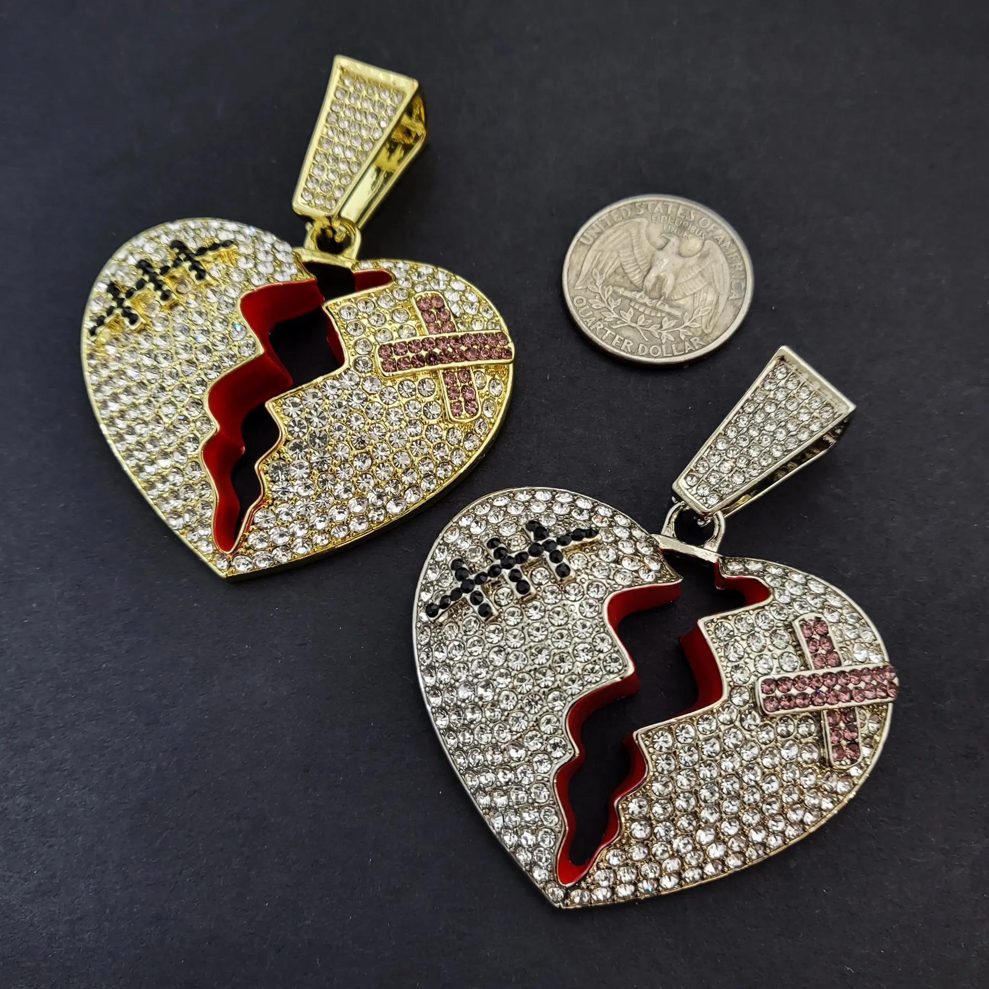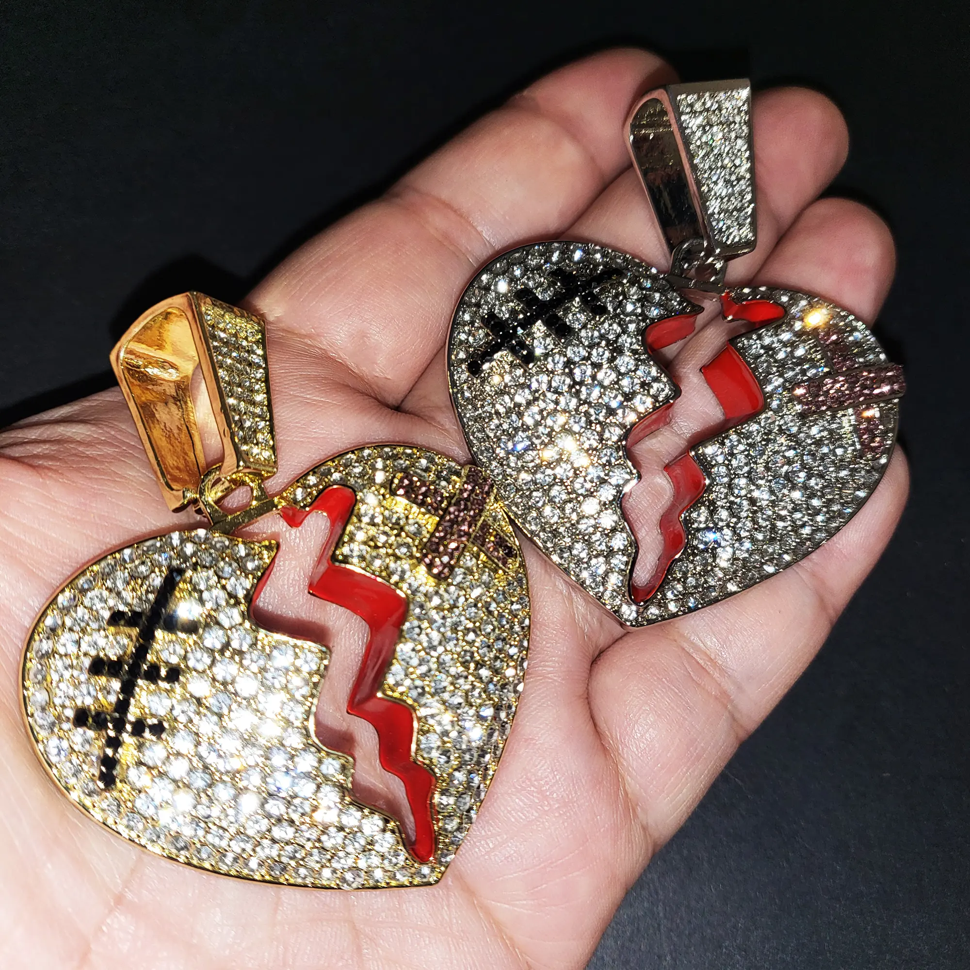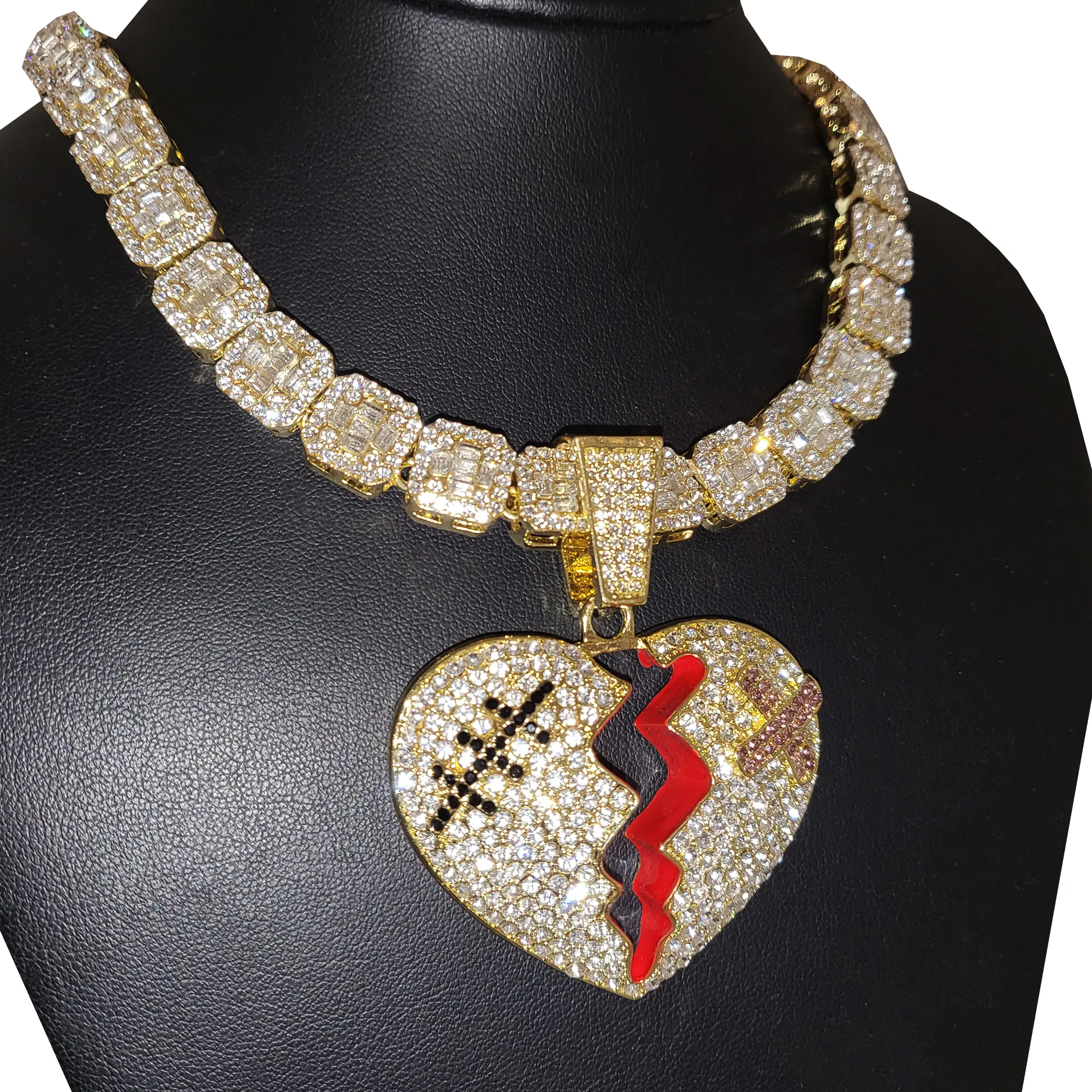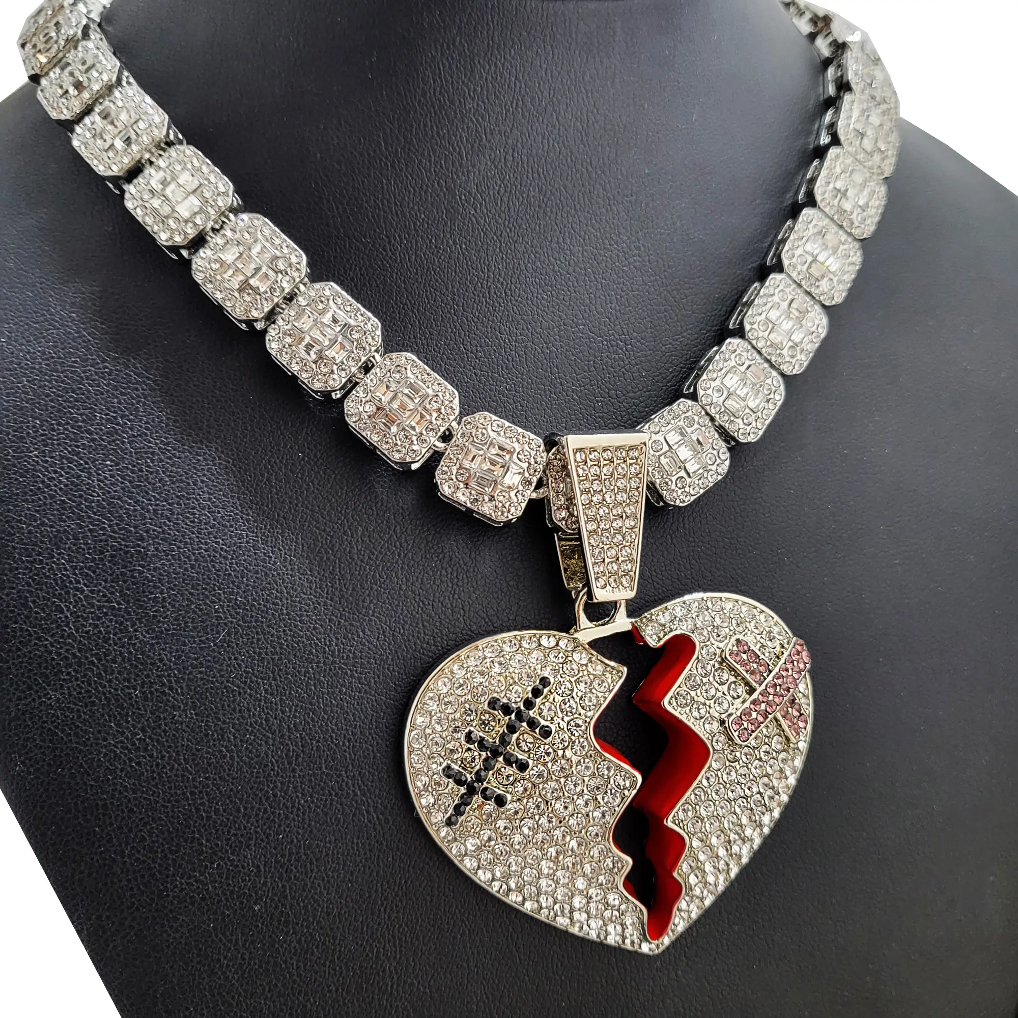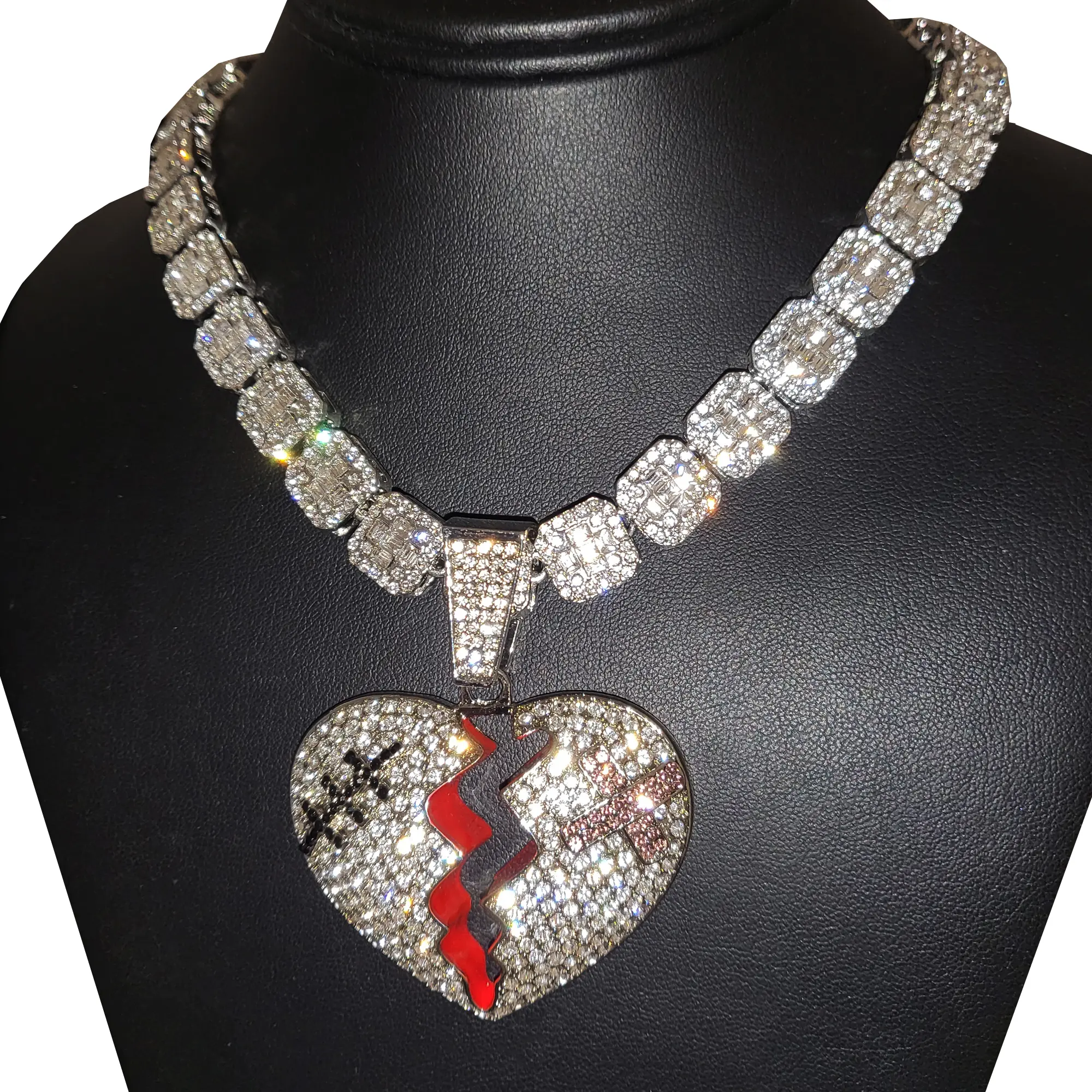Large Broken Heart Pendant & 12mm 16" 18" 20" Iced Baguette Stone Chain Hip Hop Necklace Jewelry Unisex Men Women