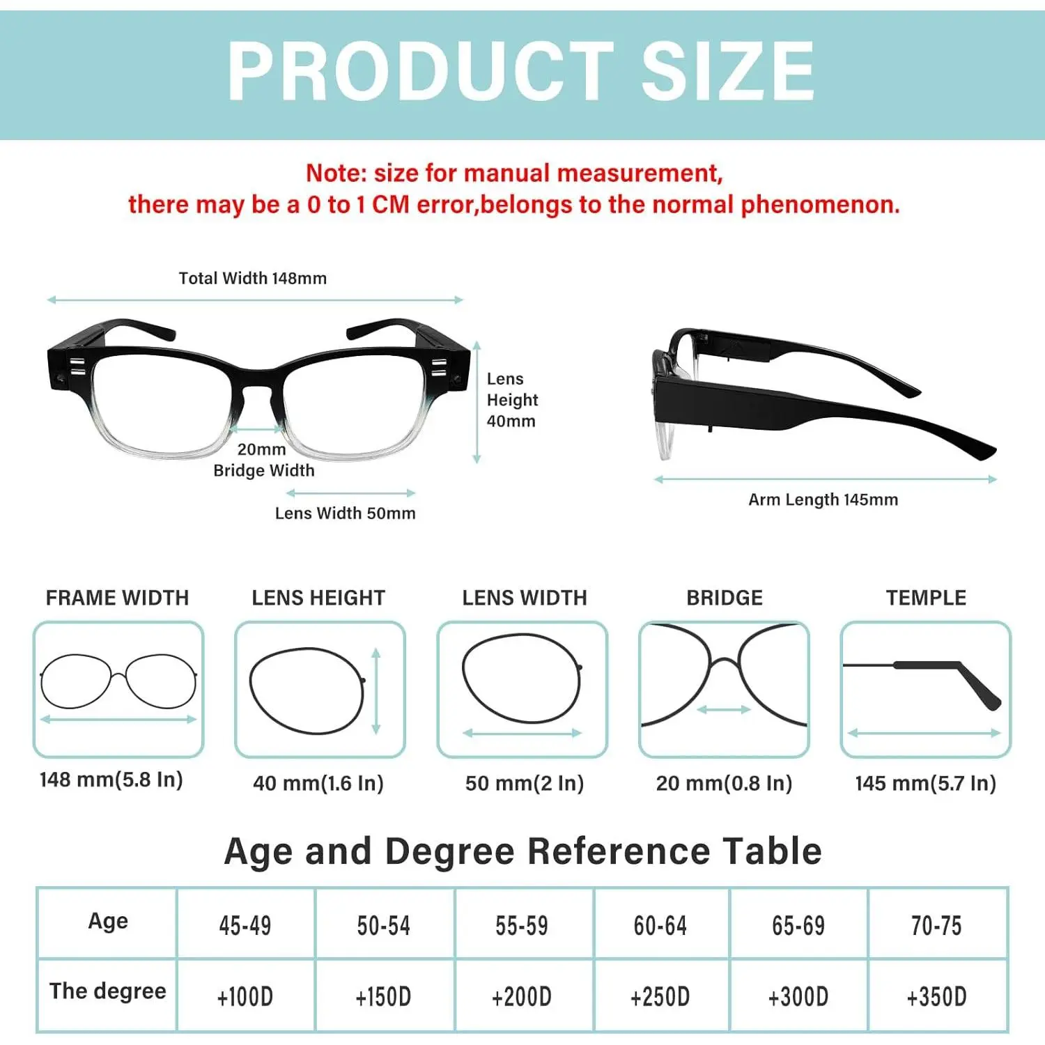 ·[Lighted Reading Glasses for Men/Women] Fashion pattern design reading glasses for women/men and older people.Lens Width:50 mm/2 in, Bridge: 20 mm/0.8 in, Arm Length: 145 mm/5.7 in, Total Frame: 148 mm/5.8 in;Usually 1.0 fit for 45-49year old,1.5 fits 50-54year old,2.0 use for 55-59-year-old,2.5 fits 60-64-year-old,3.0 fit for 65-69-year-old,3.5 fits for 70-74-year-old.There are six reading glasses with different power of lens for you to choose from.