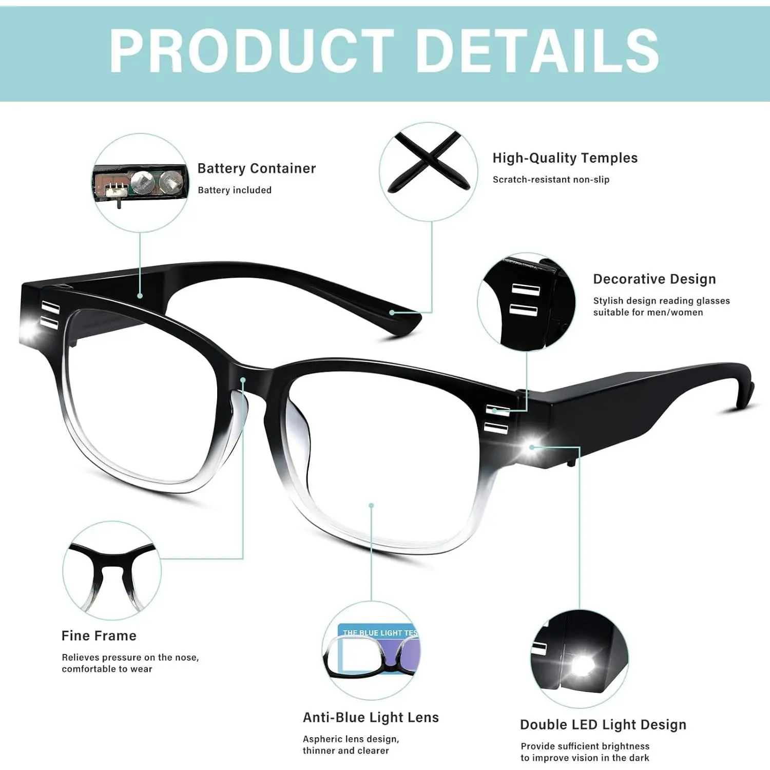 ·[Reading Glasses with Lights and Magnifier] Reading glasses with LED lights, dual battery mode lasting power, give you clear bright vision in the dark. Perfect for use in the car, in bed, on a plane, on a camping trip, or in a place too dark to read without disturbing others around you. A thoughtful gift for parents, friends, relatives, colleagues, and grandparents on birthdays, Thanksgiving, Christmas, Father's Day, Mother's Day, or other special holidays.