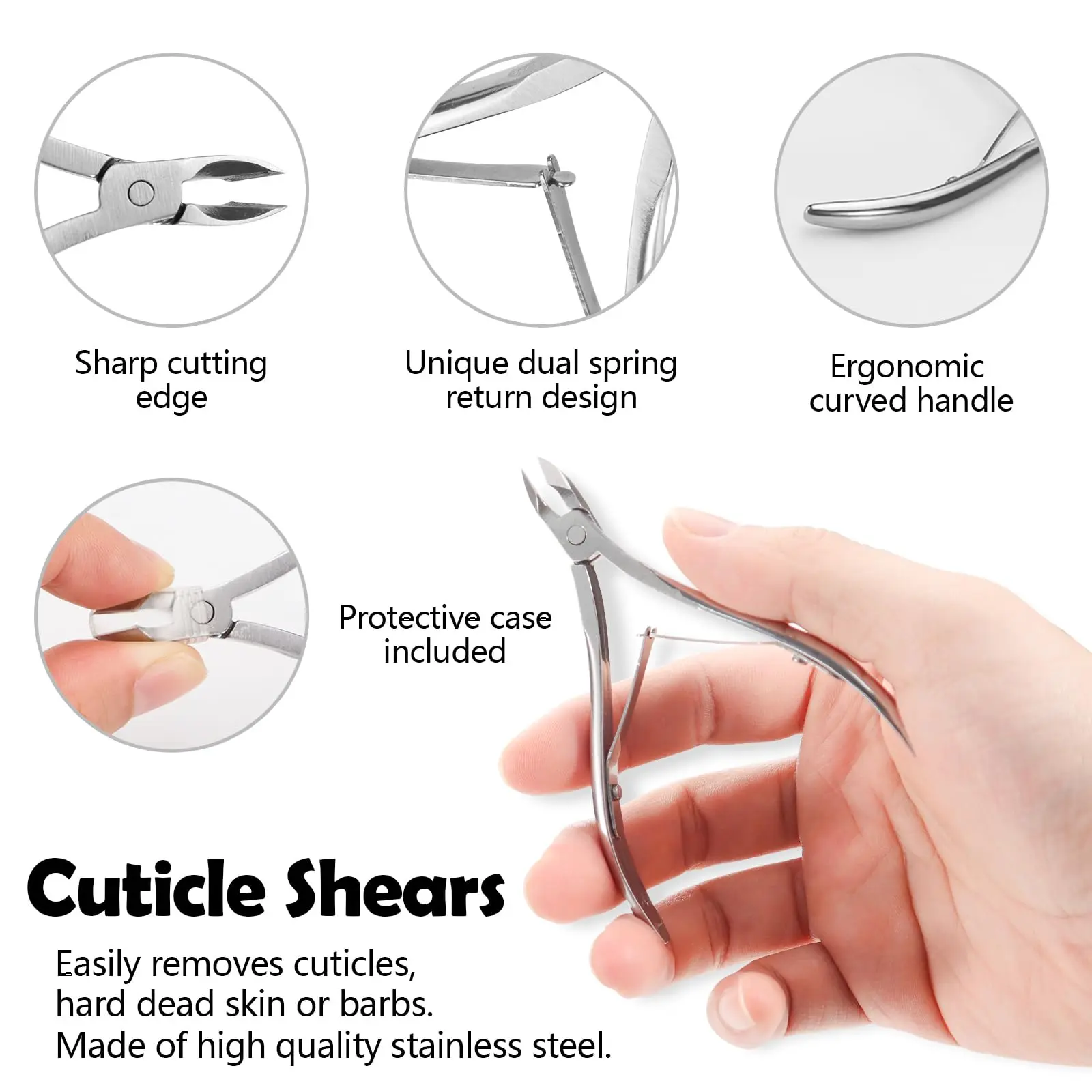 ·【Sharp Jaw and Double Springs】The angled cutting edge is sharp enough to cut off dead skin barbs easily and cleanly without pulling. Built-in double springs can make our cuticle clippers more effortless and flexible. The curved handle is ergonomic and easy to operate.
