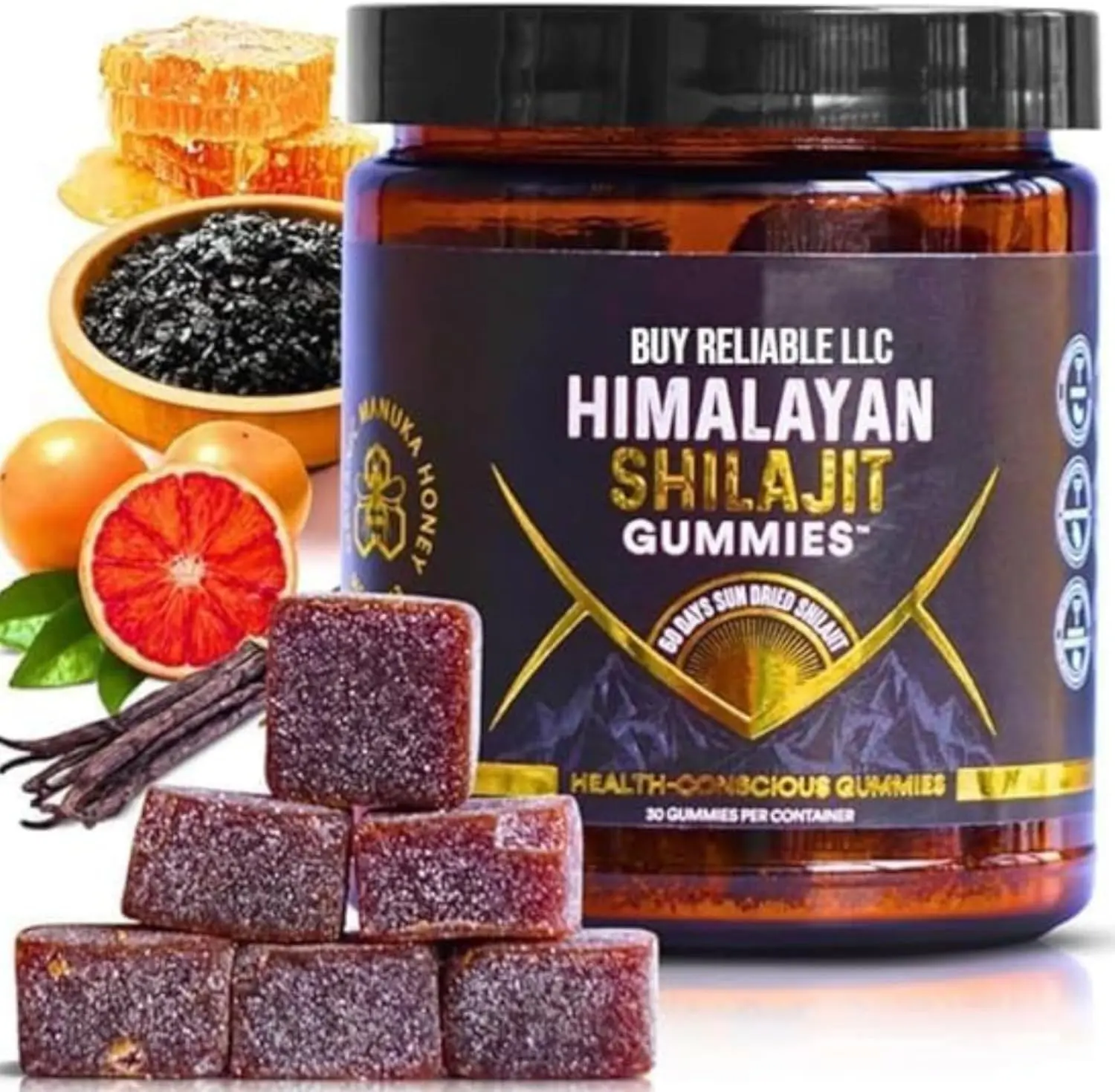 BUY RELIABLE LLC 30 Himalayan Shilajit Gummies offer a natural energy boost, immune system support, and anti-aging benefits. Perfect for adults seeking a natural energy supplement, those enhancing their immune system, and individuals interested in anti-aging support. This gold-grade shilajit resin product is a high-quality choice for your wellness needs.