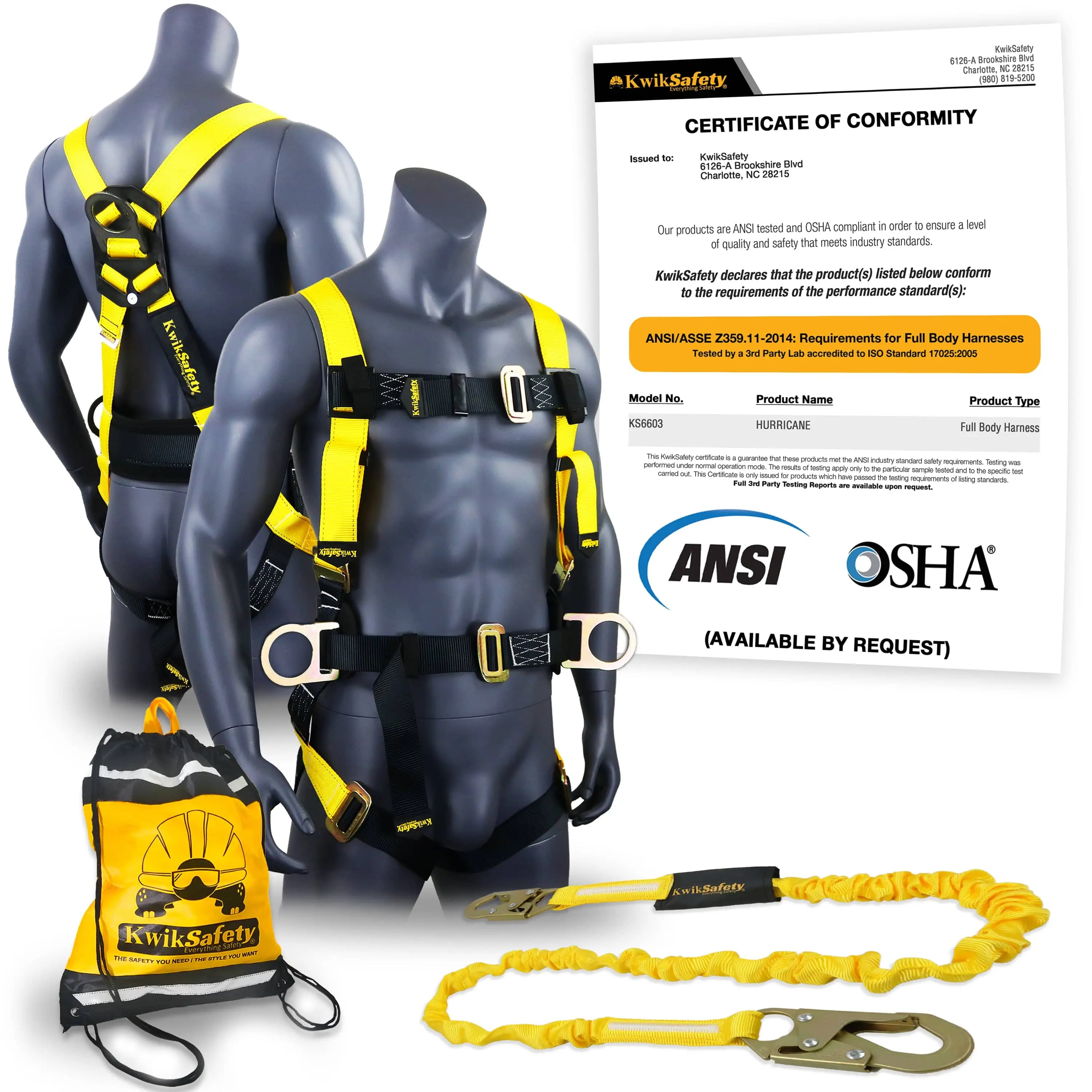 Introducing the KwikSafety HURRICANE Safety Harness, model number KS6603. This comprehensive fall arrest harness is designed to provide reliable protection and support for your safety needs.