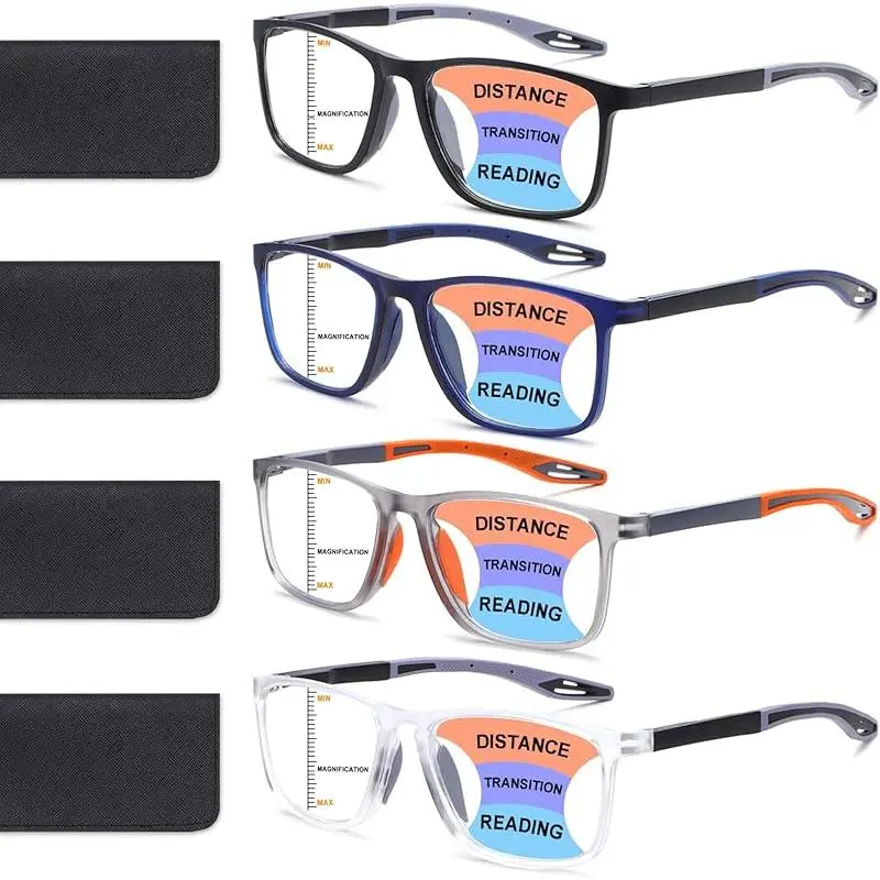 ·[Multiple Double Colored]: Double colors come in one progressive reading glasses, This set includes 4 sports multifocus glasses, each come with a protective case, 1 eyewear cloch,enough to put them all around the house( by your desk, in your purse, on the nightstand ) so they are always within reach or giving as a gift