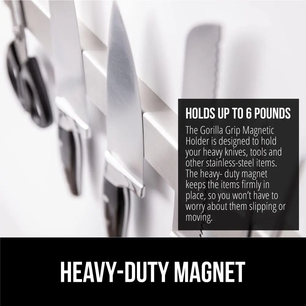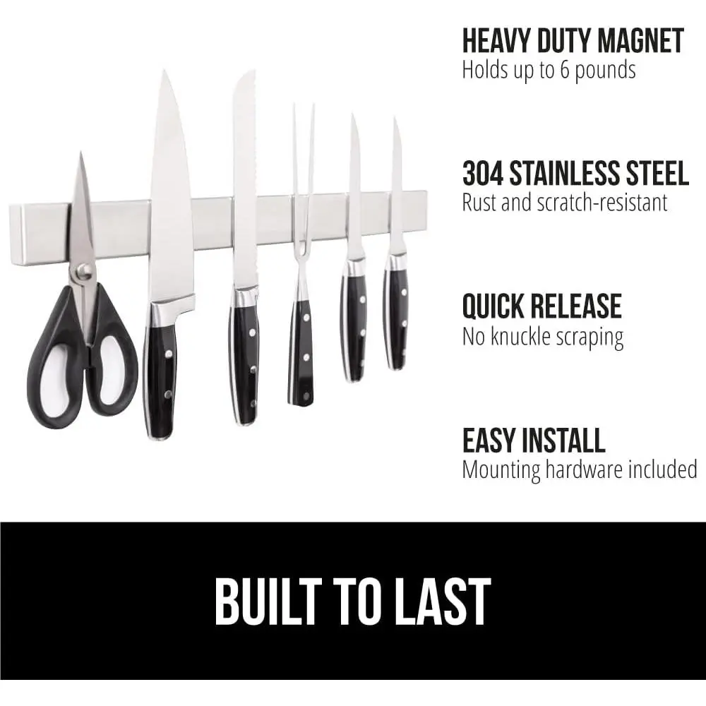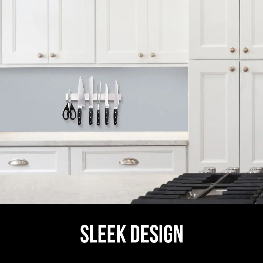 EASY RELEASE: never struggle to remove knives and other objects; the magnetic knife holder allows for easy release to provide seamless usage every time; designed with a .6 inch clearance between the knives and the wall to help prevent knuckle scraping when reaching for items