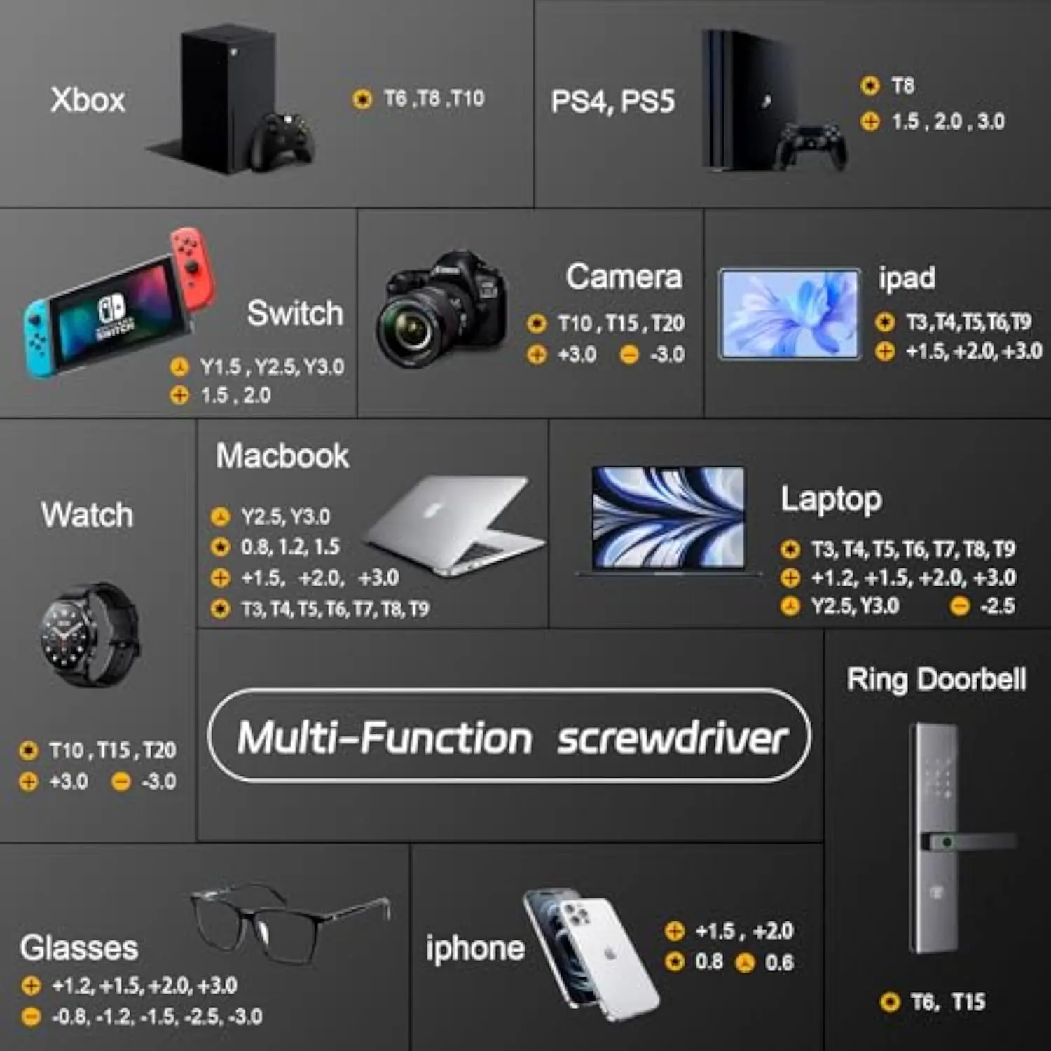 ·【32-In-1 Precision Screwdriver Set】 Includes: Philips PH000 (+1.2) PH000 (+1.5) PH00 (+2.0) PH0 (+3.0); Flathead -0.8 -1.2 -1.5 -2.5 -3.0; Torx T1 T2 T3 T4 T5; Torx Security TR6 TR7 TR8 TR9 TR10 TR15; Tri-point Y000 (Y0.6) Y00 (Y1.5) Y0 (Y2.5) Y1 (Y3.0);Pentalobe P2(0.8) P5(1.2) P6( 1.5); Hex H1.5 H2.0 H2.5 H3.0; MID 2.5.