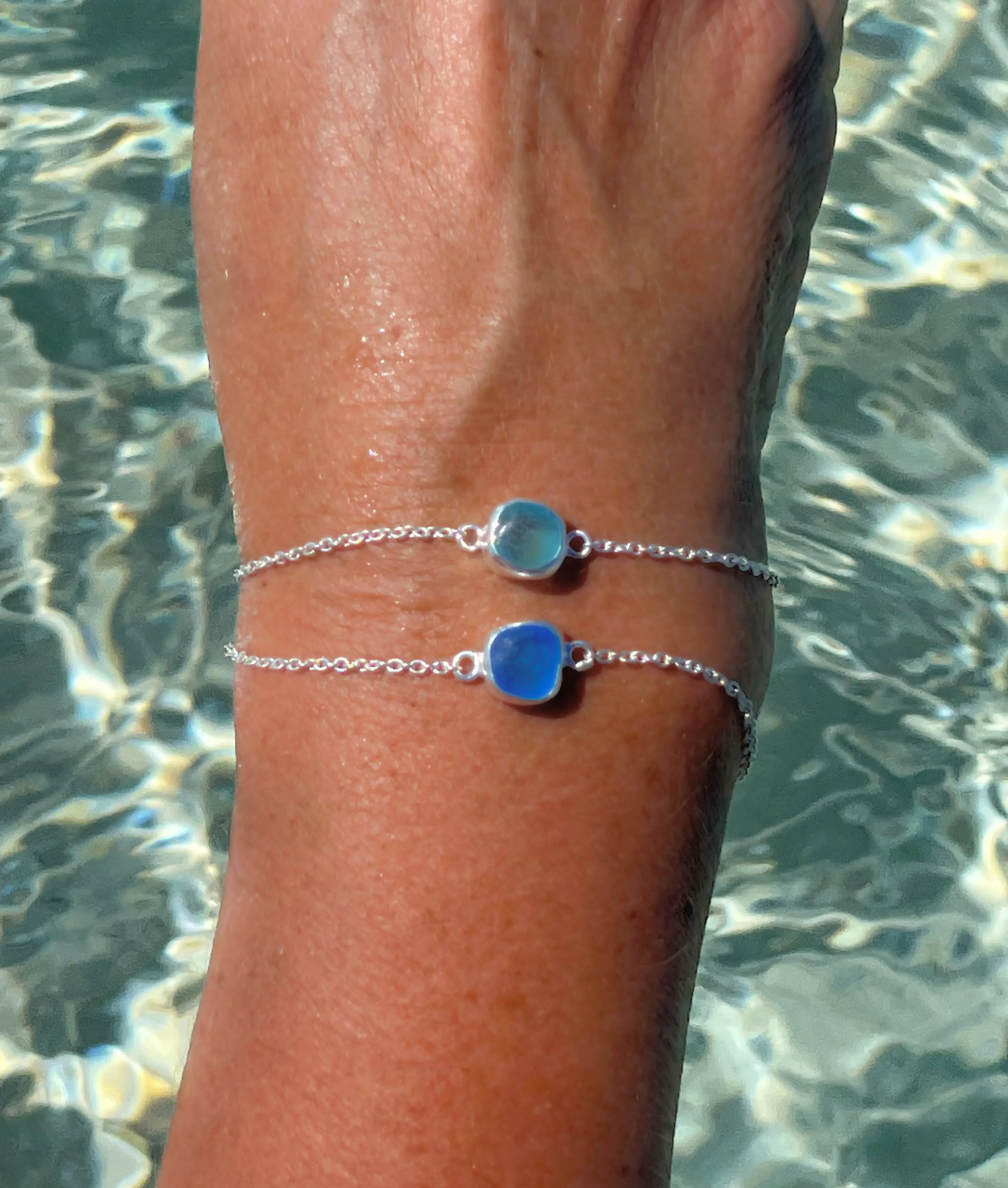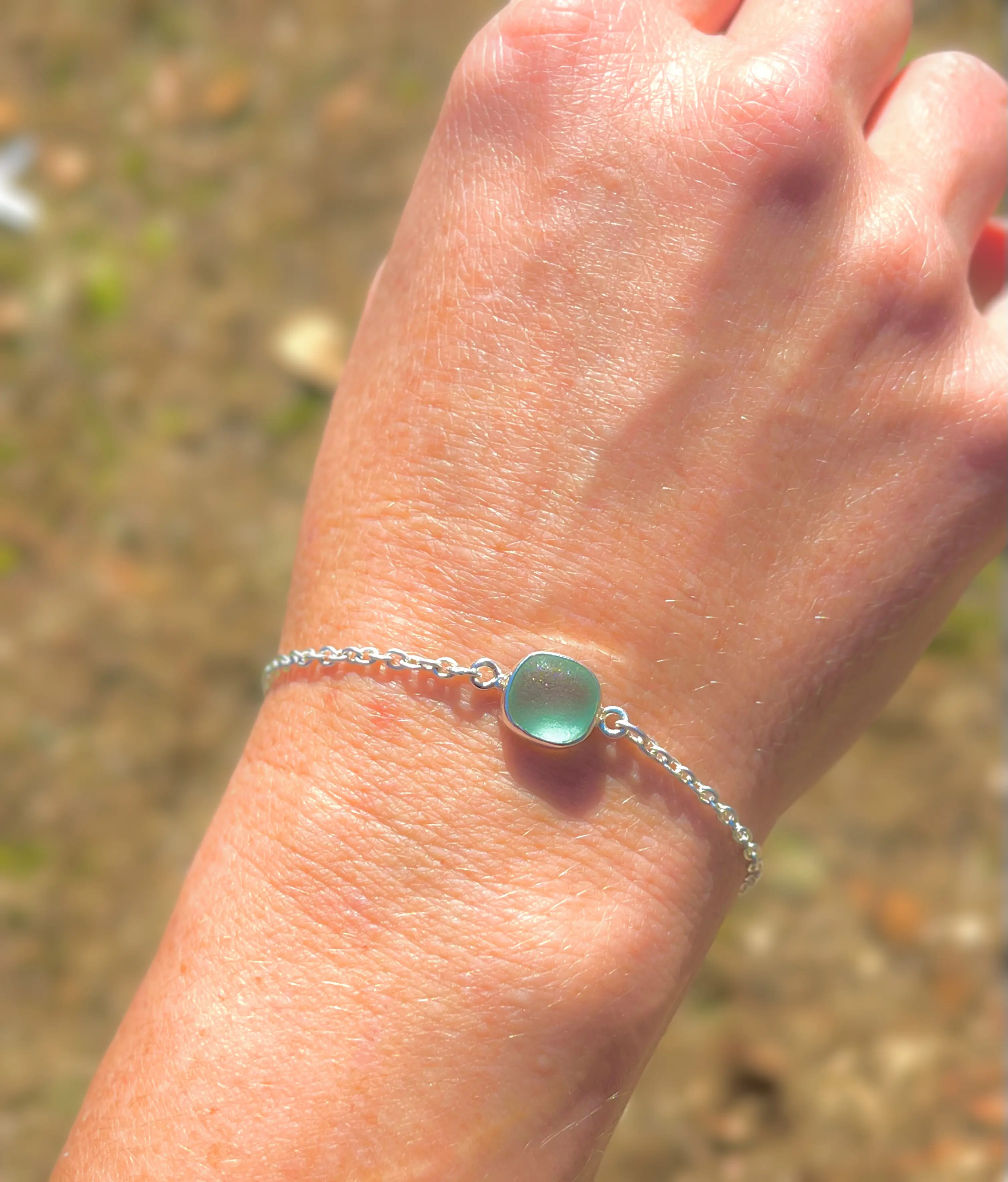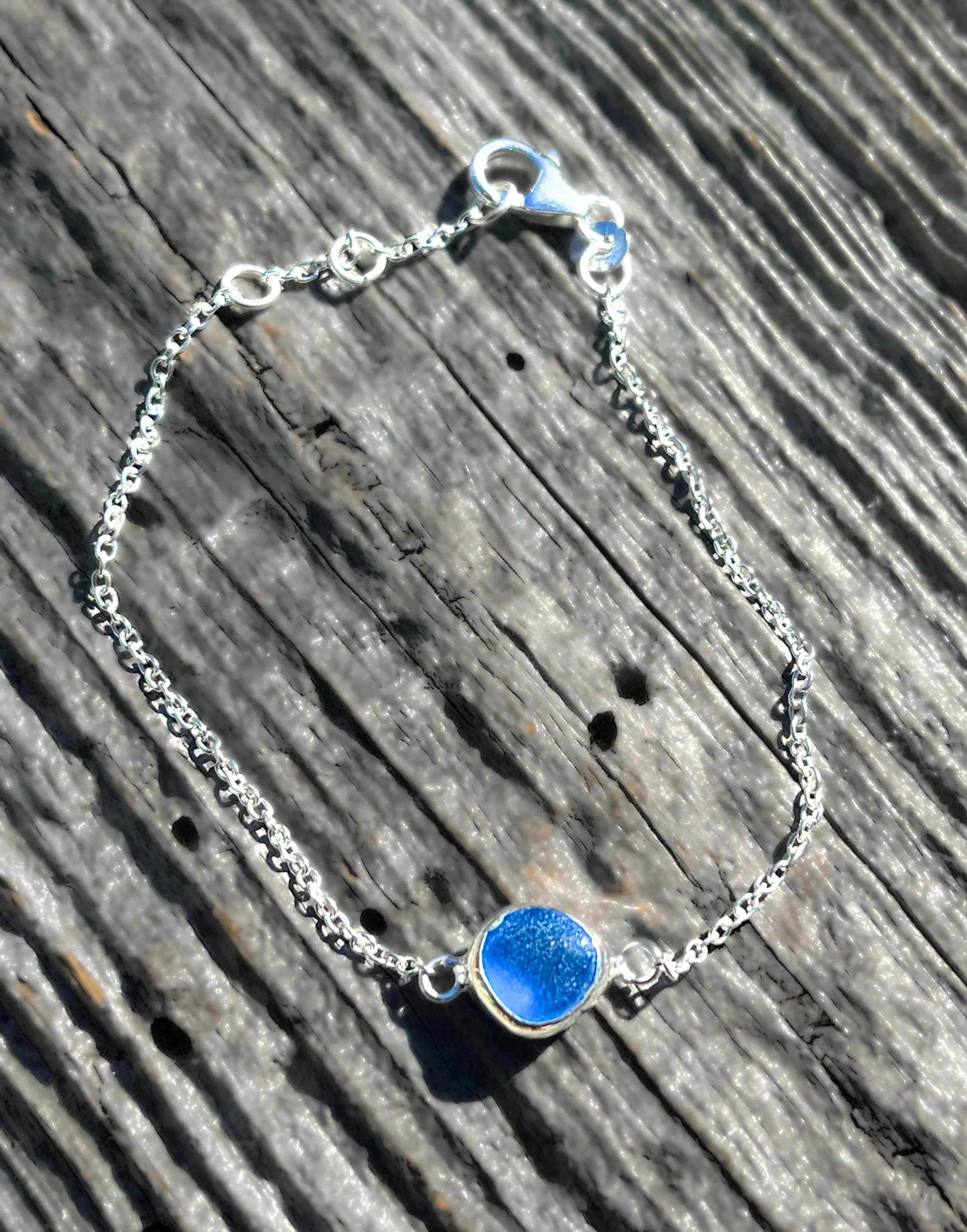 Dainty Sterling Silver Sea Glass Bracelet in Sea Foam Green (Coke Bottle), Cobalt Blue Teal Green or Aquamarine Blue. The petite sea glass pendant measures about 9mm-12mm and set in a sterling silver bezel. The chain is made of sterling silver and is a dainty link chain with a lobster clasp.