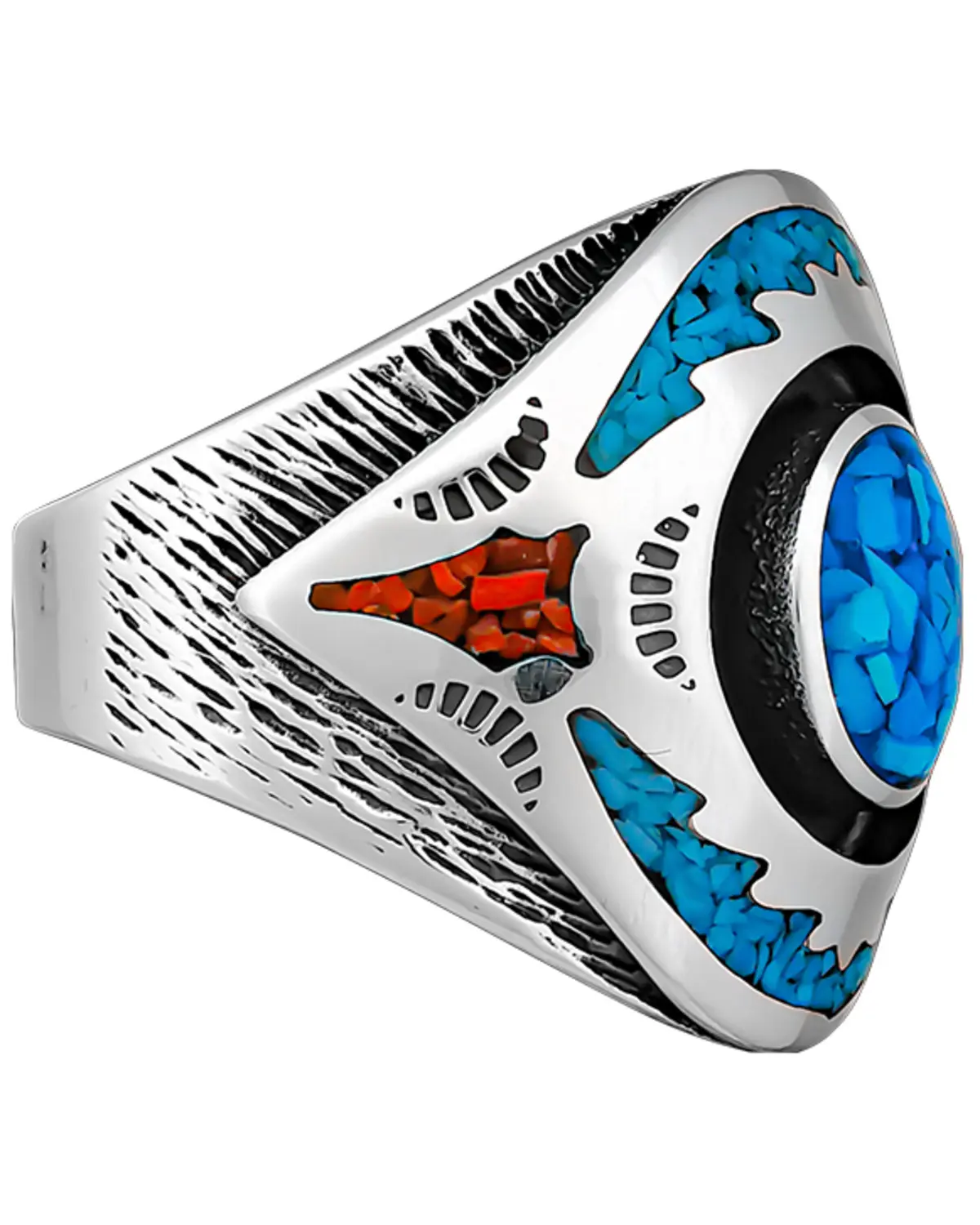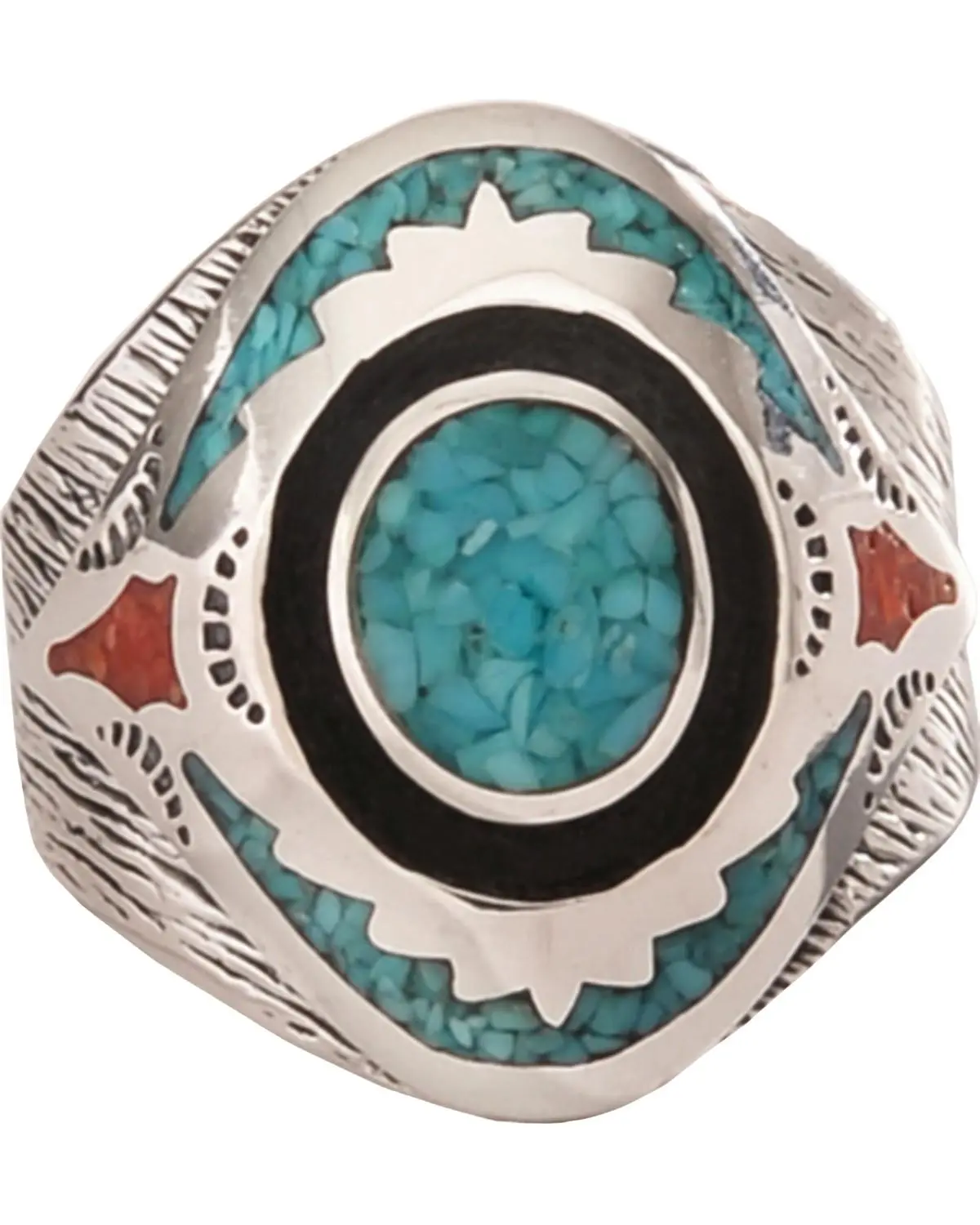 92.5 sterling silver. Southwestern design. Black resin and etichings. Turquoise and coral chips. Turquoise is believed to bring good luck and protect against evil. Corals are known to be calming and soothing. Sizes 7-15. Made in the USA with globally sourced materials.