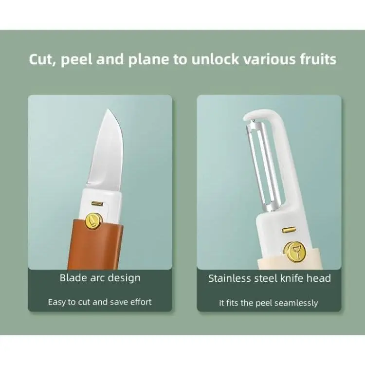 2 in 1 fruit knife is made of high quality 420 stainless steel, durable, not easy to rust, double-sided blade cleaning is convenient and quick. Curved knife back design to reduce damage, the knife body is smooth and flat to prevent damage from other.Cutting easily and effortlessly, rounded back is not easy to hand, plus the protection of the sheath, the use of more durable.Stainless steel head, rotating and peeling with ease, seamlessly fits the peel.