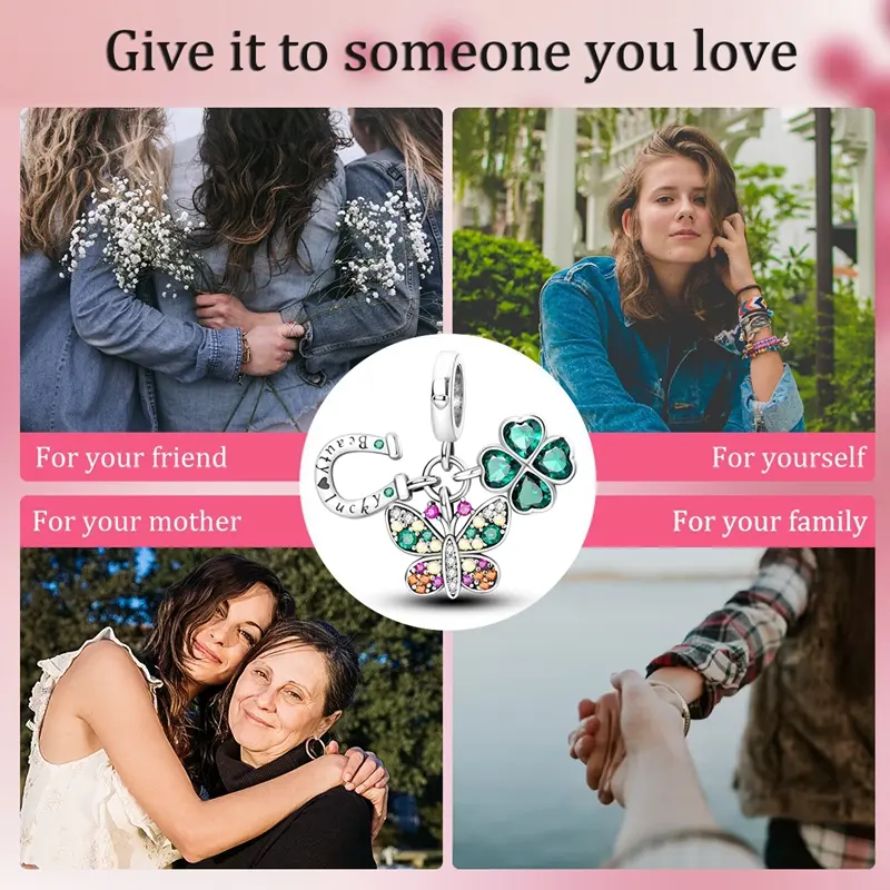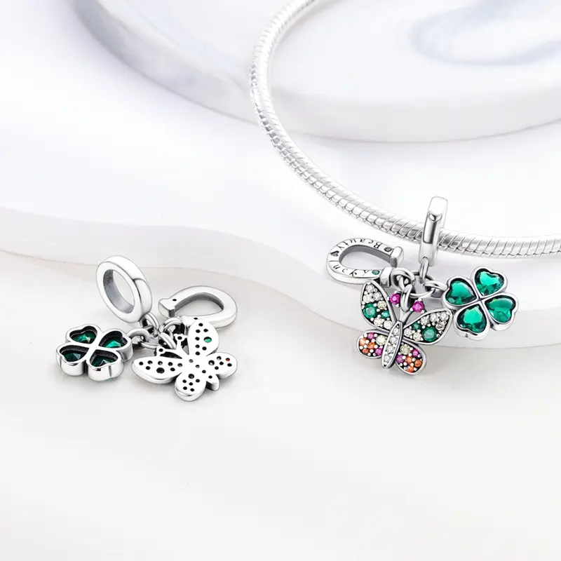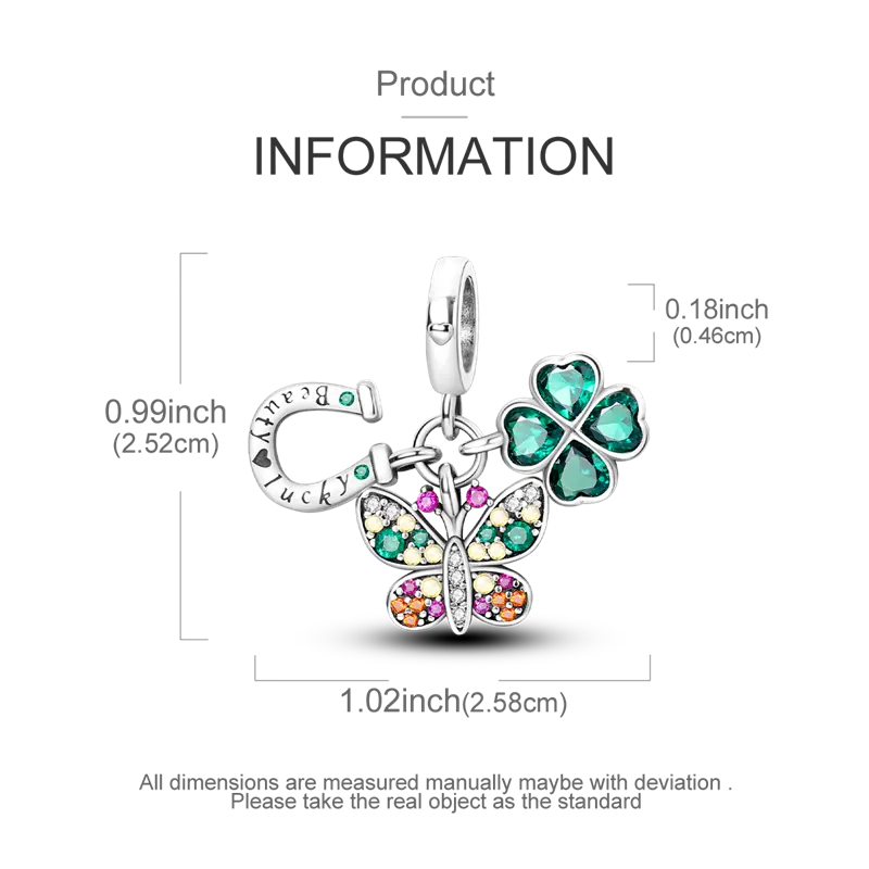 Made of genuine 925Sterling Silver, this pendant features a radiant butterfly, a four-leaf clover and a lucky horseshoe, each element adorned with brightly cut green, yellow and pink zircons for a dazzling effect.