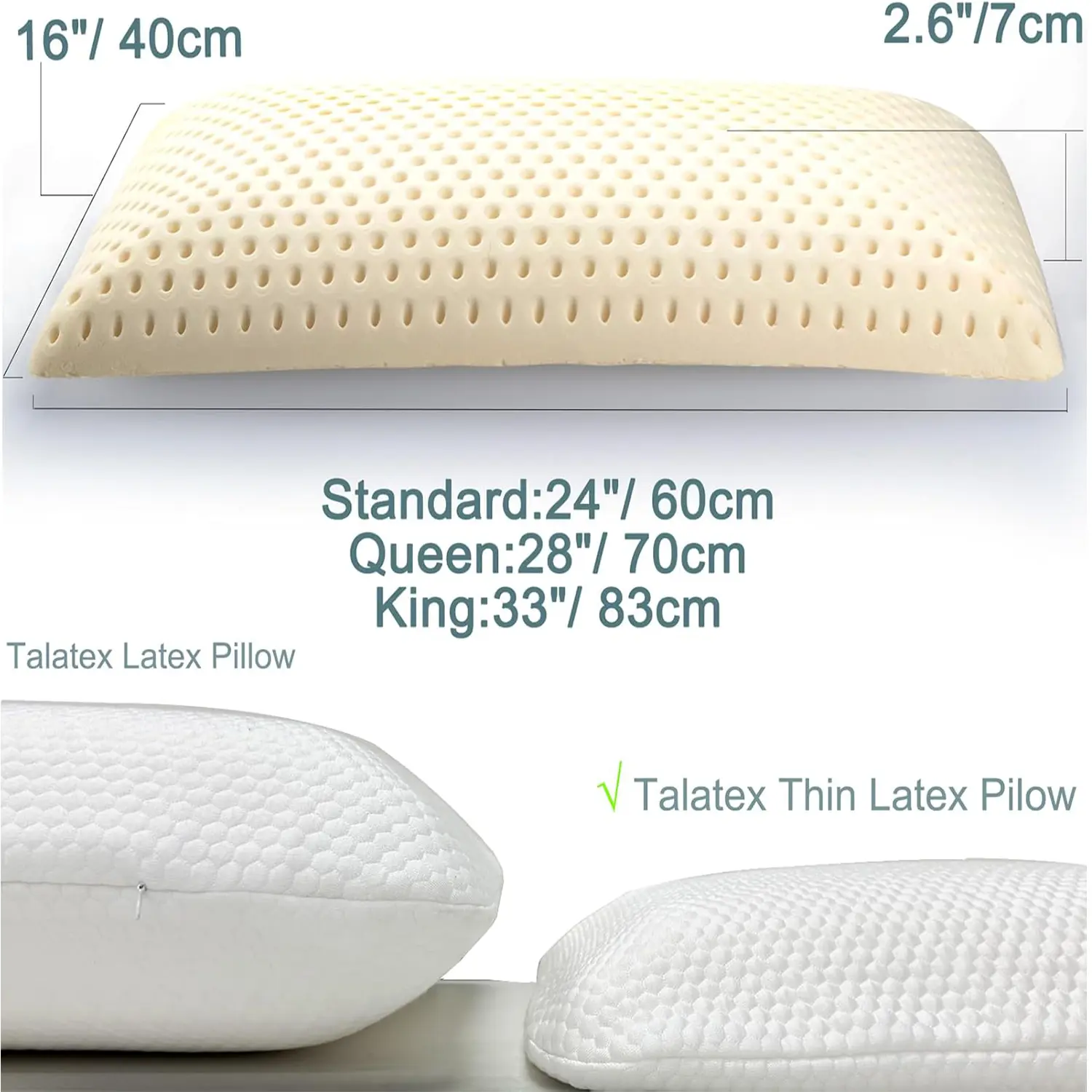 ·[SIZE & ERGONOMIC] - Choose your perfect fit: Standard (24"×16"×2.6" / 60×40×7 cm), Queen (28"×16"×2.6" / 72×40×7 cm), and King (33"×16"×2.6" / 83×40×7 cm). The size may compress after using the pillowcase. Ideal for stomach and back sleepers. It helps to relieve neck pain, frozen shoulder, reduce snoring and insomnia.