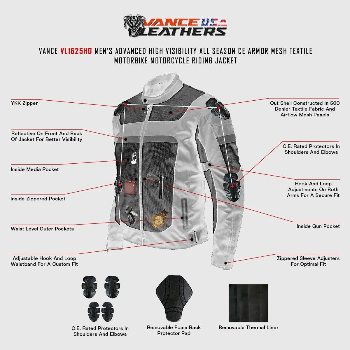 Introducing the Vance VL1625HG Men's Advanced High Visibility All Season CE Armor Mesh Textile Motorbike Motorcycle Riding Jacket, designed to enhance your riding experience with its exceptional features. Crafted with precision and using high-quality materials, this jacket offers durability, comfort, and versatility for motorcycle riders of all ages residing in the USA.